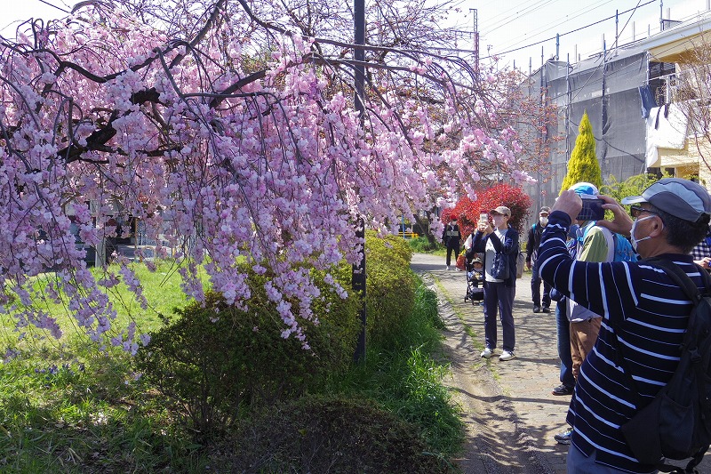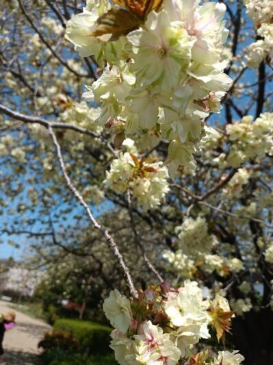 - 低い位置に八重さくらが咲いてる散歩道
