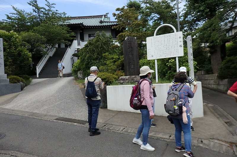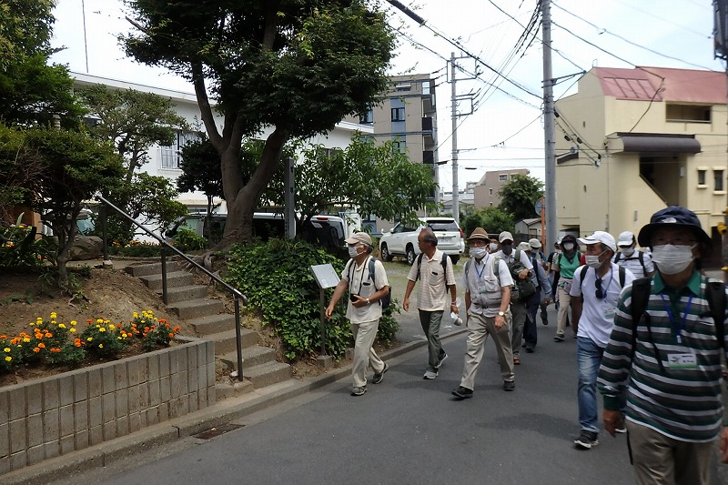 午後の歩きは動物園入口信号を横断し県立横浜旭陵高等学校前から、ふるさと尾根道緑道を歩き今宿東公園入り口で休憩。鶴ヶ峰の住宅街に点在する畠山霊動創建記念の碑、さかさ矢竹の由来、横浜市地域史跡、畠山重忠古戦場跡、首塚(首洗の井戸)などを巡り首塚前で世話役より次回の案内を聞いて13時45分に解散。駅前の商店街を通り相鉄線鶴ヶ峰駅で無事終了した。