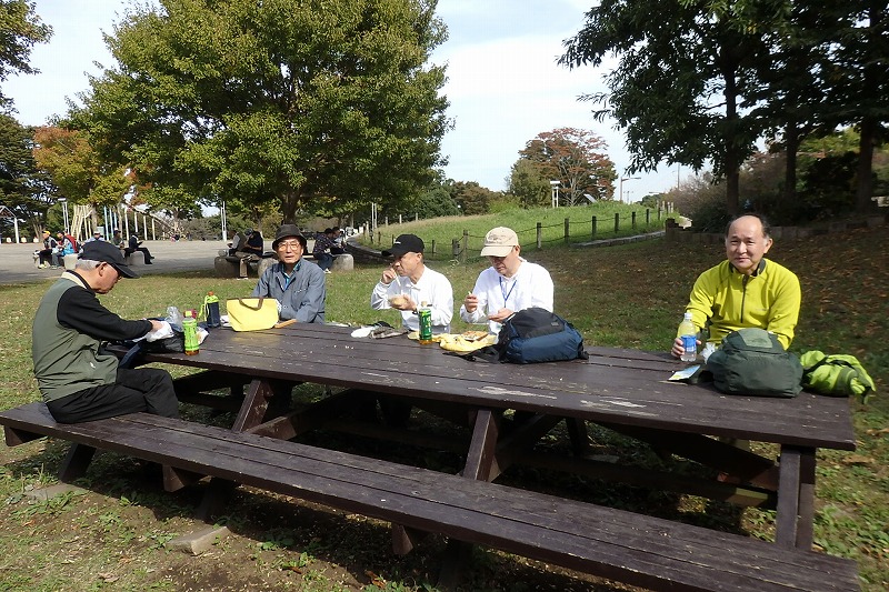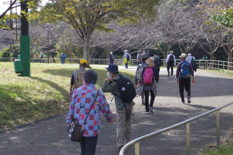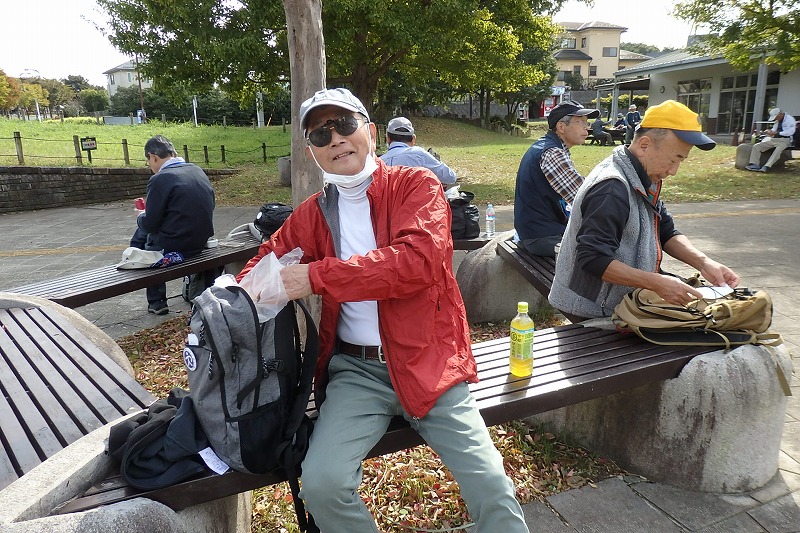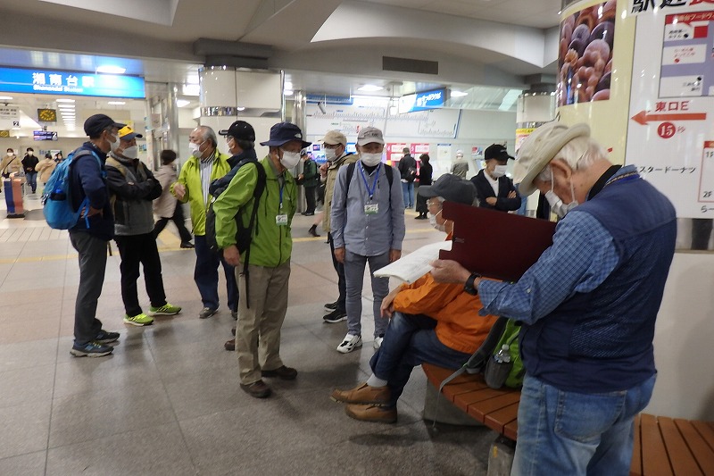 小田急線湘南台駅改札前に午前10時集合。受付を済ませて世話役の挨拶、コース説明、新会員3名の自己紹介を聞いてスタート。地上のバス停前を通り円行公園から川沿いの散策道を歩き桐ケ谷からバス通りに出て相原公園前を通り秋葉台公園で休憩後、秋葉台中学校前、宝泉寺前、芹沢スポーツ広場前を通り茅ヶ崎里山公園にはいりました。栗の木広場、多目的広場、風の谷を散策しながら湘南の丘広場で休憩と昼食。