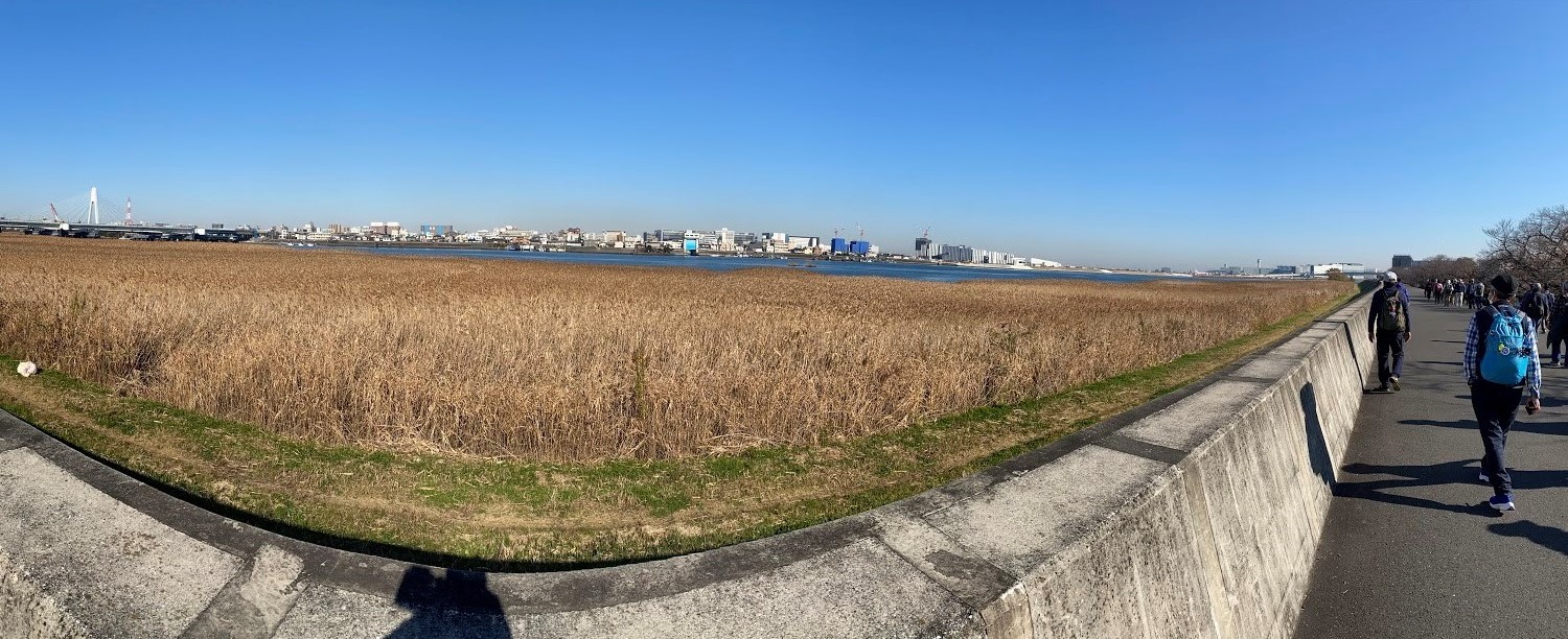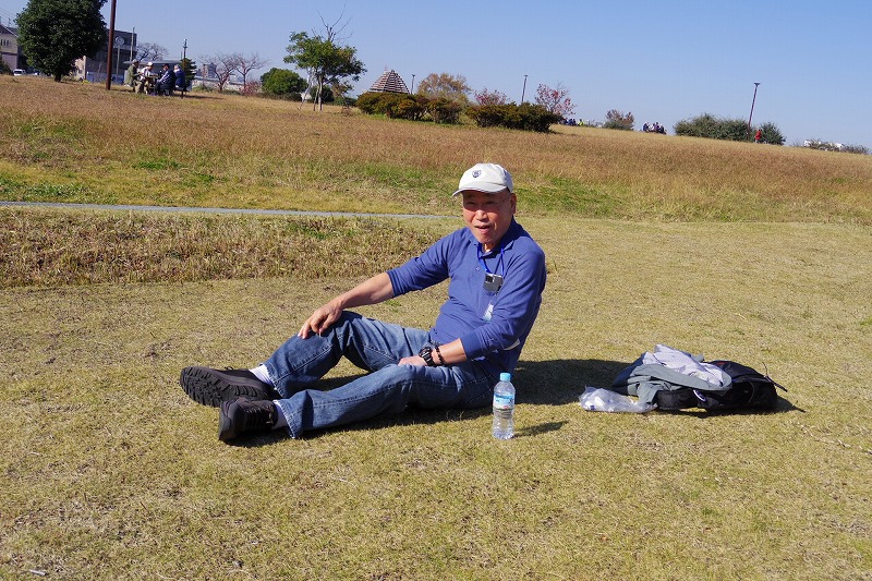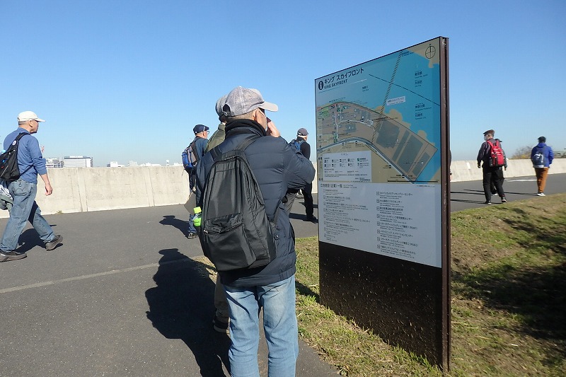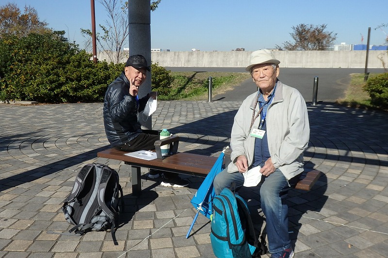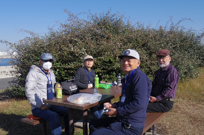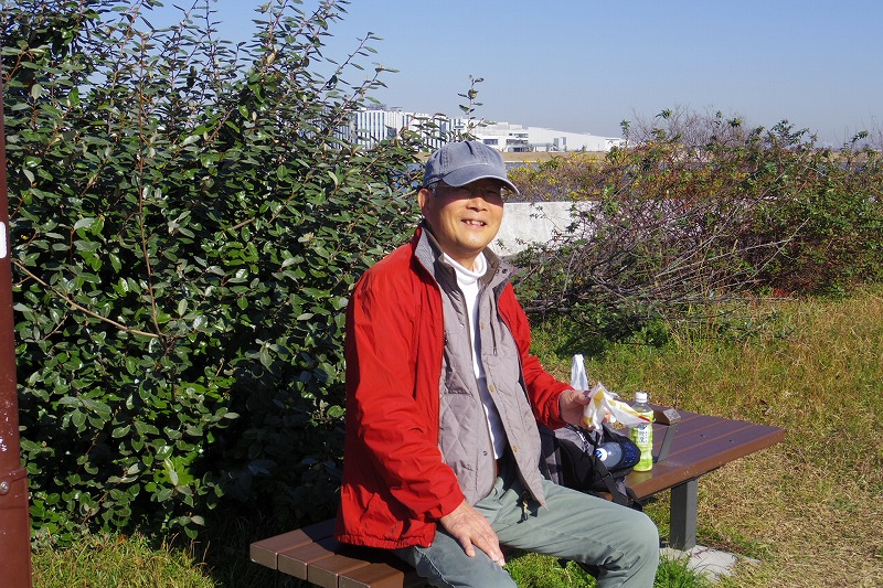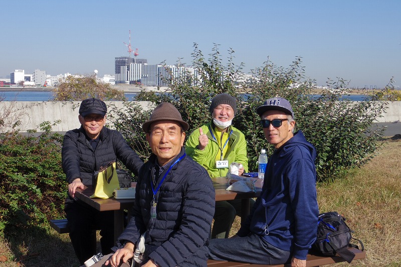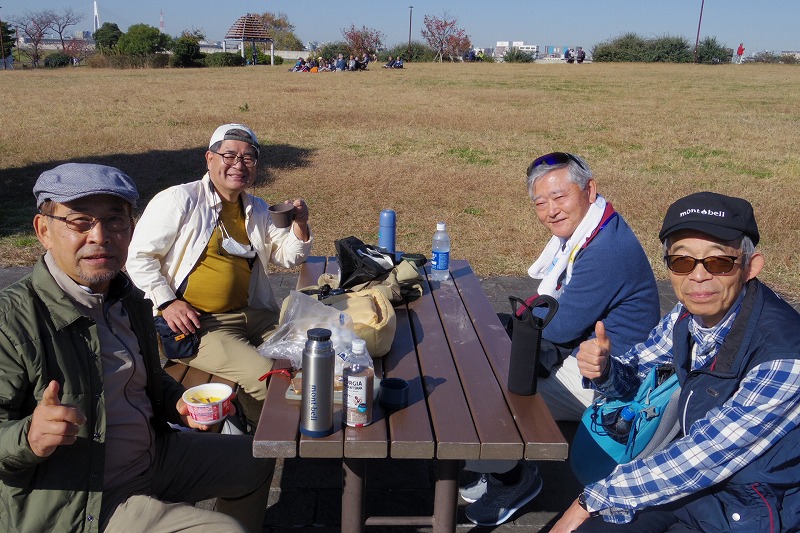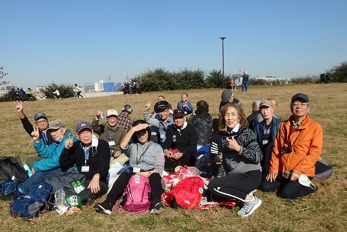 休憩と水分補給をして、再び土手を歩き慶応大学手前の殿町第二公園で少し早い昼食と休憩。記念写真を撮って午後の歩きを開始。