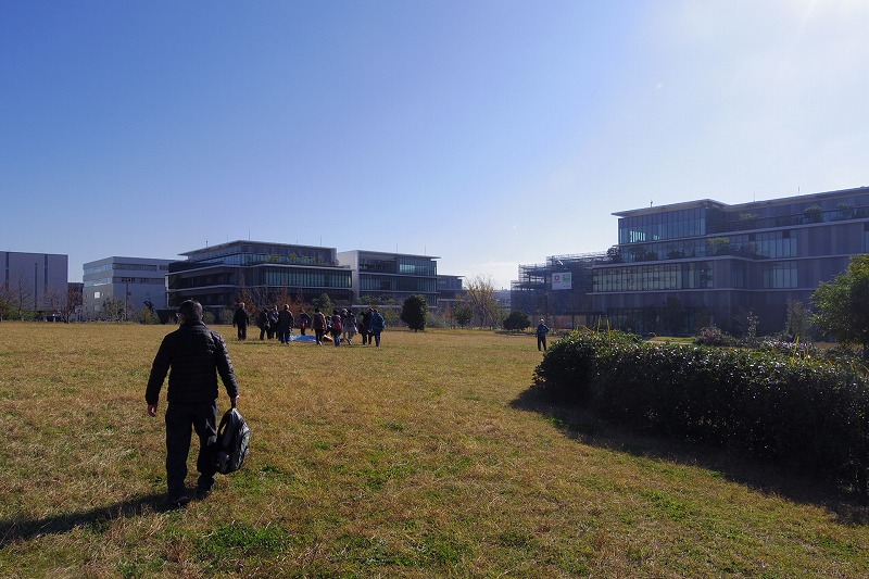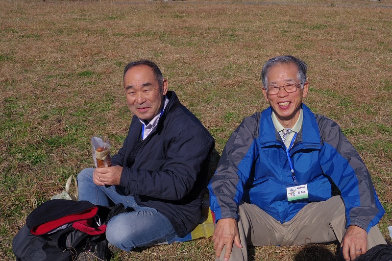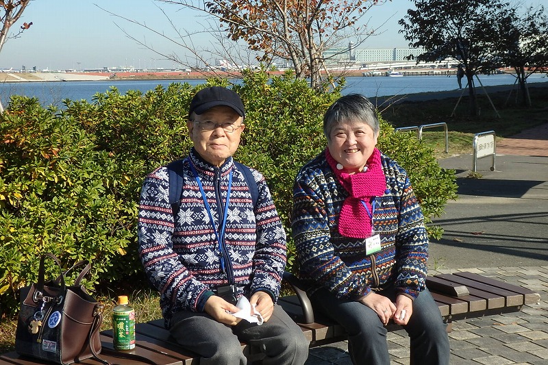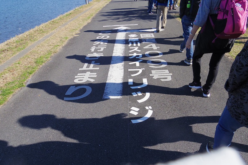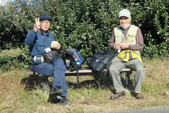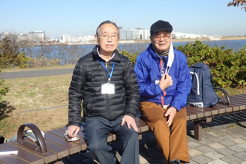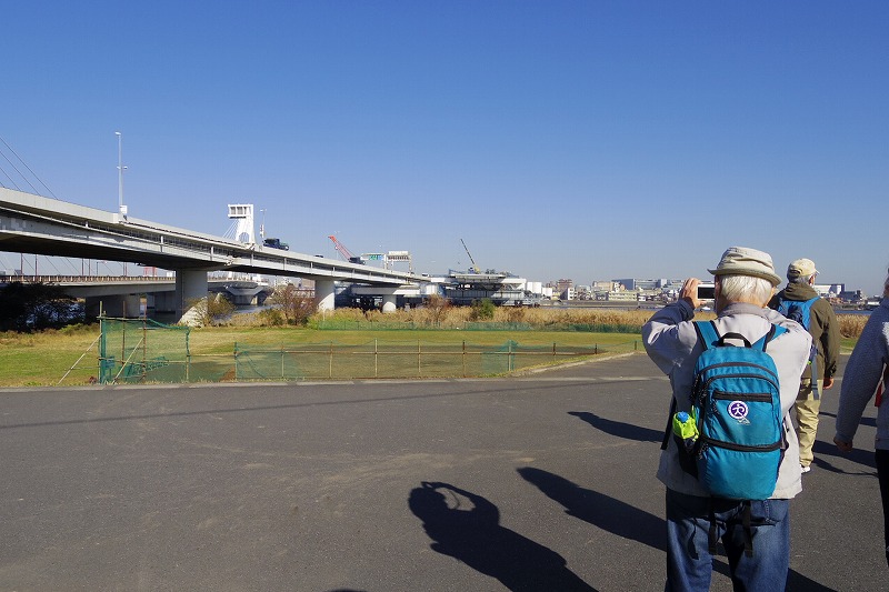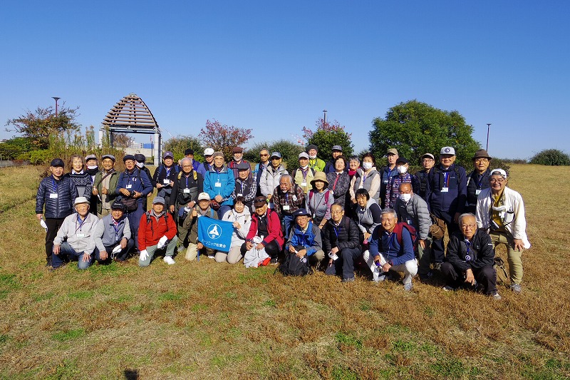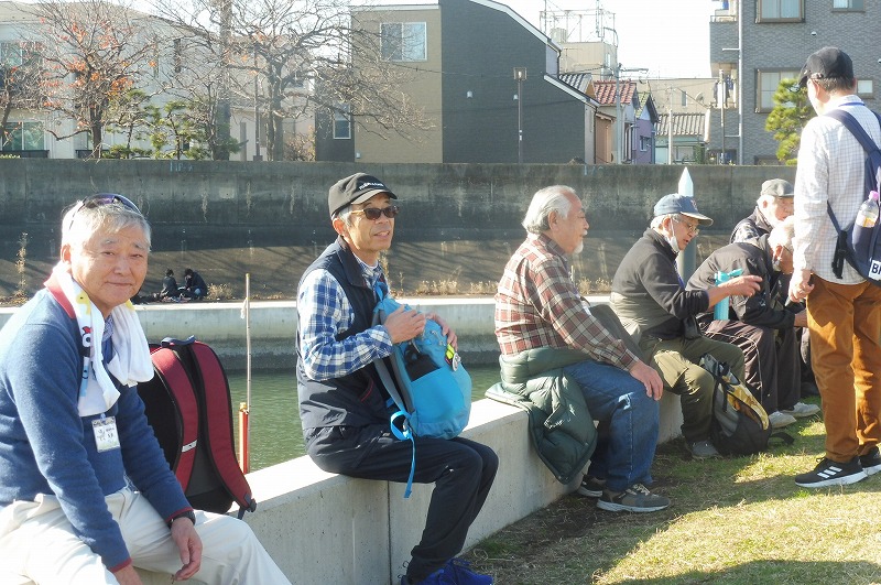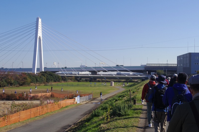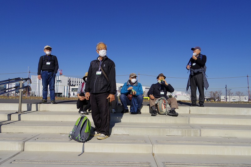 休憩と水分補給をして、再び土手を歩き慶応大学手前の殿町第二公園で少し早い昼食と休憩。記念写真を撮って午後の歩きを開始。