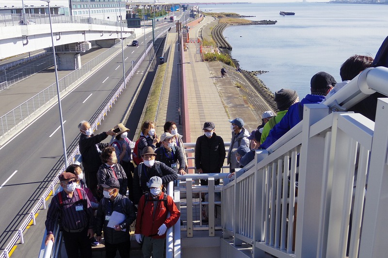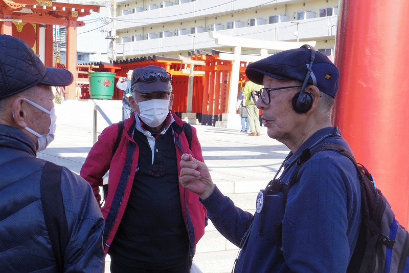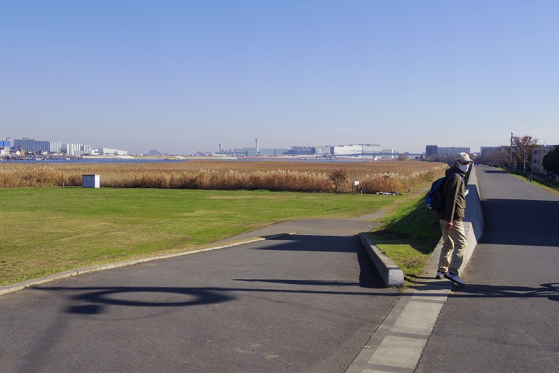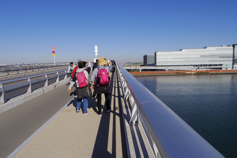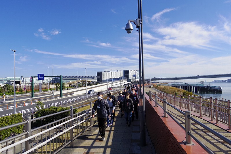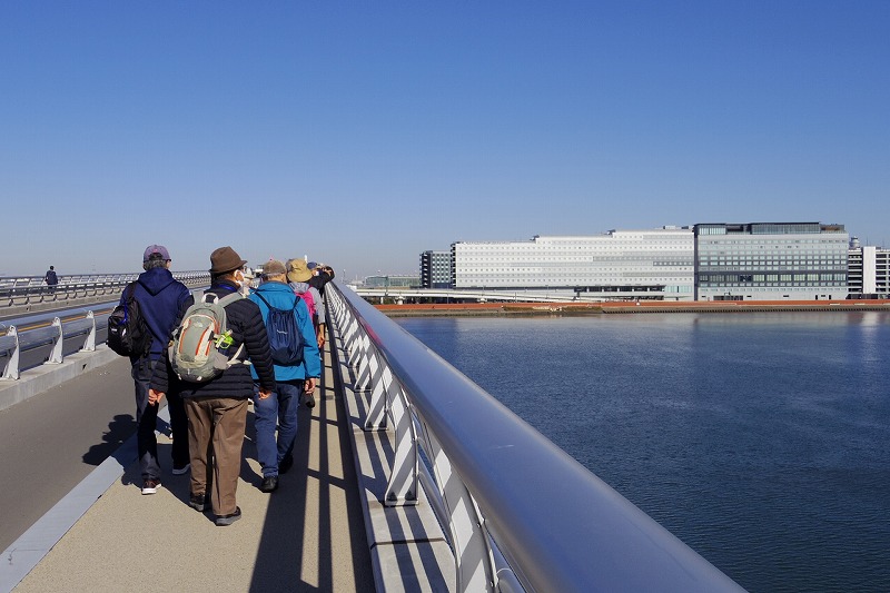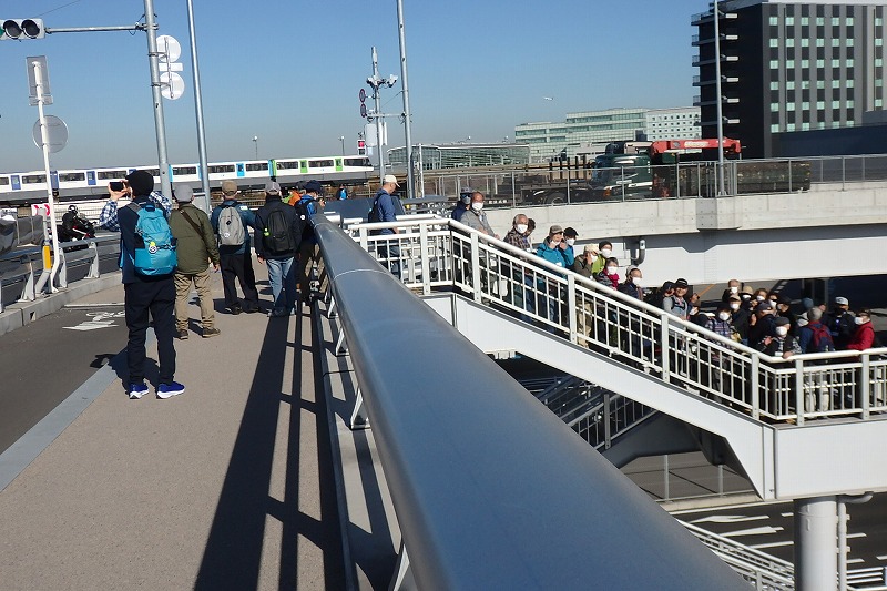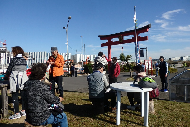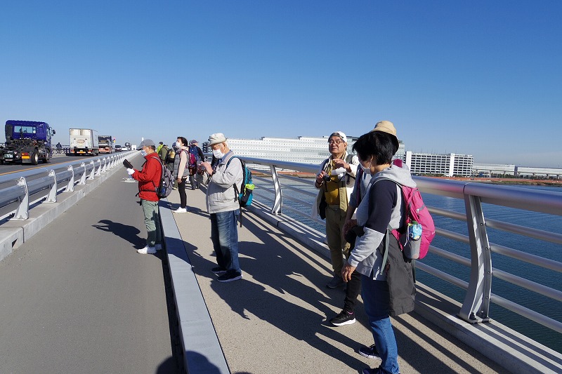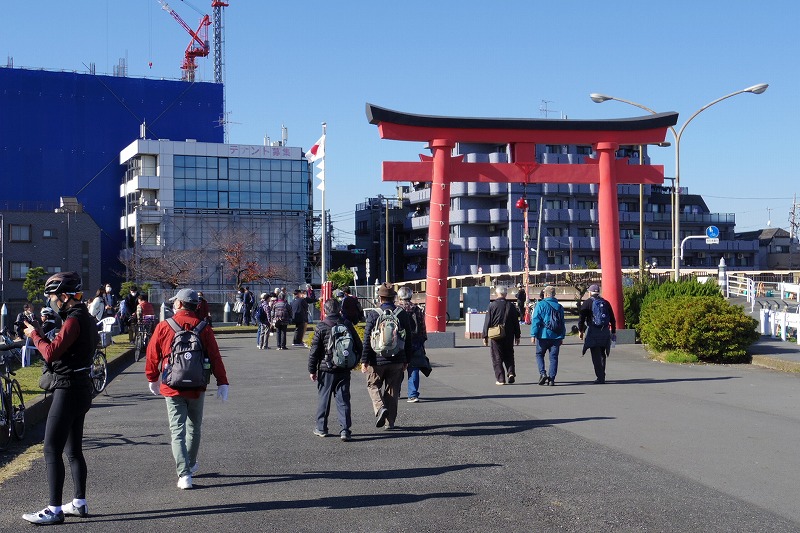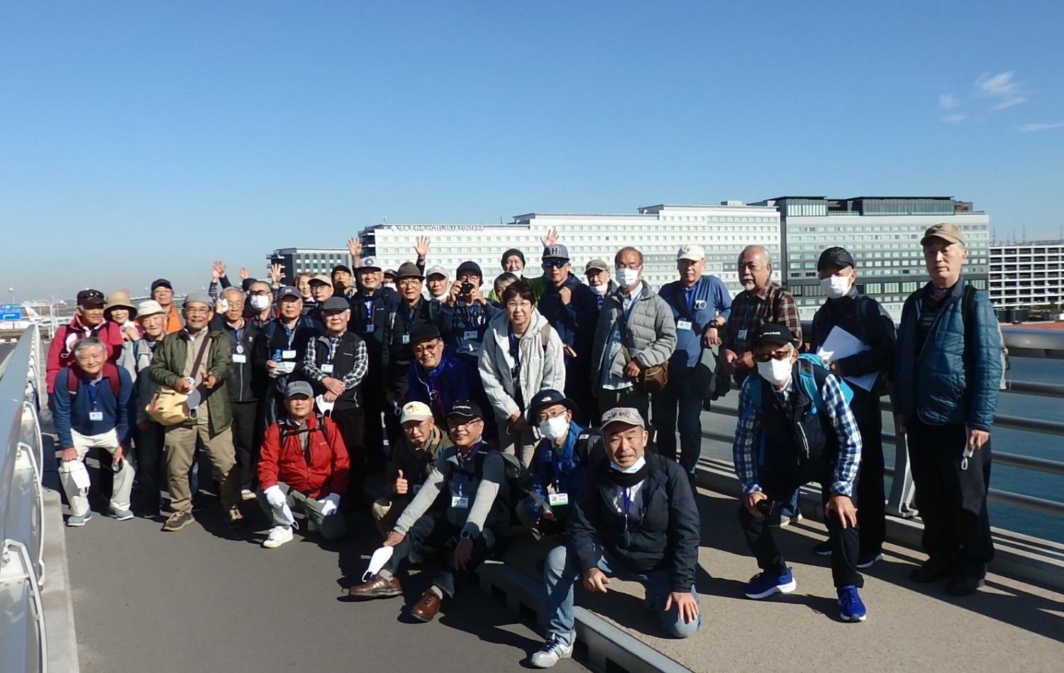 右手の羽田空港D滑走路に離着陸する飛行機、左手に遠く丹沢の山々(富士山も霞の中でしたが見えました)。中央に東京スカイツリーとその左に東京タワーを見ることができ、会員それぞれが素敵な風景をスマホにおさめていました。スカイブリッジを渡り終えたところの階段で東京モノレールをバックに集合写真も撮りました。その後、東京都大田区側の土手を歩いて穴守神社の大鳥居手前で記念写真。海老取川の並びを歩いて穴守稲荷神社に参拝し、少し歩いて穴守稲荷駅前で世話役から次回案内を聞いで13時45分に解散。無事終了しました。