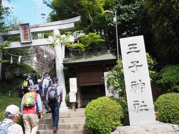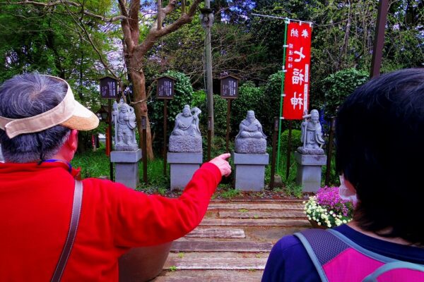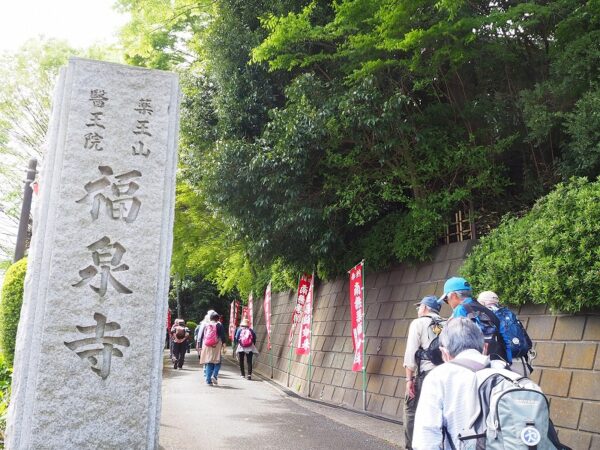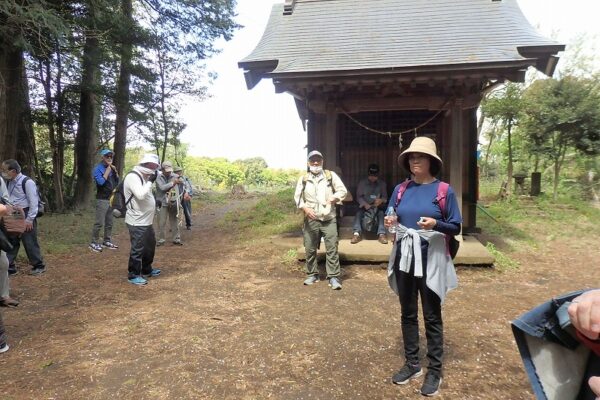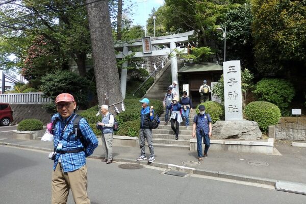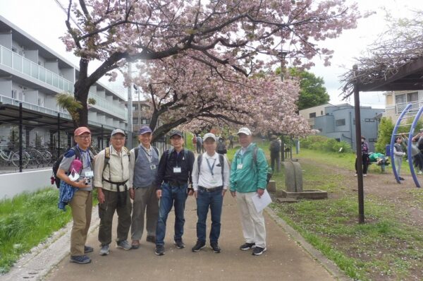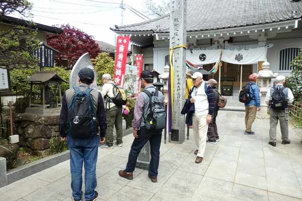 田園都市線つくし野駅改札前に10時集合、受付を済ませ駅前の広場で世話役の挨拶の後に恩田川の桜が散ったために八重桜の道にコース変更を伝えスタートした。森村学園、産能短期大学長津田グランド前から長津田宿市民の森を通り金毘羅神社、戦没者慰霊塔(御野立之趾)田奈村忠魂碑、皇太子殿下御野立之跡を見学して長津田小学校前から旧大山街道に入り、南長津田団地前を通り王子神社に参拝。歩道橋を渡り福原寺で休憩。