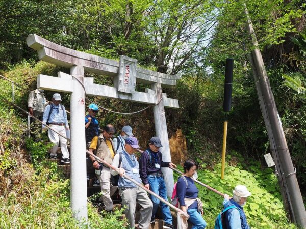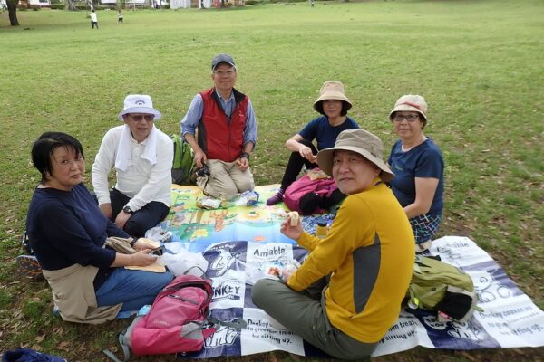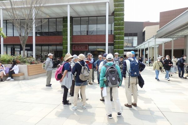 寺裏の天王鶯林を歩き天王社参拝後に急階段の参道を下りフィールドアスレチック横浜つくし野コース横を通り国道246号線の歩道橋を渡り住宅地の中にあるつくし野セントラルパークで昼食と休憩。ここで記念写真を撮り、すずかけ台駅前を通り南町田グランベリーパークに到着。