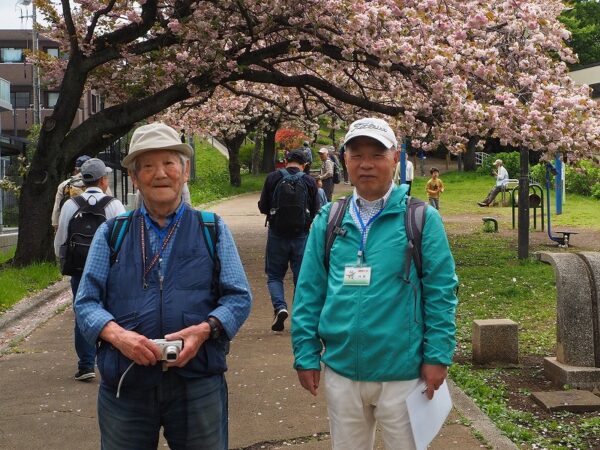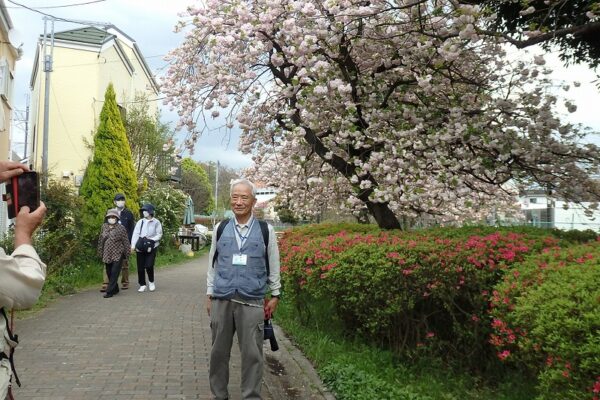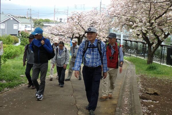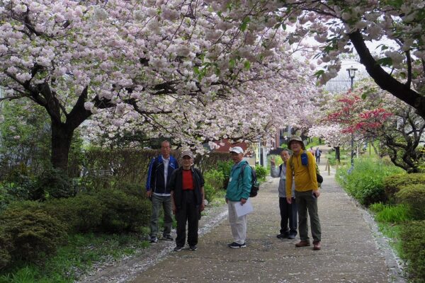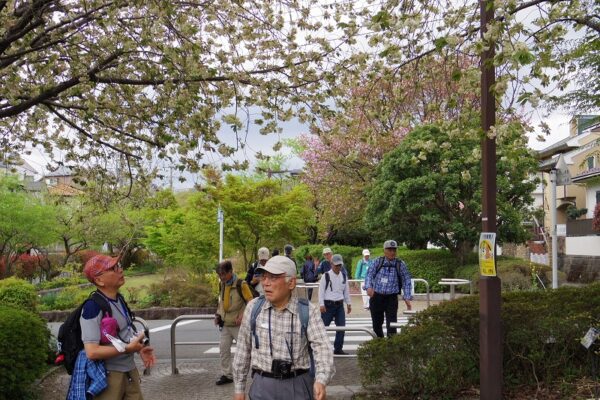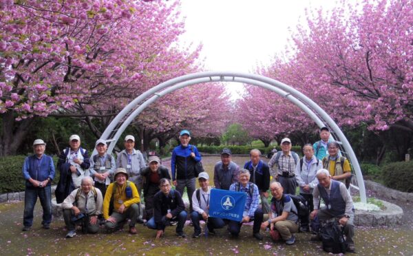 鶴舞公園を通り境川の遊歩道からつきみ野さくらの散歩道に到着。1.7kmも続く満開の八重桜を楽しみました。つきみ野7丁目交差点から住宅地を歩いて田園都市線つきみ野駅に到着。世話役から次回の案内を聞いて13時50分に無事終了し解散した。