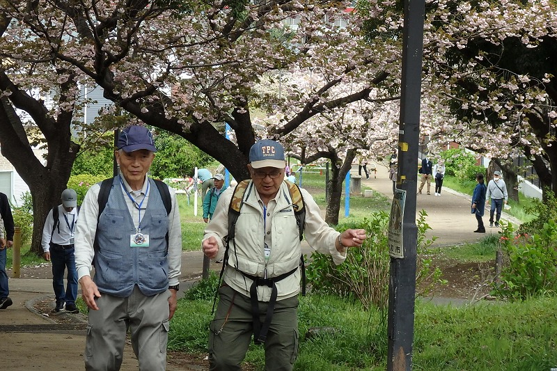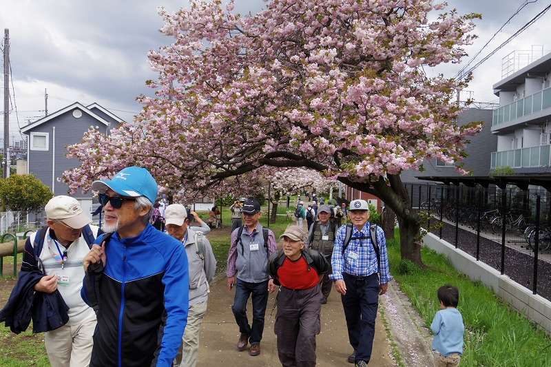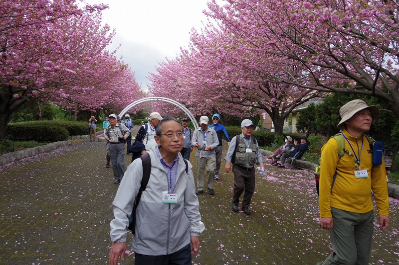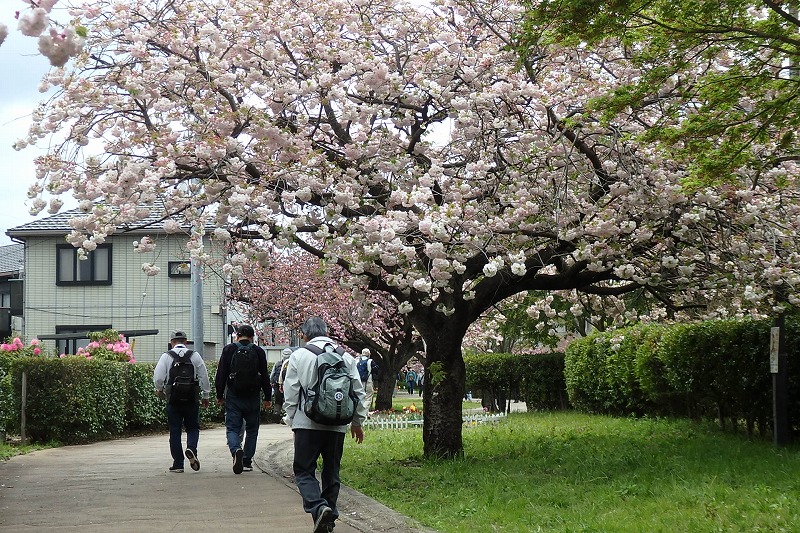 鶴舞公園を通り境川の遊歩道からつきみ野さくらの散歩道に到着。1.7kmも続く満開の八重桜を楽しみました。つきみ野7丁目交差点から住宅地を歩いて田園都市線つきみ野駅に到着。世話役から次回の案内を聞いて13時50分に無事終了し解散した。