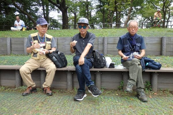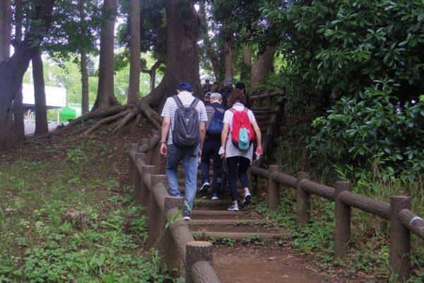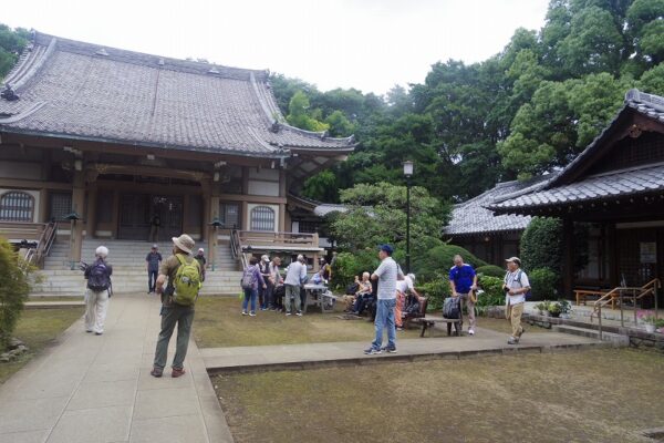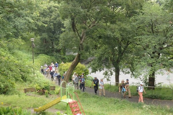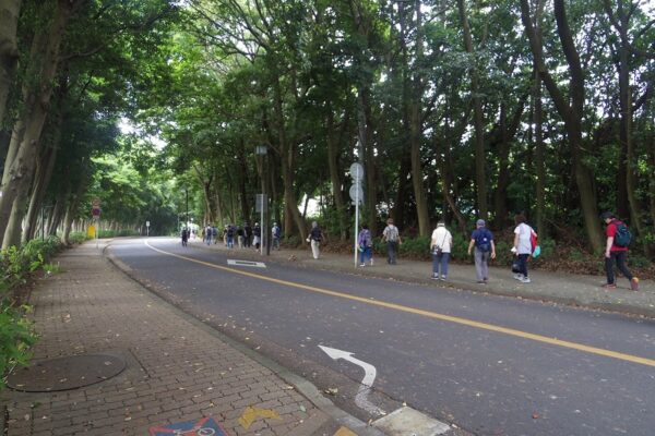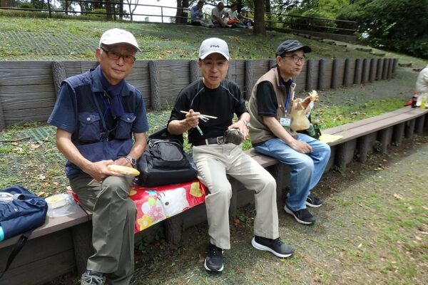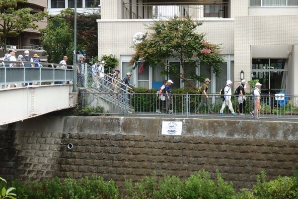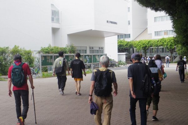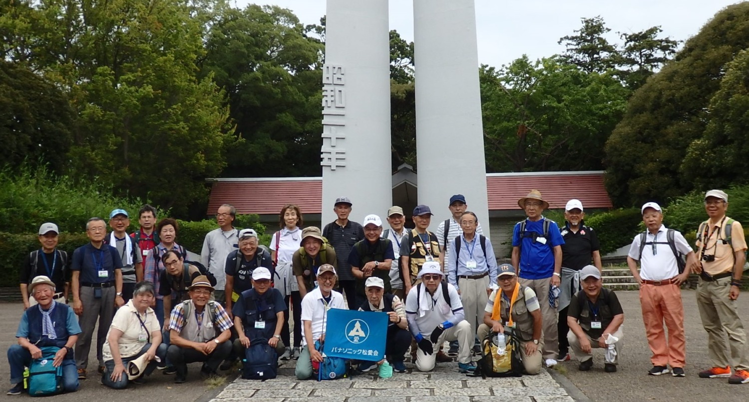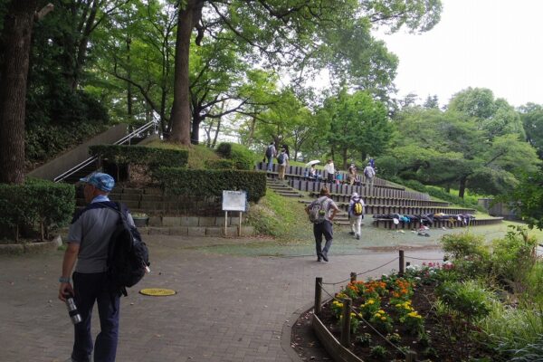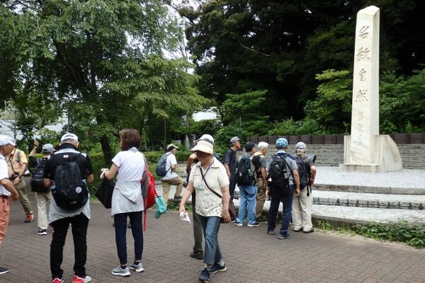 鎌倉古道から三ツ沢公園に入り横浜市戦没者慰霊塔前で記念写真を撮り豊顕寺(ぶげんじ)市民の森、三ツ沢せせらぎ緑道、三本松橋、峰沢橋を渡り常盤台第一公園で休憩。横浜国大正門からキャンパス内を通り登録有形文化財横浜国立大学名教自然碑を見学して南門に到着。キャンパスを出て常盤公園下のコンビニで昼食と飲料を調達し常盤公園の観客席で昼食と休憩。