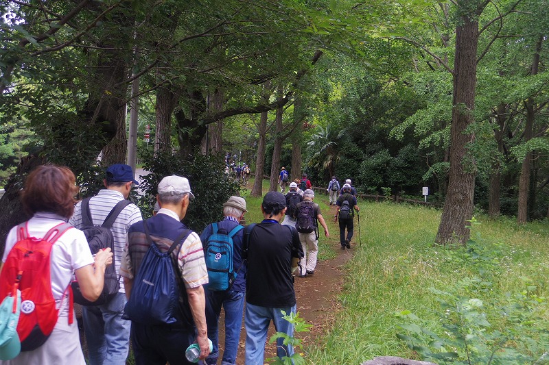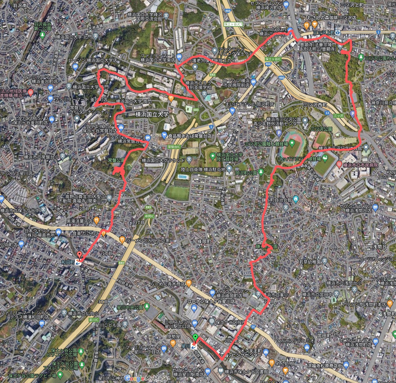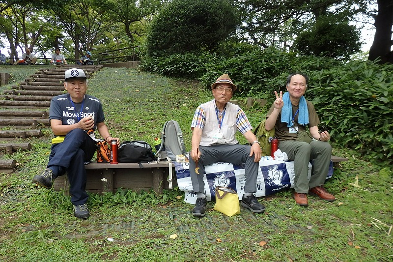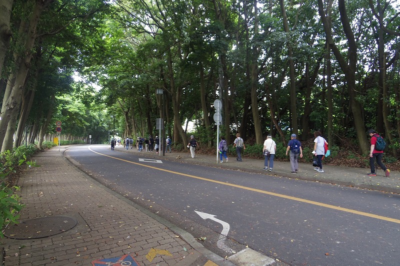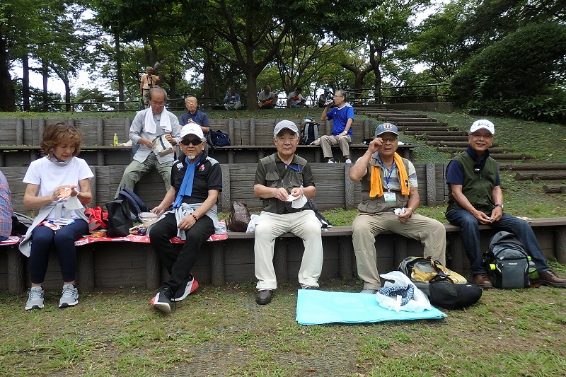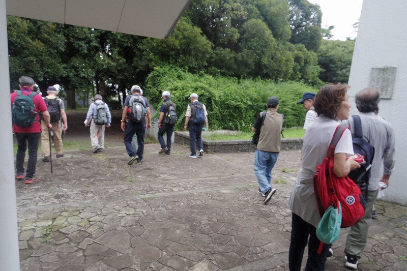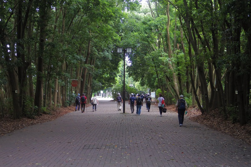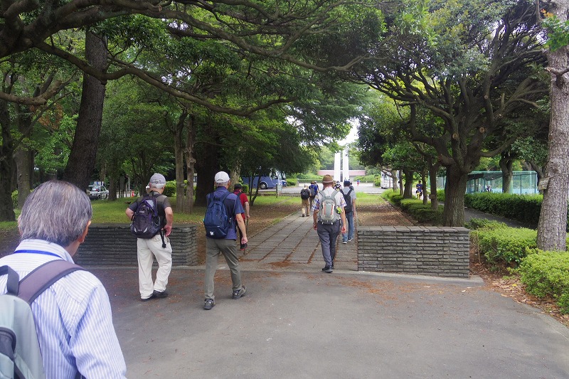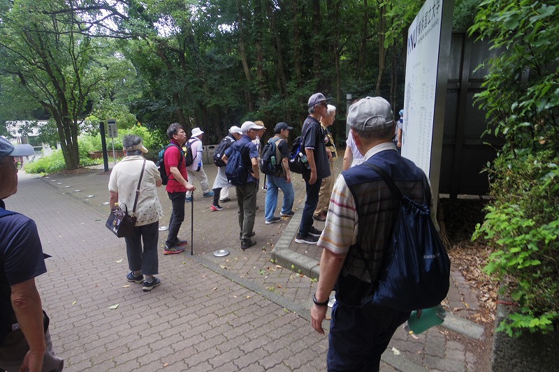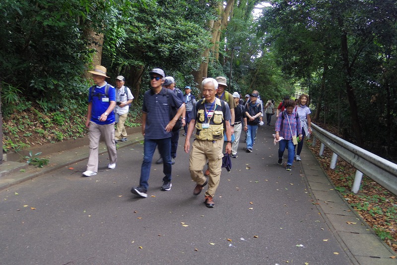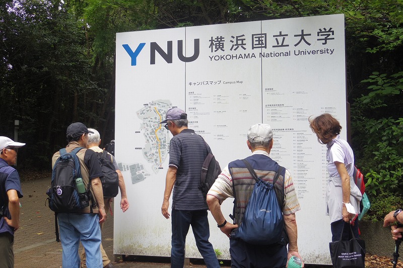 鎌倉古道から三ツ沢公園に入り横浜市戦没者慰霊塔前で記念写真を撮り豊顕寺(ぶげんじ)市民の森、三ツ沢せせらぎ緑道、三本松橋、峰沢橋を渡り常盤台第一公園で休憩。横浜国大正門からキャンパス内を通り登録有形文化財横浜国立大学名教自然碑を見学して南門に到着。キャンパスを出て常盤公園下のコンビニで昼食と飲料を調達し常盤公園の観客席で昼食と休憩。