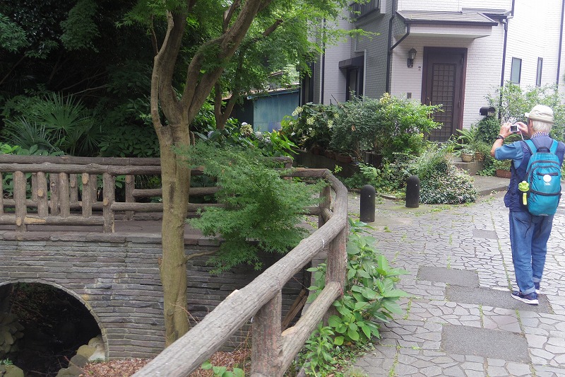 1階に降りて帷子(かたびら)川沿いの遊歩道を通り柳橋前の川辺公園前を通り水道道を横断し峯小学校裏の住宅街の坂道を登り峰岡公園で休憩。