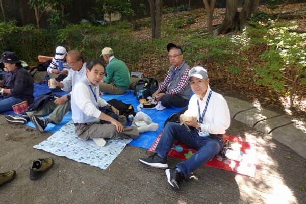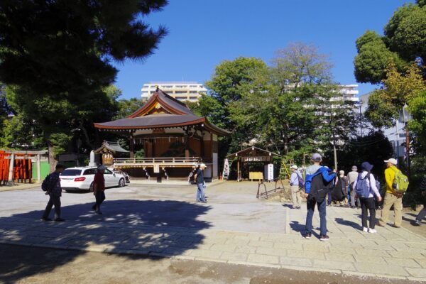 その後に八ツ山通り、新品川橋前から荏原神社に参拝。国道15号線から板垣退助墓がある品川神社に参拝。休憩後に鉄道線の上の新八ツ山橋を渡り五反田のコンビニで昼食を調達と休憩し五反田池田山の高級住宅街を楽しみながら池田山公園に到着。緑いっぱいの公園で昼食と休憩。