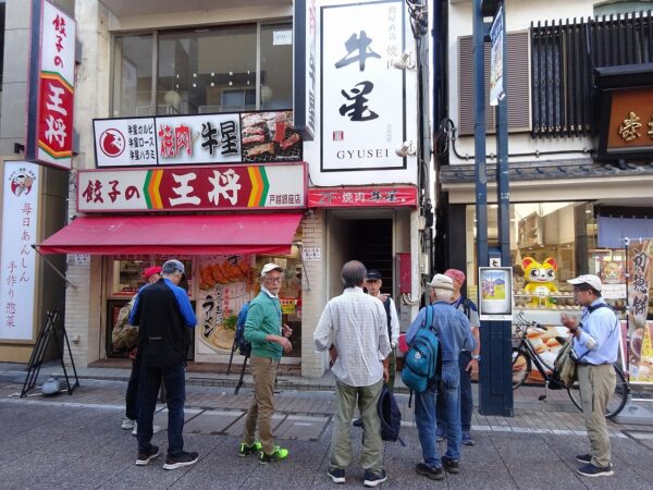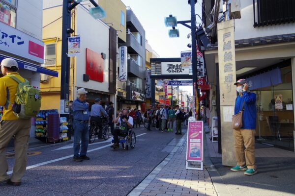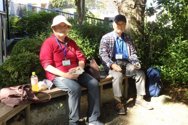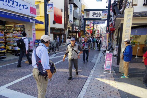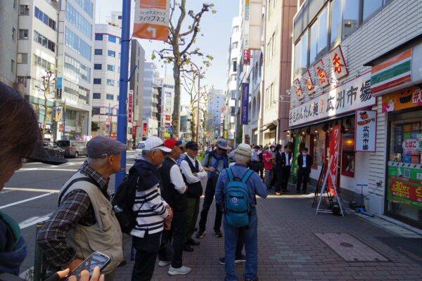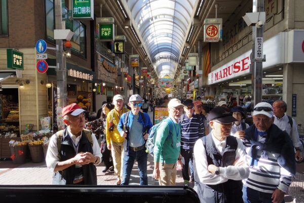 つづいて不動前緑道公園を歩き、ここで休憩とこの後の商店街で買い物のある人は流れ解散ありと伝えました。つづいて武蔵小山商店街、戸越銀座商店街を楽しみながら東急池上線戸越銀座駅前で14時に解散し無事終了した。