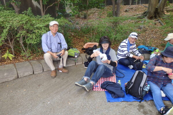 記念写真を撮り、午後の歩きを開始した。花房山通りから目黒駅、豪華な雅叙園前を通り、太鼓橋を渡り目黒川沿いを歩き、緩やかなかむろ坂を上がり、かむろ坂公園前で小休止。