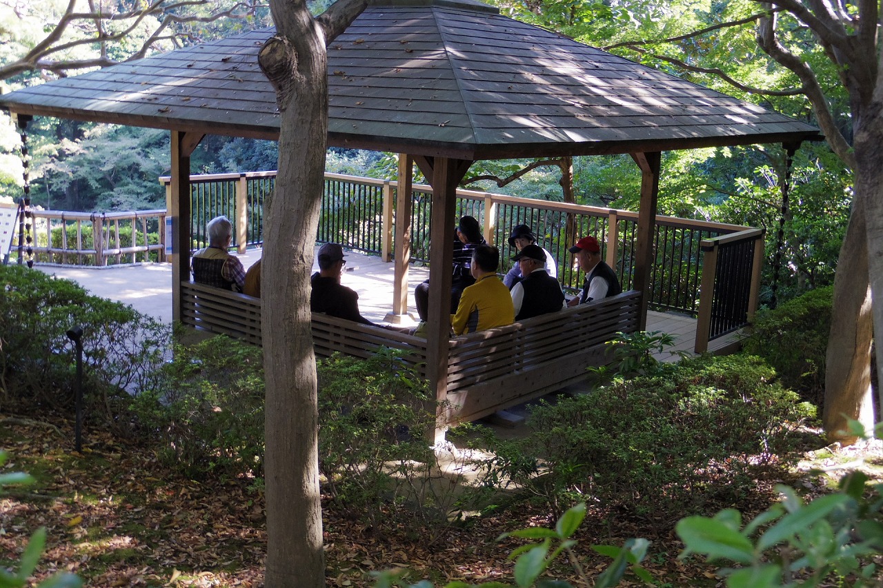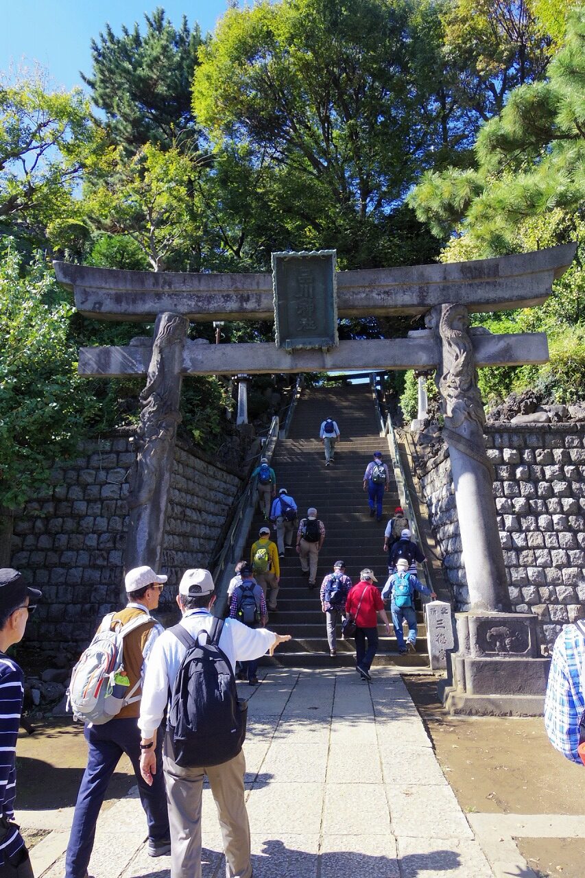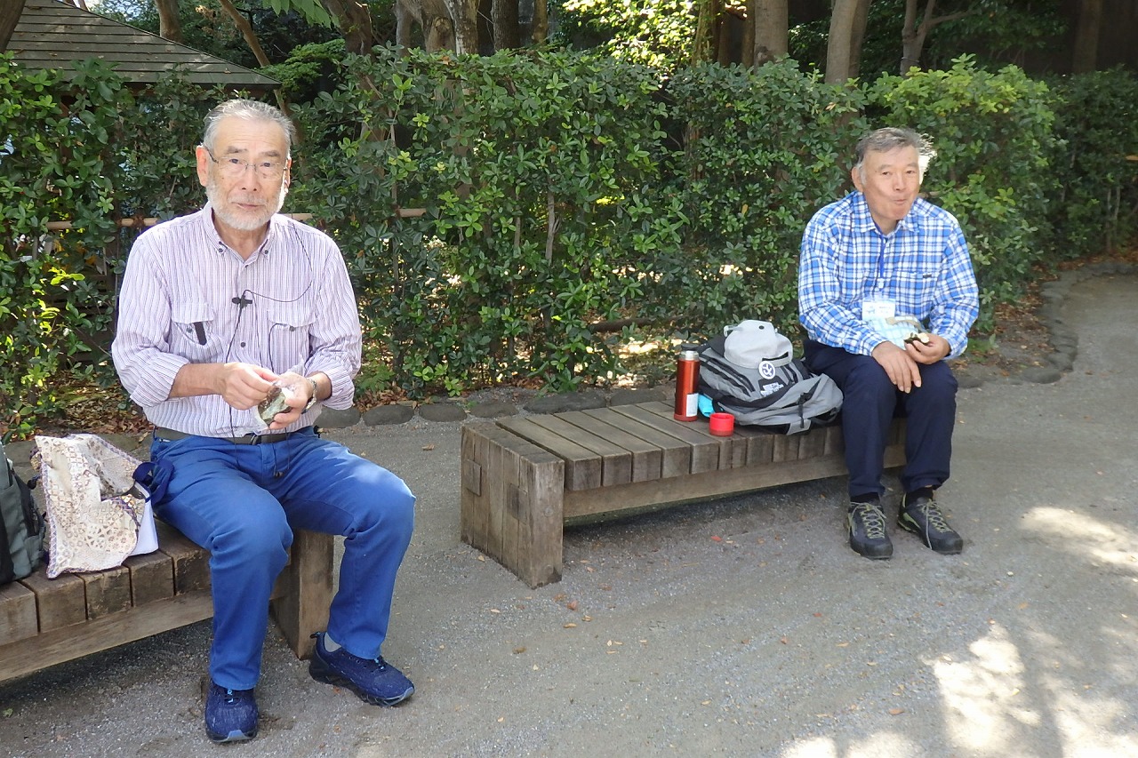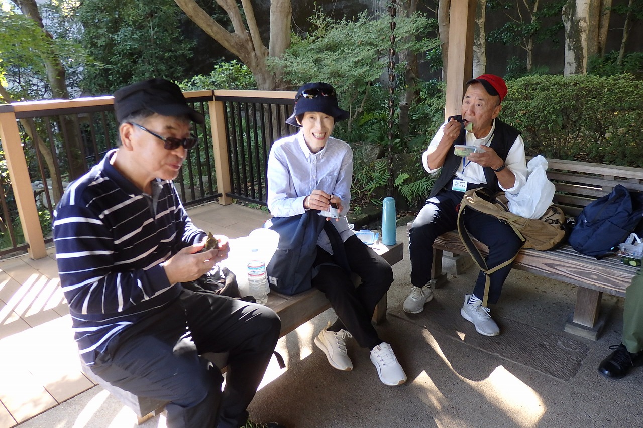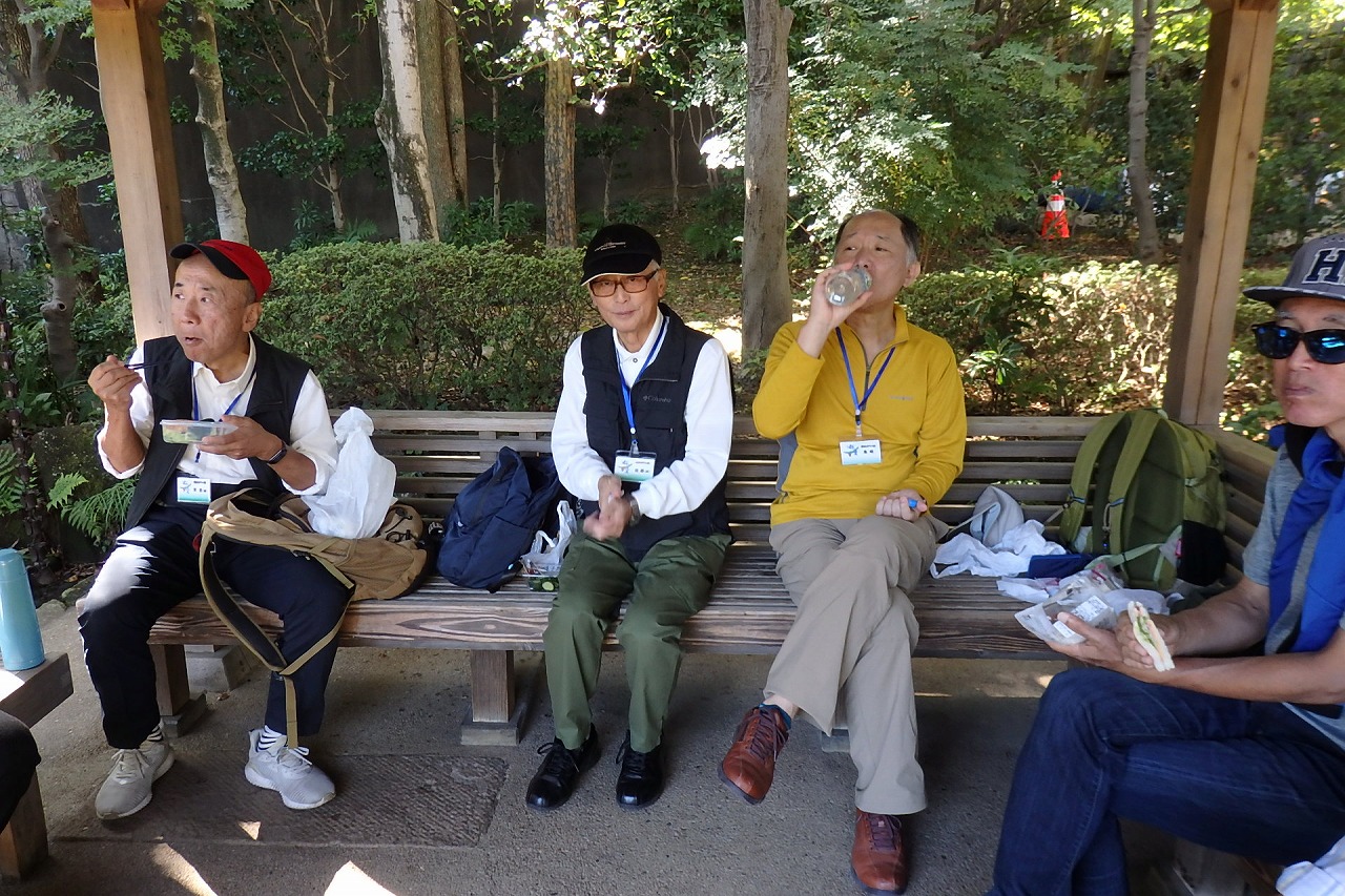 その後に八ツ山通り、新品川橋前から荏原神社に参拝。国道15号線から板垣退助墓がある品川神社に参拝。休憩後に鉄道線の上の新八ツ山橋を渡り五反田のコンビニで昼食を調達と休憩し五反田池田山の高級住宅街を楽しみながら池田山公園に到着。緑いっぱいの公園で昼食と休憩。