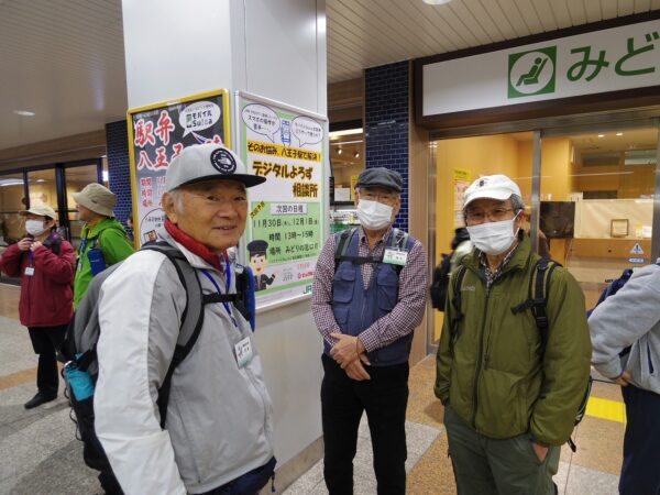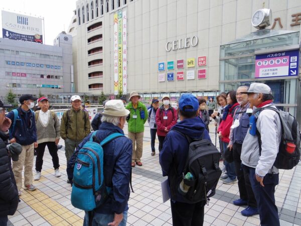 JR八王子駅改札前に午前10時に集合、受付を済ませ北口出口前で世話役の挨拶、コース説明を聞いてスタート。