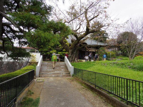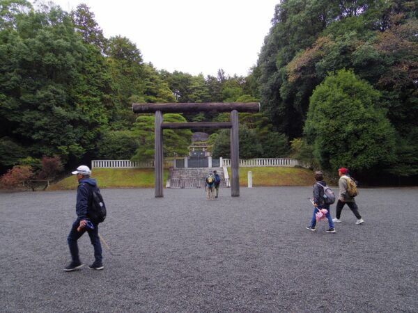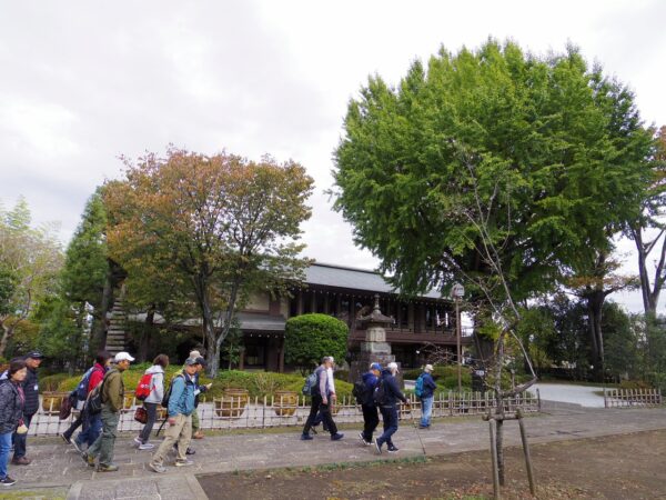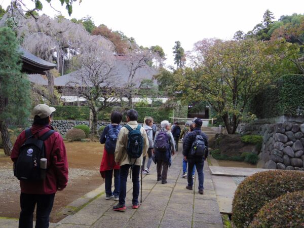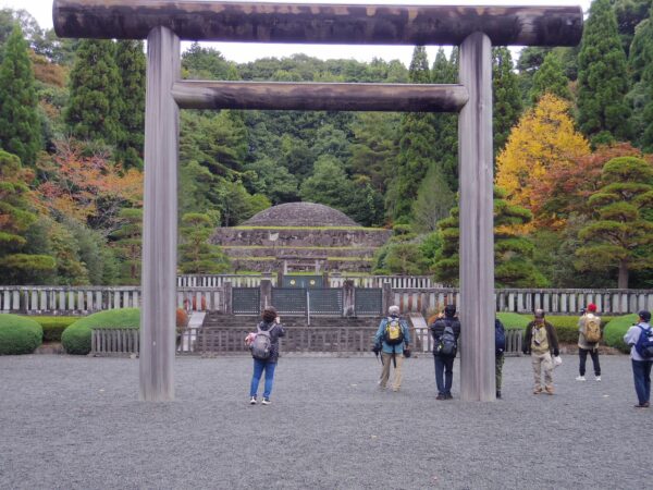 記念写真を撮り午後のスタート。公園横の住宅街の坂道を下り真覚寺にお参り、大きな緑を背景に再度の記念写真を撮り万葉けやき通り、散田架道橋のトンネルを抜けて甲州街道、南浅川の緑道を歩き、都立陵南公園で小休止。ケヤキ並木路から広大な多摩御陵に参拝。