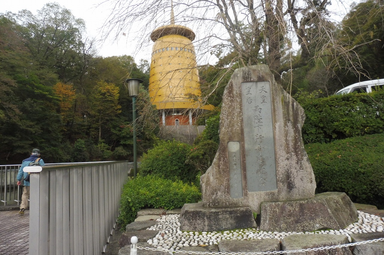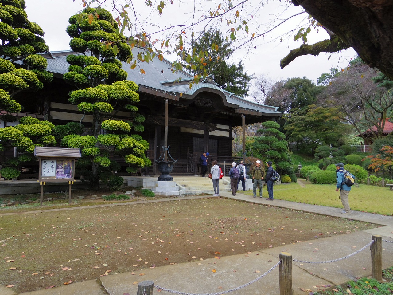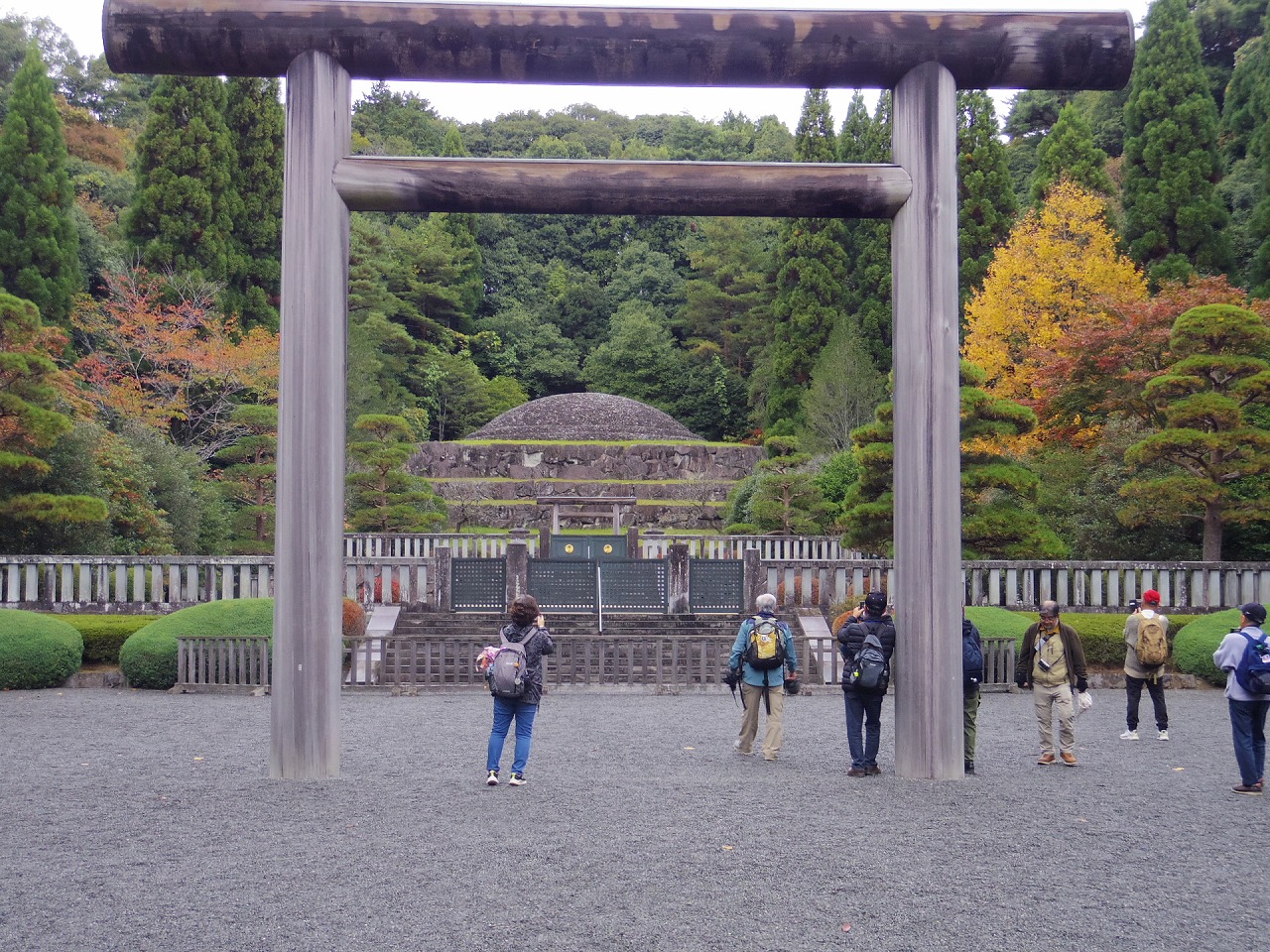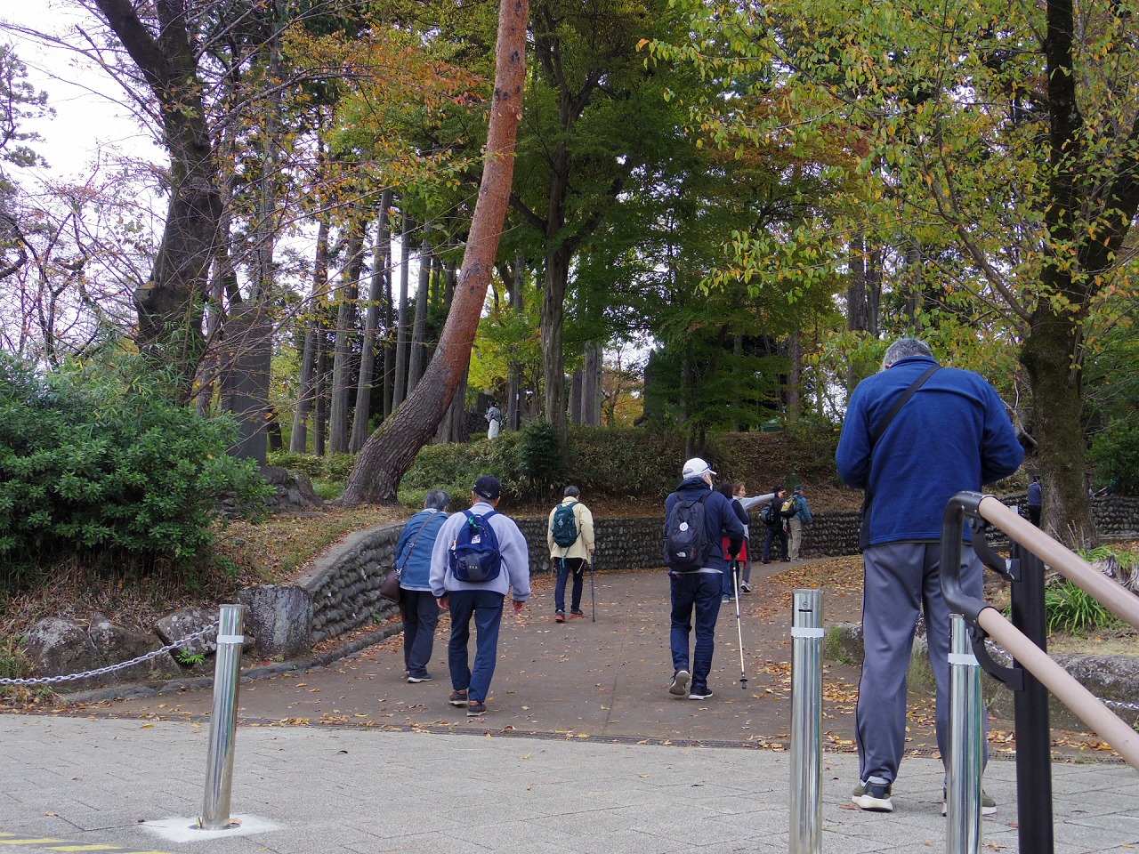 記念写真を撮り午後のスタート。公園横の住宅街の坂道を下り真覚寺にお参り、大きな緑を背景に再度の記念写真を撮り万葉けやき通り、散田架道橋のトンネルを抜けて甲州街道、南浅川の緑道を歩き、都立陵南公園で小休止。ケヤキ並木路から広大な多摩御陵に参拝。