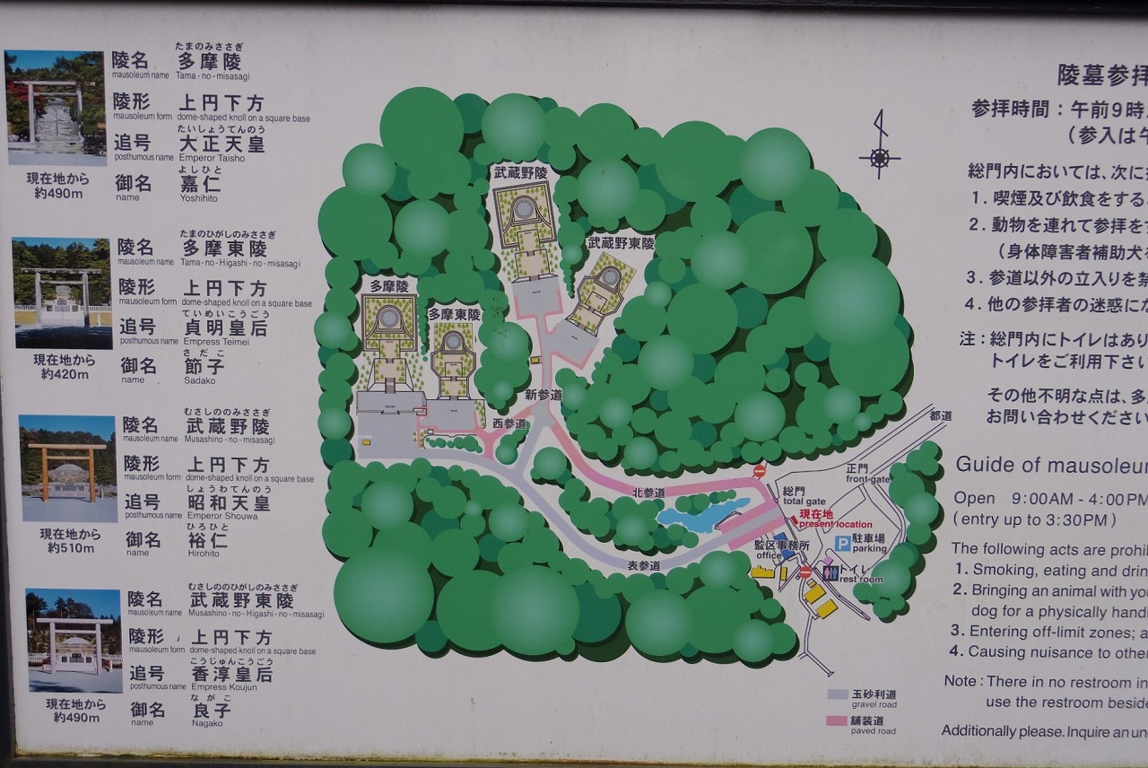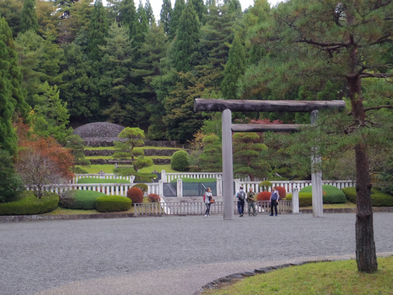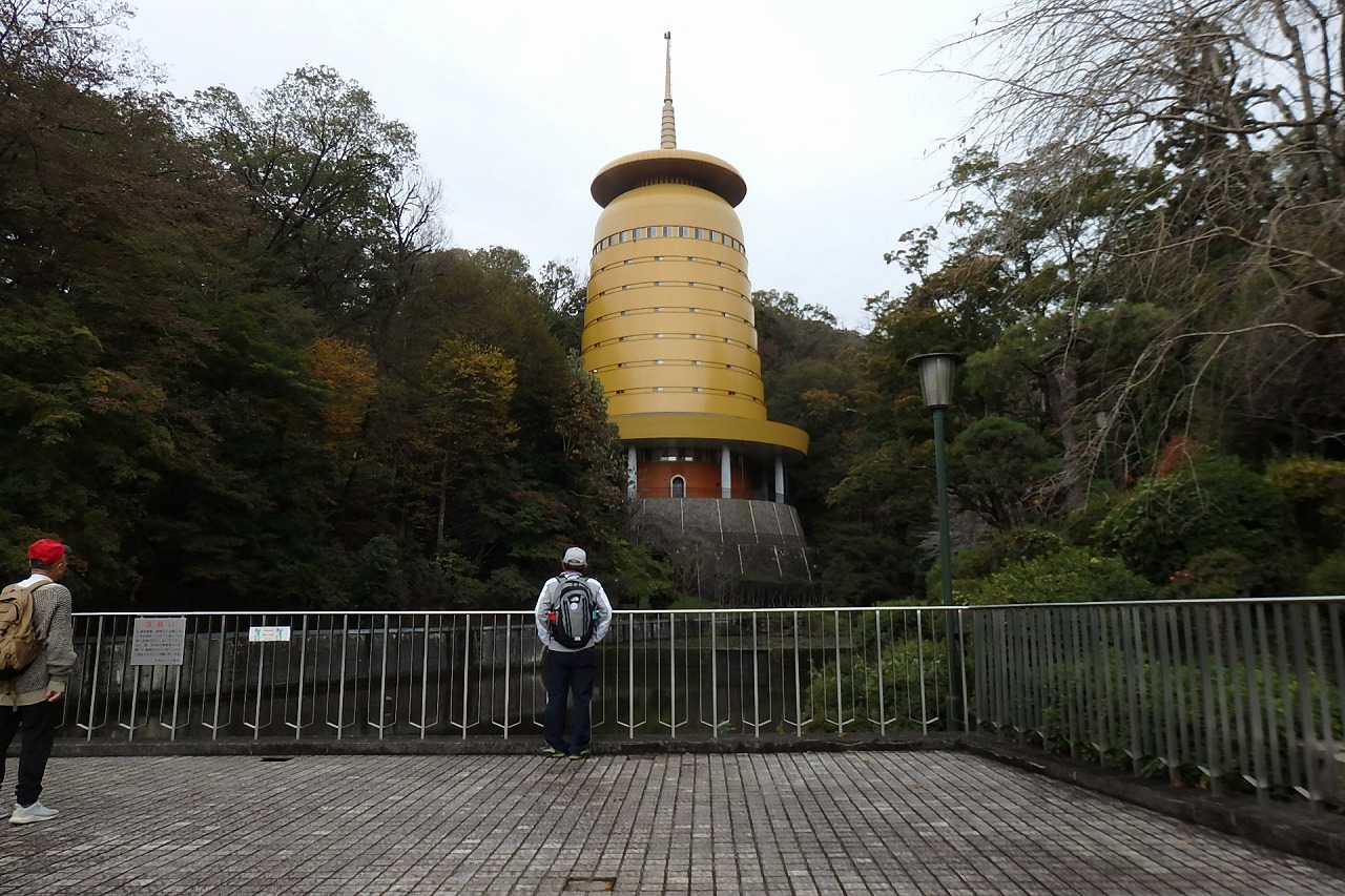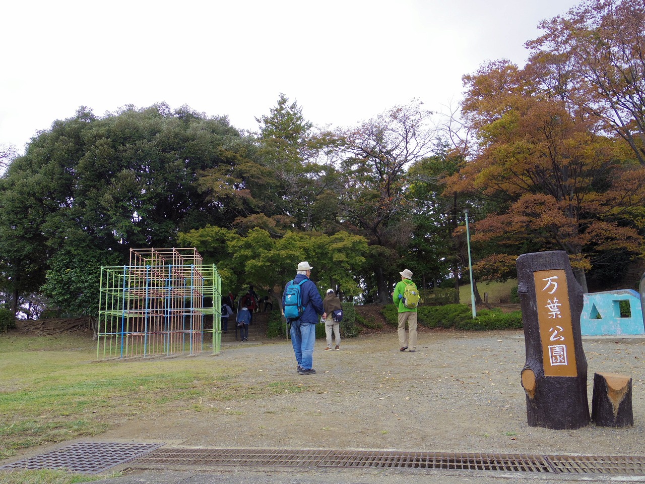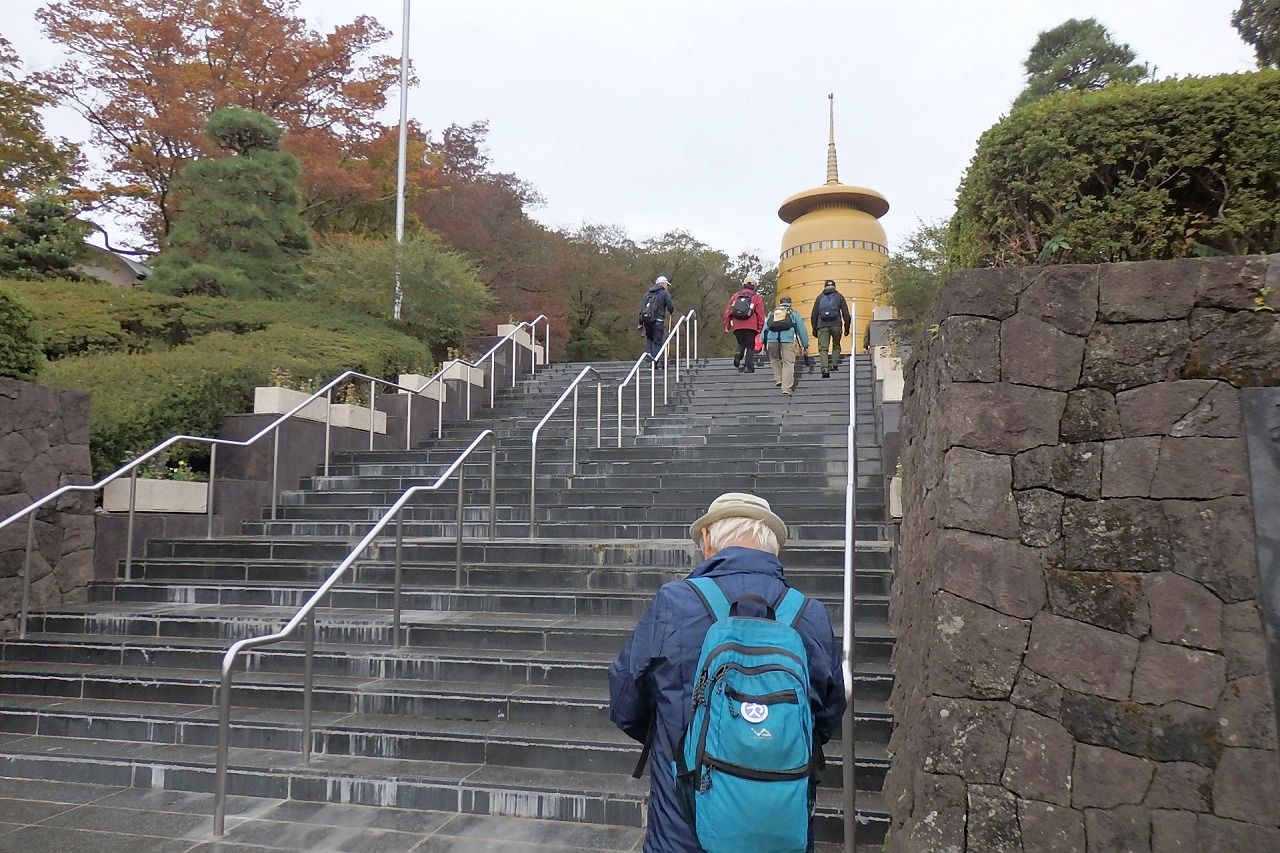 記念写真を撮り午後のスタート。公園横の住宅街の坂道を下り真覚寺にお参り、大きな緑を背景に再度の記念写真を撮り万葉けやき通り、散田架道橋のトンネルを抜けて甲州街道、南浅川の緑道を歩き、都立陵南公園で小休止。ケヤキ並木路から広大な多摩御陵に参拝。