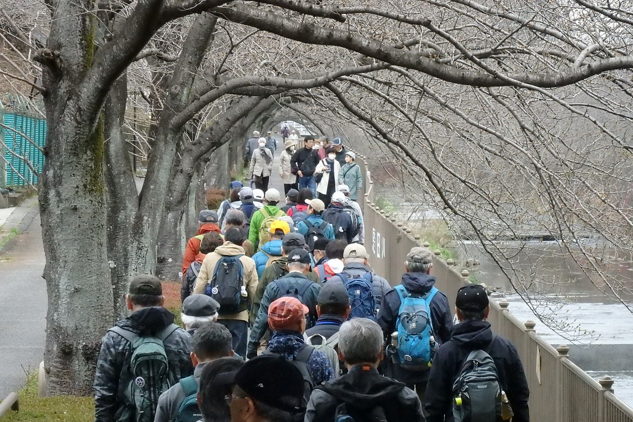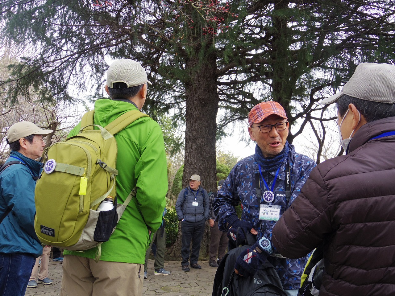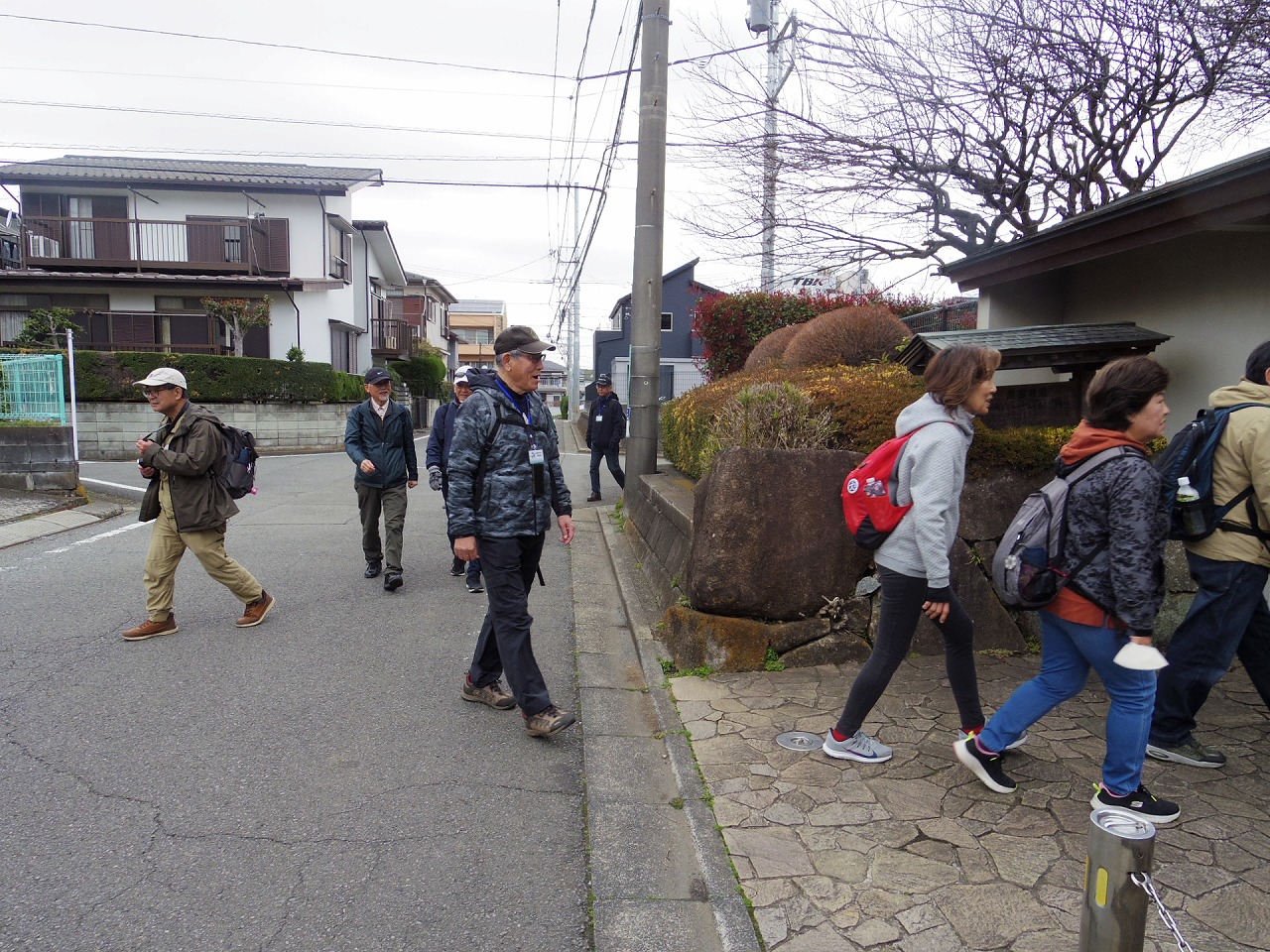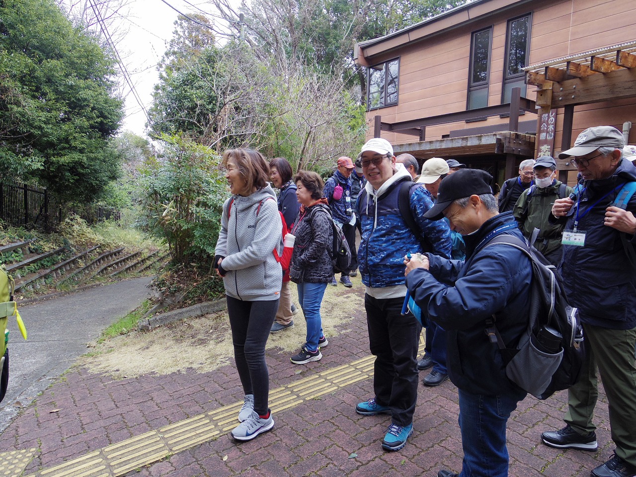 田園都市線つくし野駅改札前で受付を済ませ10時まで駅前広場で談笑。世話役から「残念ながら桜の開花が遅れてるので一部コースを変更します」の連絡を聞いてスタート。