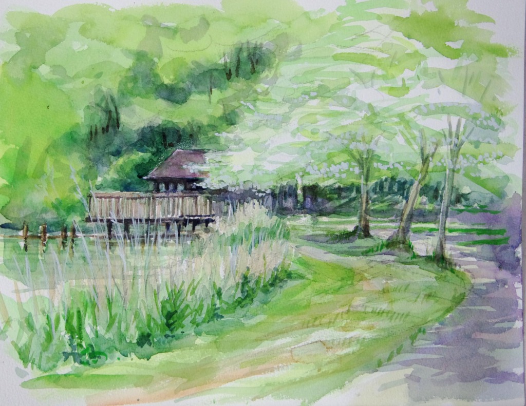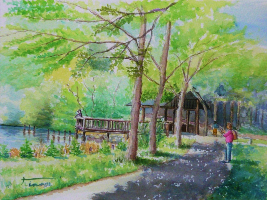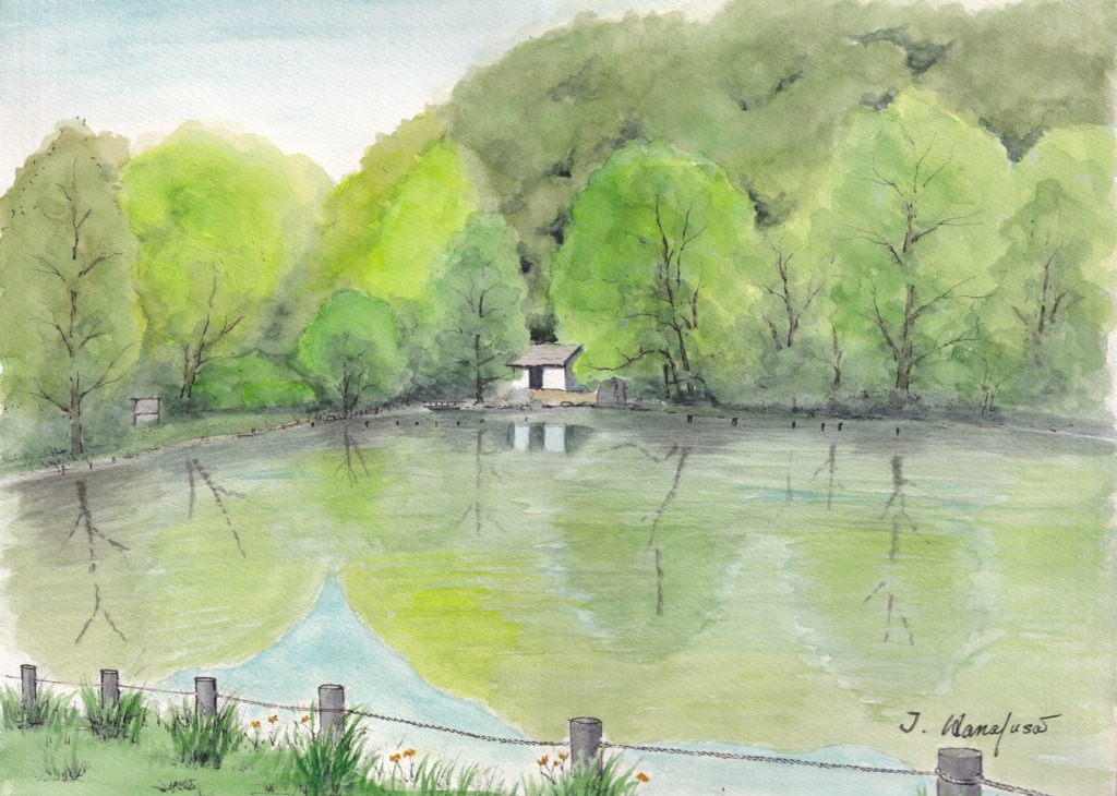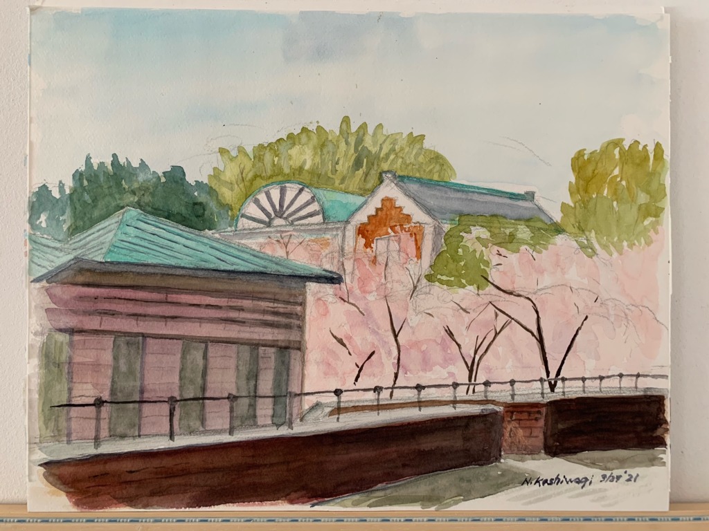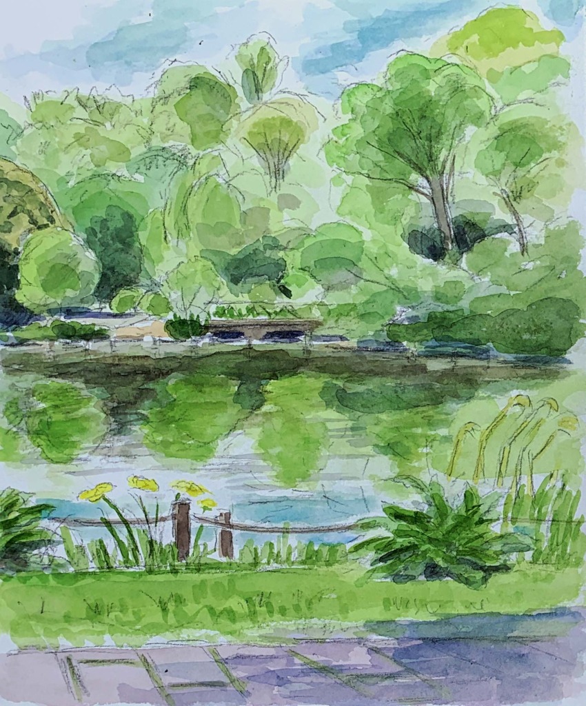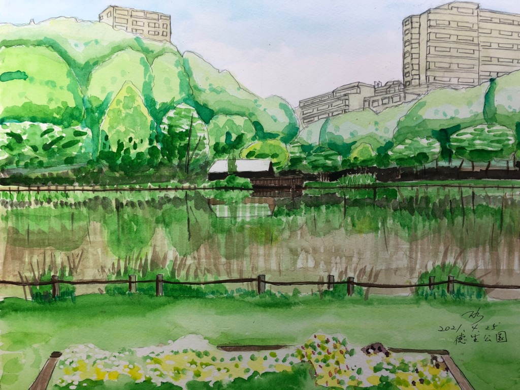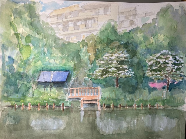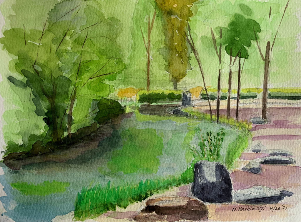 桜は終わって、緑輝くころになりました。コロナはまだ収束していませんが、今月も対策を万全にしてスケッチを行いました。センター北駅の近く、小さな公園ですが、小川と小さな池があります。むずかしかったああ!