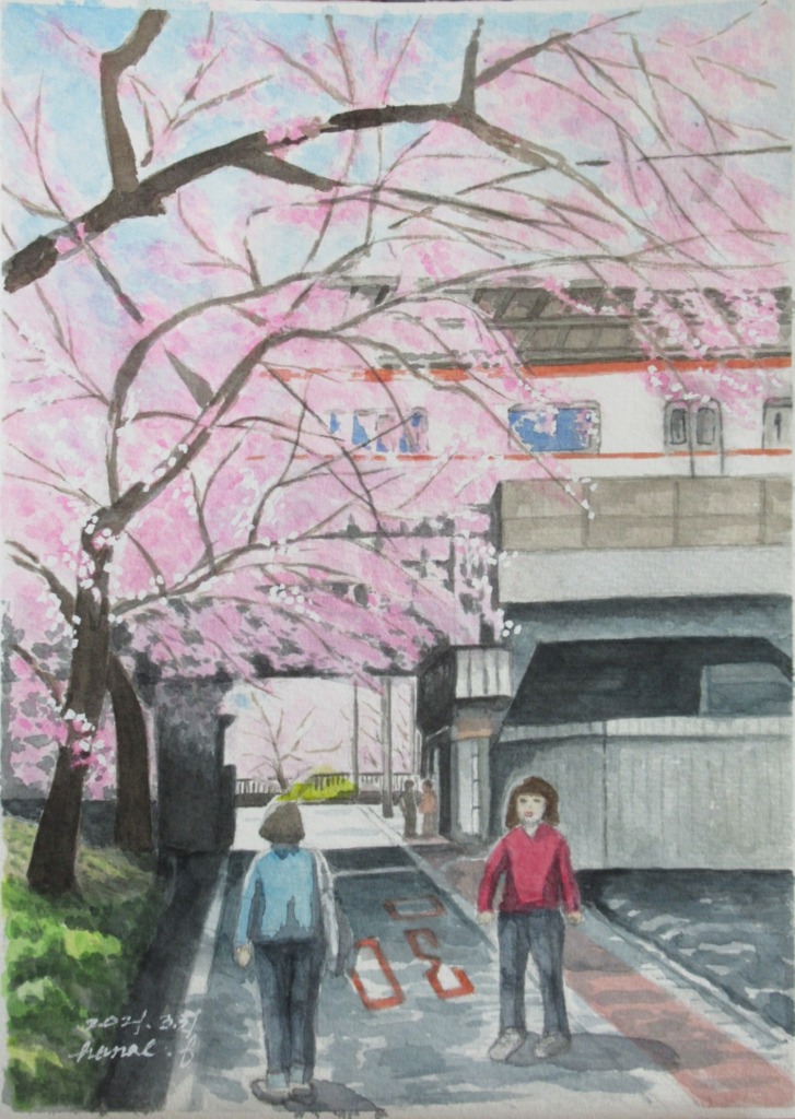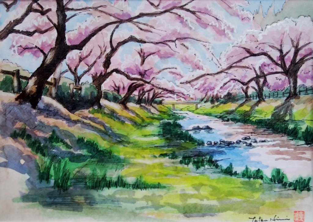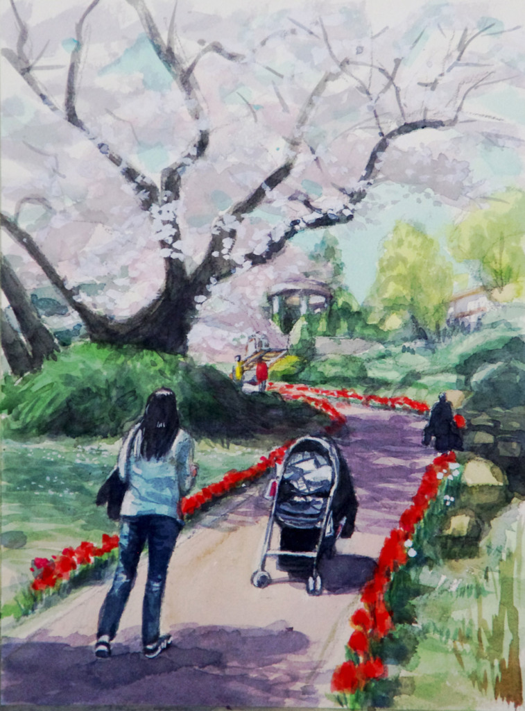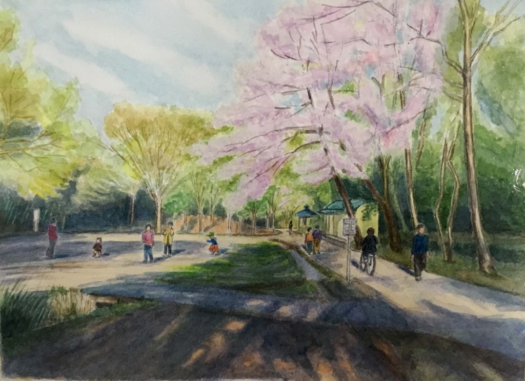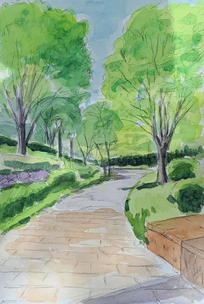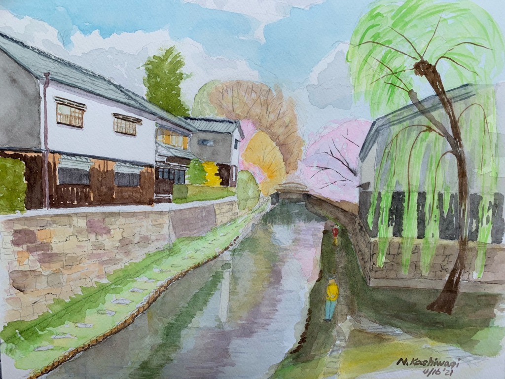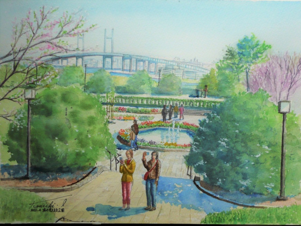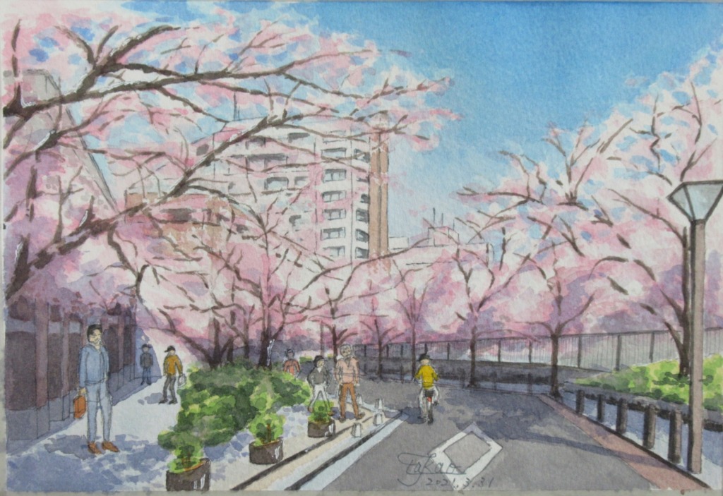 桜は終わって、緑輝くころになりました。コロナはまだ収束していませんが、今月も対策を万全にしてスケッチを行いました。センター北駅の近く、小さな公園ですが、小川と小さな池があります。むずかしかったああ!