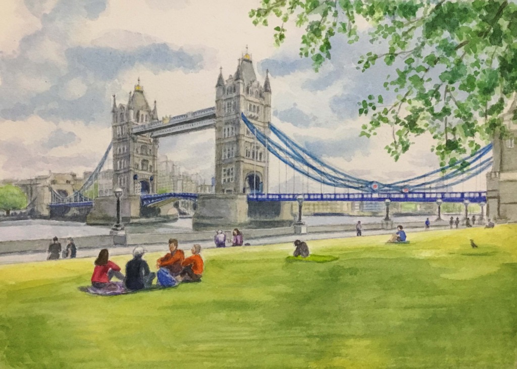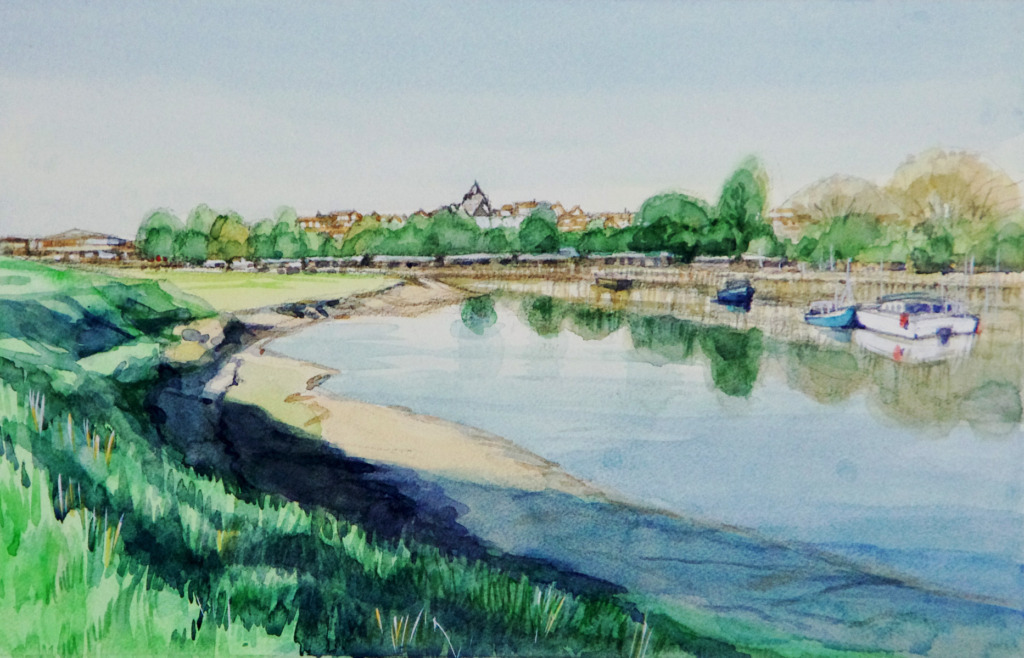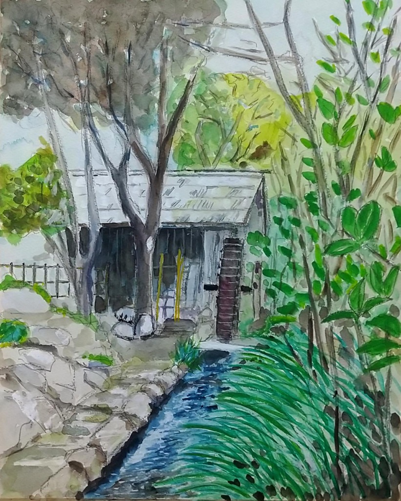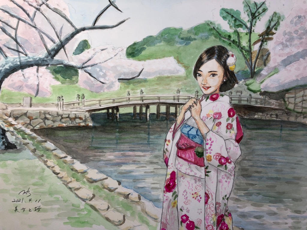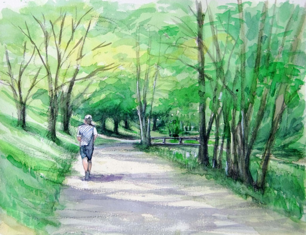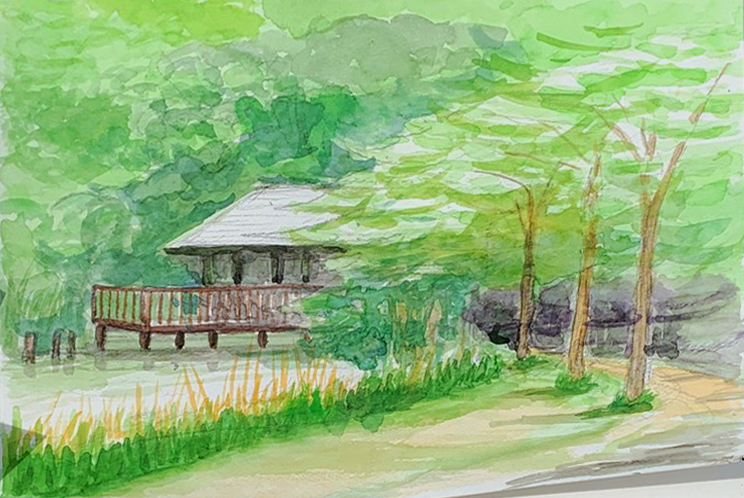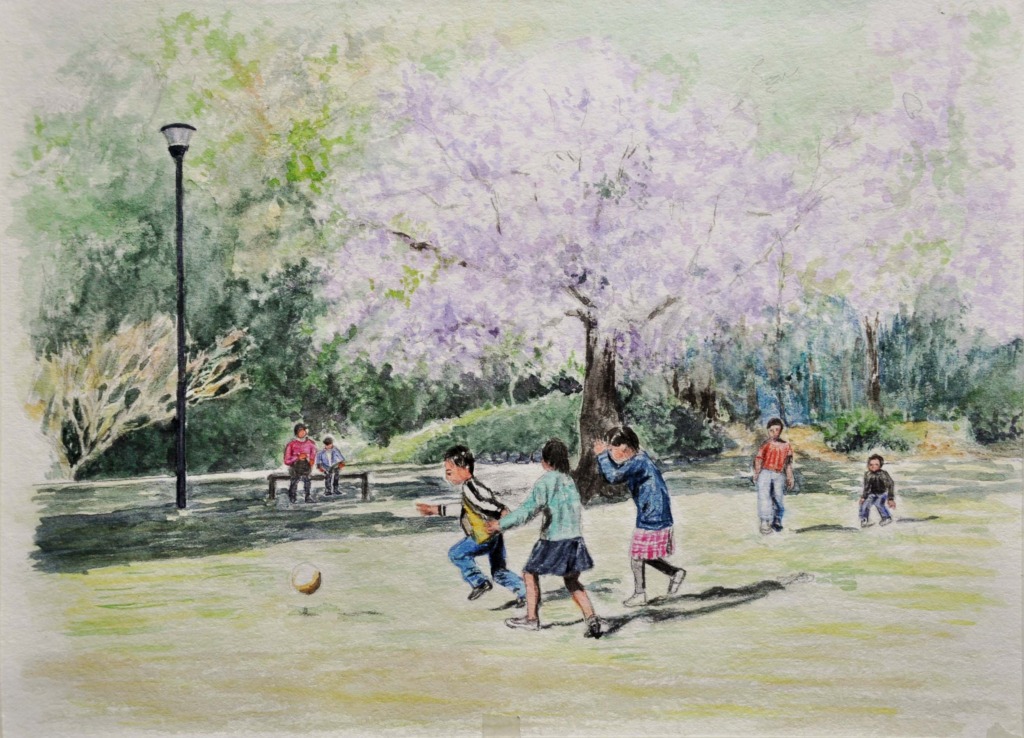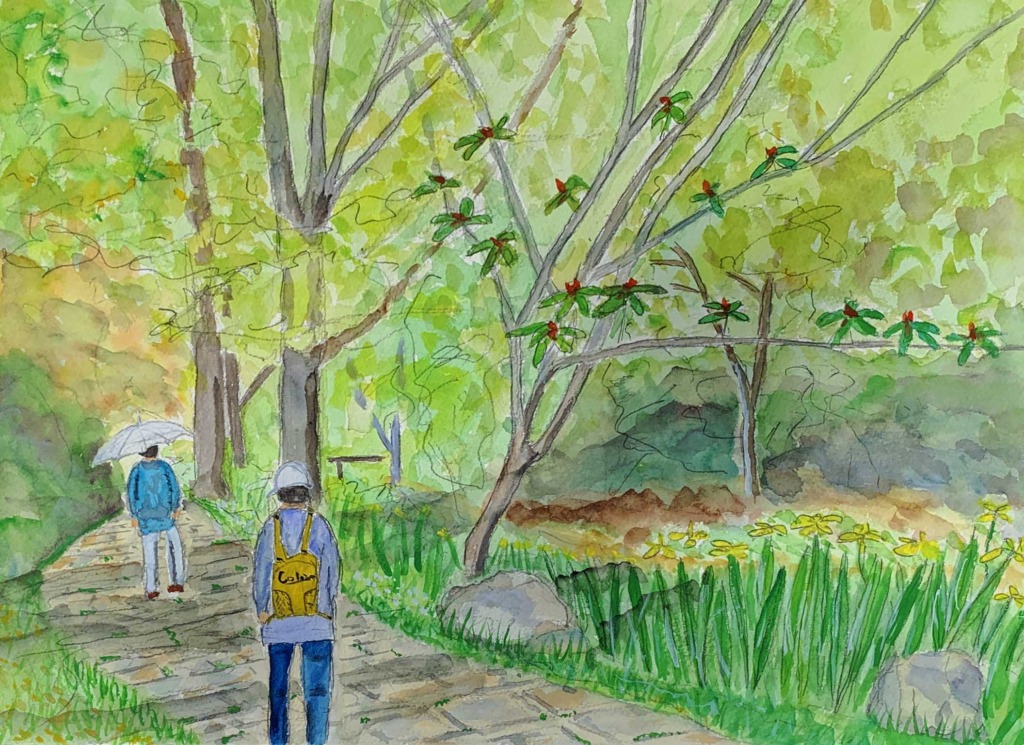 桜は終わって、緑輝くころになりました。コロナはまだ収束していませんが、今月も対策を万全にしてスケッチを行いました。センター北駅の近く、小さな公園ですが、小川と小さな池があります。むずかしかったああ!