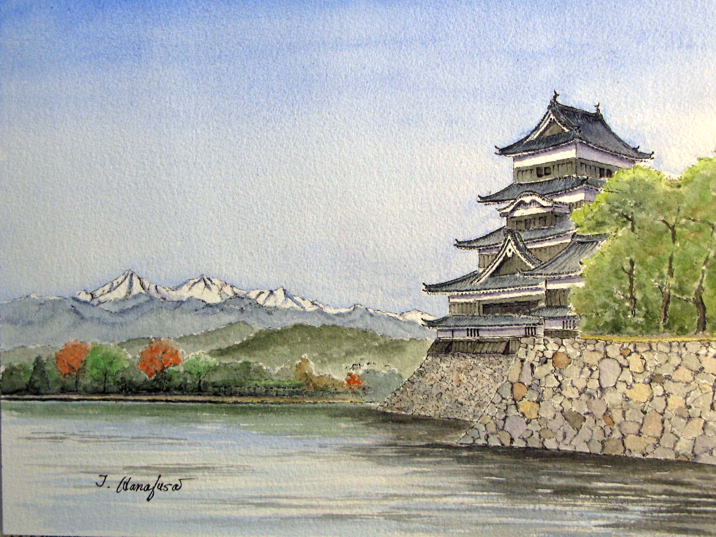- 花房利春<松本城から北アルプスを望む>