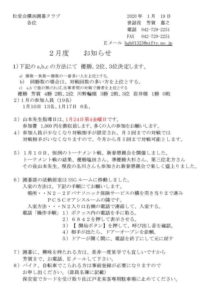 囲碁クラブ 2月度お知らせ(2020年)