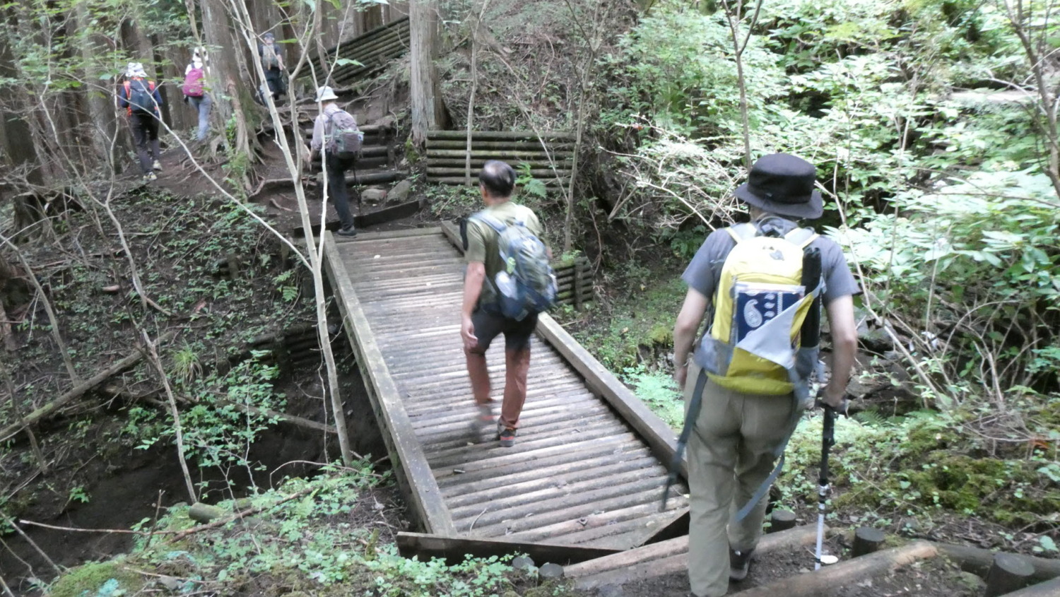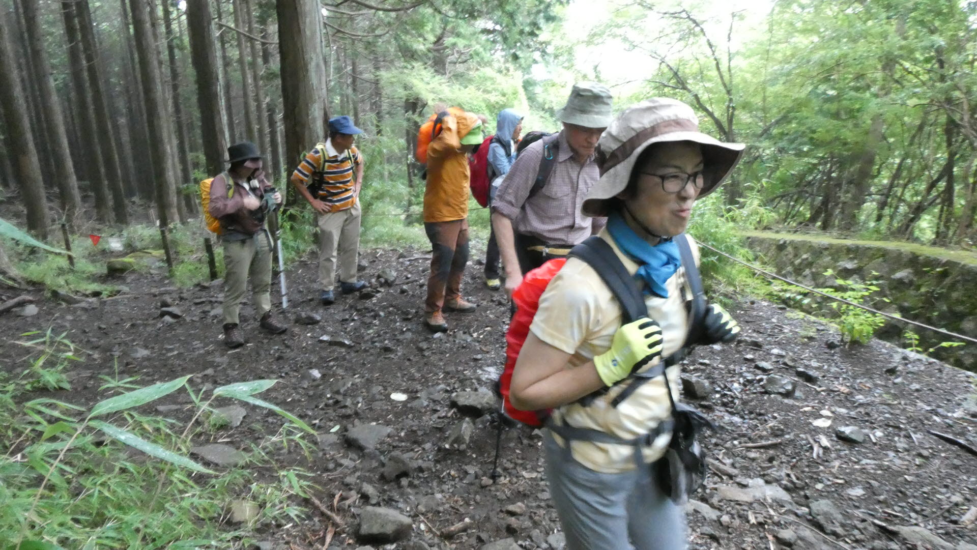 - 成長した杉林の中のハイキングコースを上る
