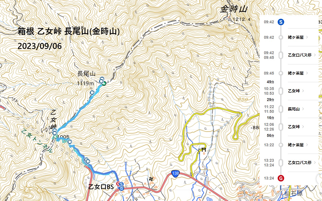 2023年9月山行は「箱根・乙女峠ー長尾山」で参加者は12名でした。箱根登山鉄道・箱根湯本駅3番バス乗り場9時集合・10分発に乗車、乙女口下車。山行を開始しました。麓では日差しがありましたが、台風13号の影響もあり山行開始ころには雲が徐々に山並みを被い小雨から本降りとなりましたが乙女峠を目指しました。峠到着時、小雨になり長尾山まで続行することにしました。長尾山で昼食後、スマホ天気予報では再び雨が予想されたため金時山への登りを中止し、上りコースを折り返し下山をしました。下山後は、岩風呂温泉にて休息&懇親会を平日の体力維持方法や山行の楽しみについて意見交換ができました。 コースタイム :3時間36分 上り:421m、くだり:411m