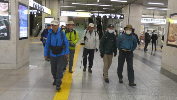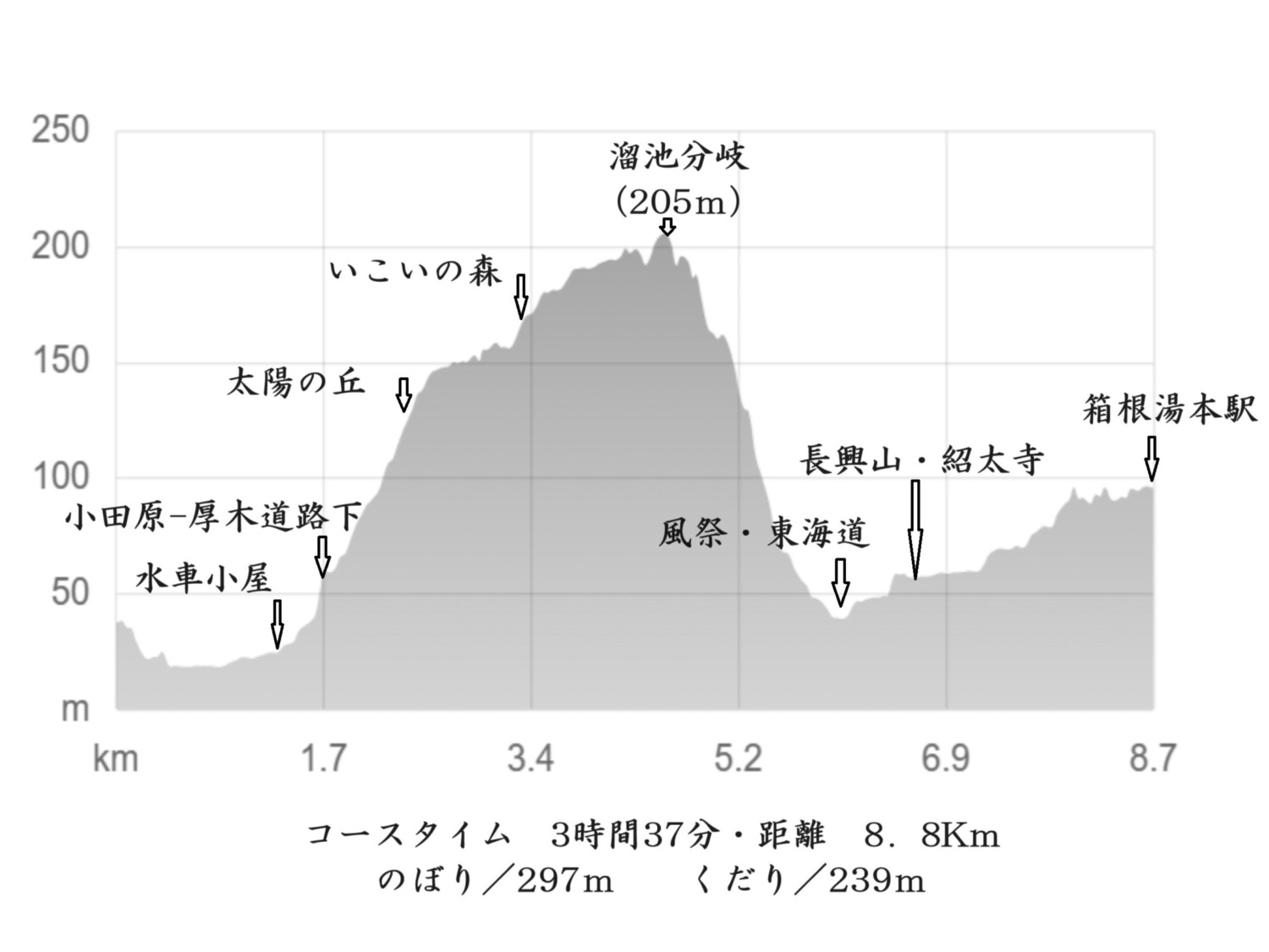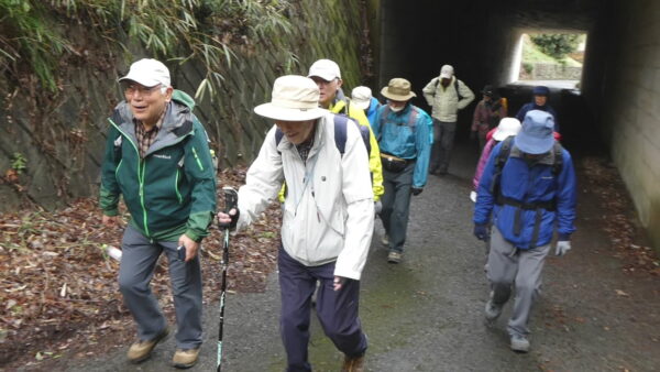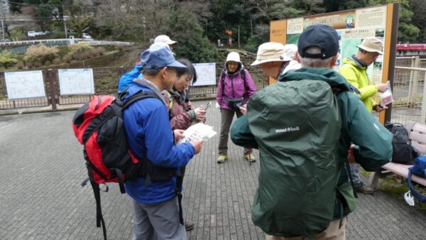 2024年3月山行は「小田原ー箱根湯本&総会」で参加者は13名(新会員1名)でした。JR/小田急小田原駅西口に9時集合。総会会場に関する説明・新会員1名の紹介とリーダーからの行程説明後、霧雨の中「めだかの学校」を目指し出発しました。一般道を進み「めだかの学校」→「水車小屋」→脇道に入り「高速道路下トンネル」→ハイキングらしい景色を味わいながら「太陽の丘」→「いこいの森」へと進みました。霧雨のため屋根のある管理棟内で早めの昼食を済ませ「溜池分岐」→「風祭」→「長興山・紹太寺」まで休憩&水分補給をしながら到着。600mの階段上りコースについて協議を行い、ルート変更して箱根湯本駅に全員無事到着できました。(コースタイム:3時間37分 距離8.8Km) 続いて須雲川沿いの湯場滝通りを散策しながら総会会場の「箱根の湯」に到着後、休息&総会(参加者14名)を行い2023年度総括と2024年度山行計画等が承認されました。