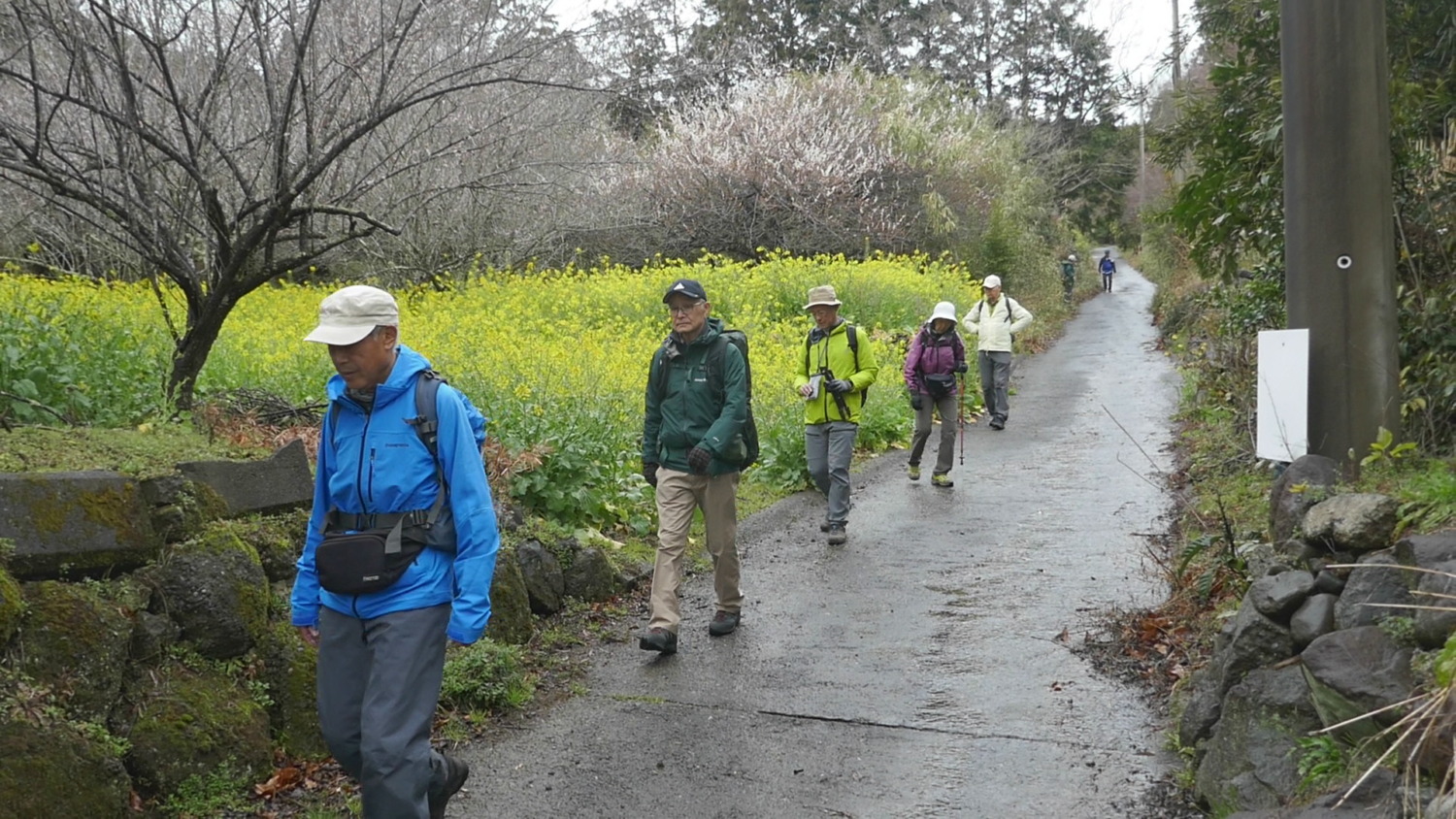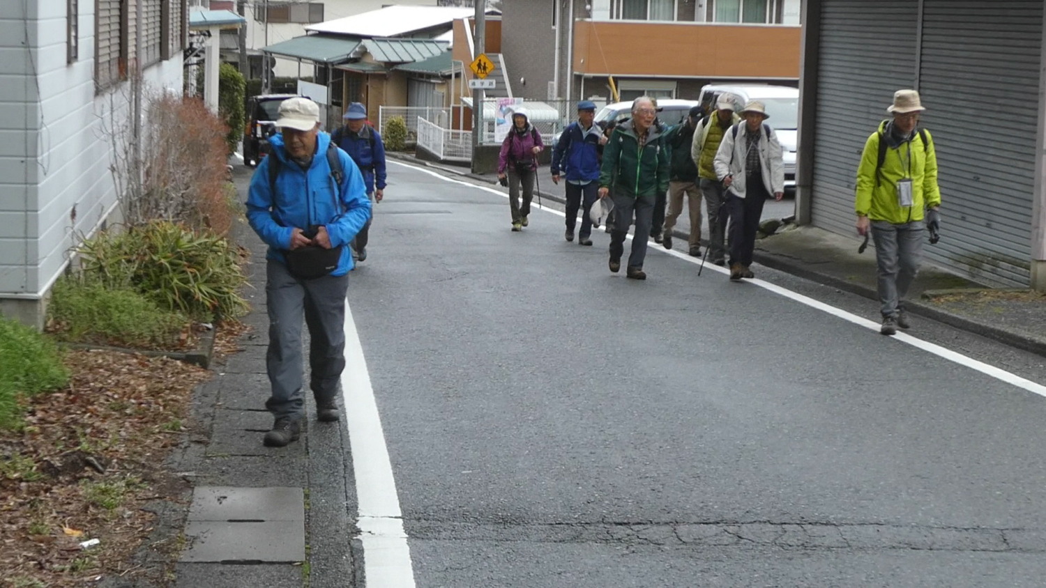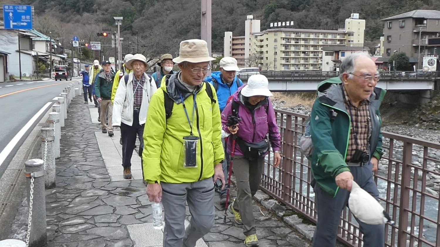 2024年3月山行は「小田原ー箱根湯本&総会」で参加者は13名(新会員1名)でした。JR/小田急小田原駅西口に9時集合。総会会場に関する説明・新会員1名の紹介とリーダーからの行程説明後、霧雨の中「めだかの学校」を目指し出発しました。一般道を進み「めだかの学校」→「水車小屋」→脇道に入り「高速道路下トンネル」→ハイキングらしい景色を味わいながら「太陽の丘」→「いこいの森」へと進みました。霧雨のため屋根のある管理棟内で早めの昼食を済ませ「溜池分岐」→「風祭」→「長興山・紹太寺」まで休憩&水分補給をしながら到着。600mの階段上りコースについて協議を行い、ルート変更して箱根湯本駅に全員無事到着できました。(コースタイム:3時間37分 距離8.8Km) 続いて須雲川沿いの湯場滝通りを散策しながら総会会場の「箱根の湯」に到着後、休息&総会(参加者14名)を行い2023年度総括と2024年度山行計画等が承認されました。