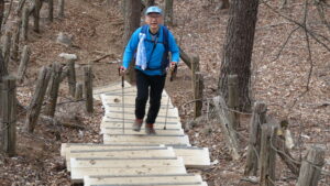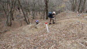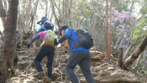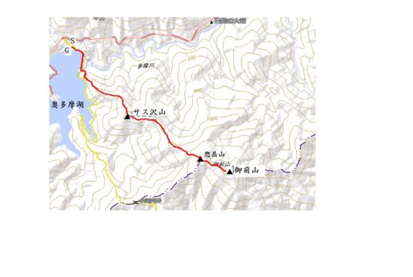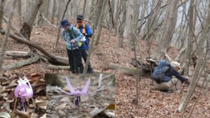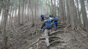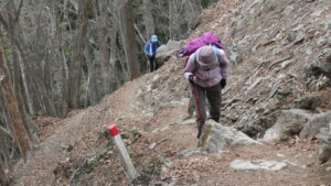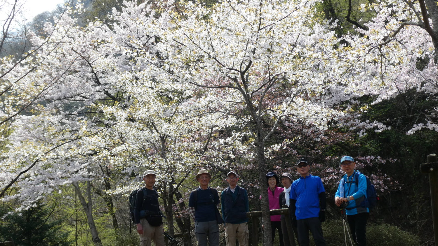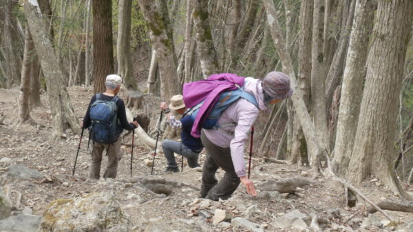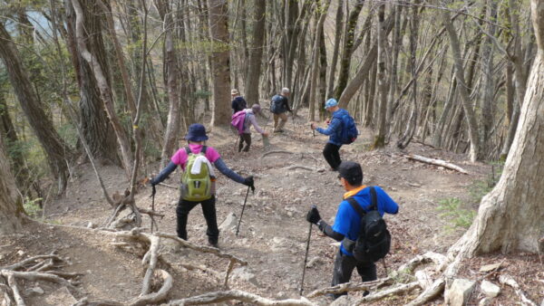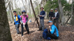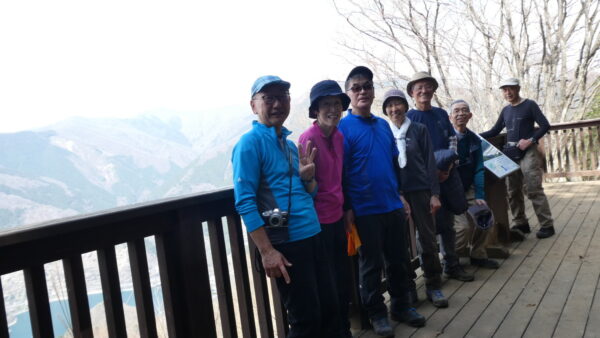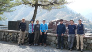 2023年4月山行は、奥多摩三山の御前山で7名の参加でした。JR青梅線奥多摩駅に9:30集合・バスに乗車後、奥多摩湖停車場で下車し記念撮影後、穏やかな陽気の桜道を出発しました。コースは急登が続く難所が多いため、小まめに休憩と水分補給を行いました。惣岳山手前で野生のカタクリや新緑のバイケイソウ・ハシリドコロの群生を見て一息&気分転換できました。初級者コースとは思えない急登や難所が多くコースタイムは、休憩時間を含め7時間5分・距離9.1kmでした。