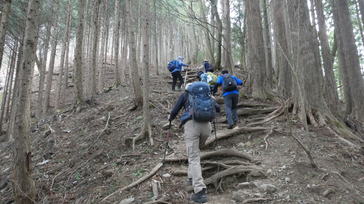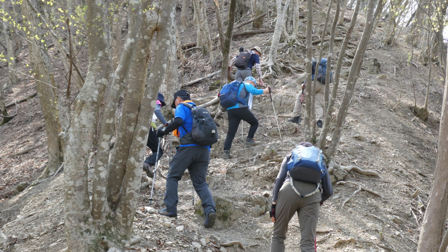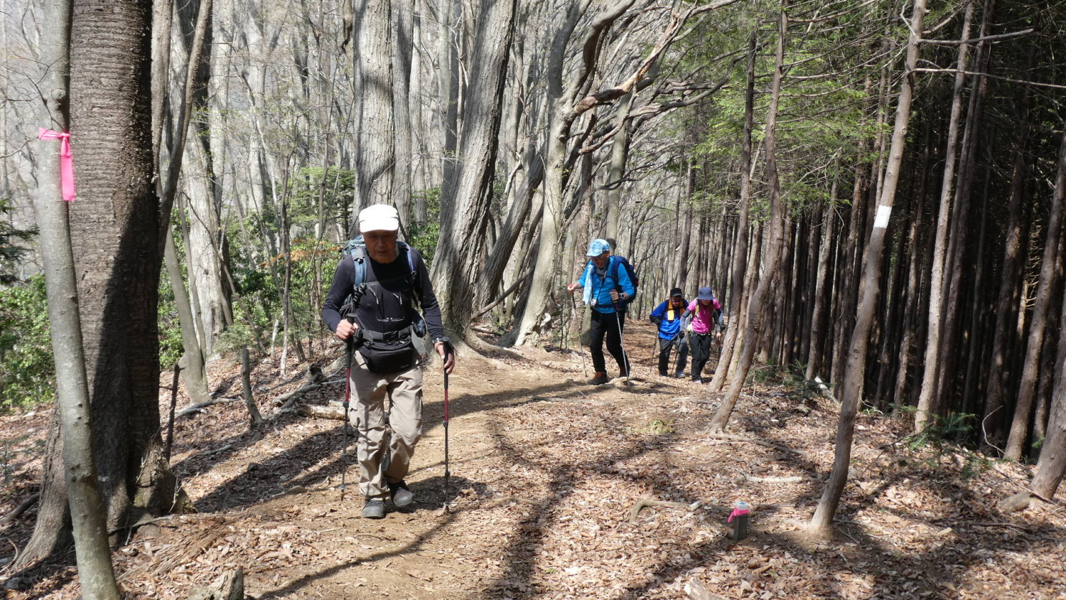 2023年4月山行は、奥多摩三山の御前山で7名の参加でした。JR青梅線奥多摩駅に9:30集合・バスに乗車後、奥多摩湖停車場で下車し記念撮影後、穏やかな陽気の桜道を出発しました。コースは急登が続く難所が多いため、小まめに休憩と水分補給を行いました。惣岳山手前で野生のカタクリや新緑のバイケイソウ・ハシリドコロの群生を見て一息&気分転換できました。初級者コースとは思えない急登や難所が多くコースタイムは、休憩時間を含め7時間5分・距離9.1kmでした。