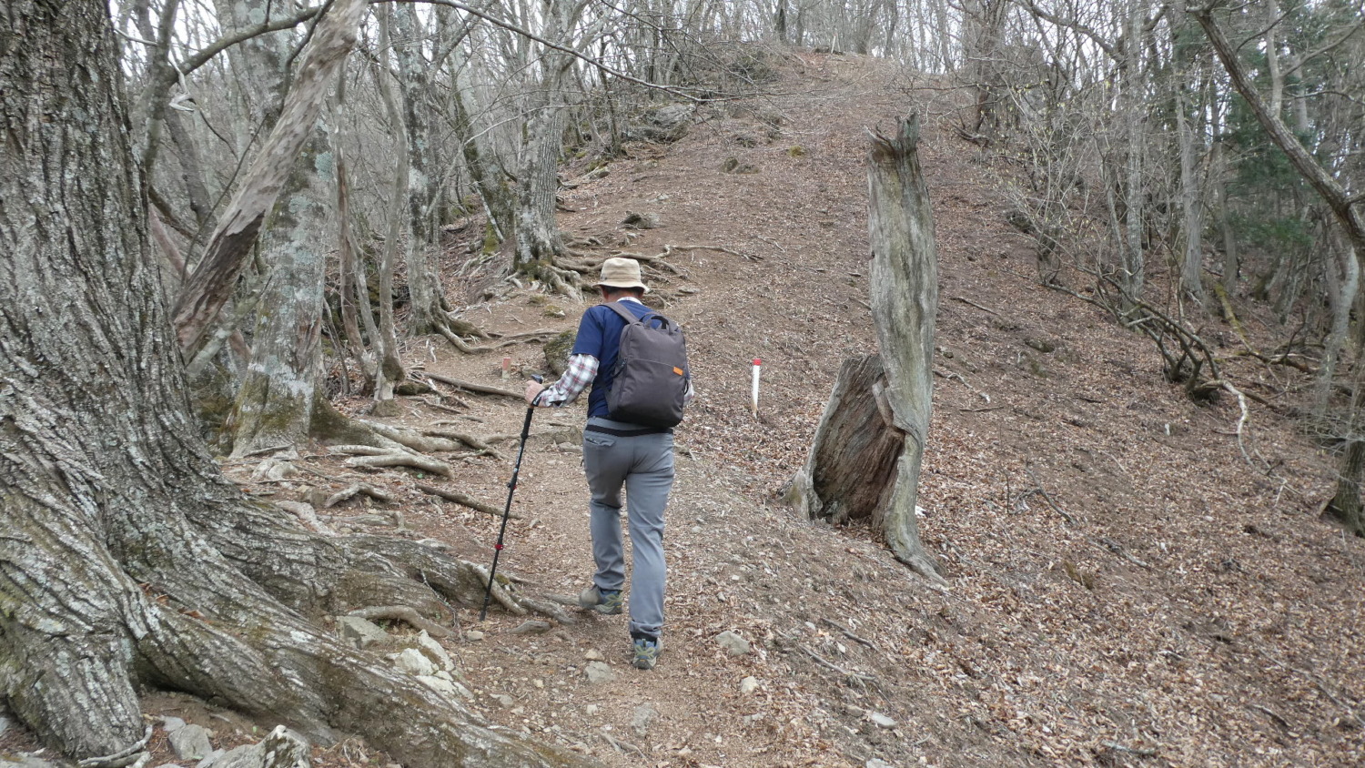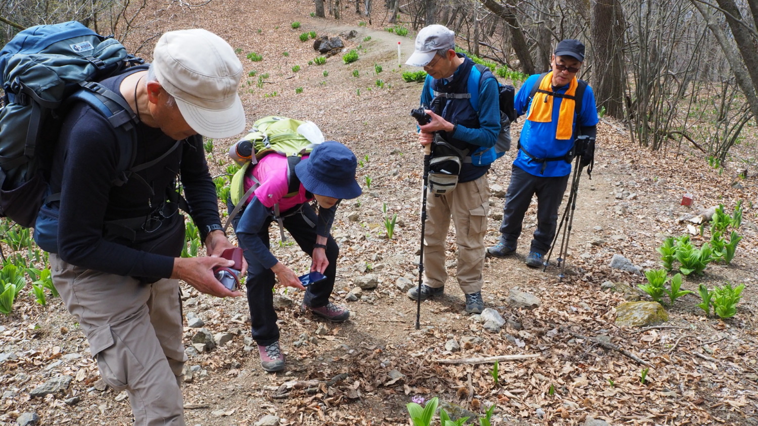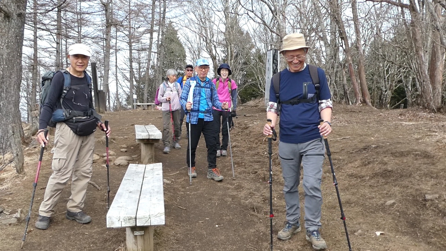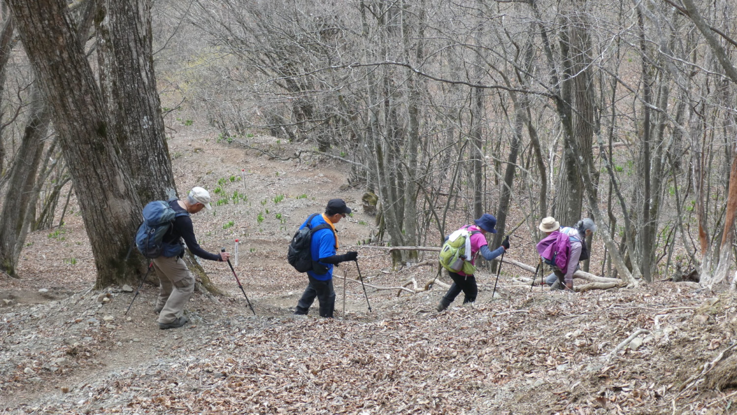 2023年4月山行は、奥多摩三山の御前山で7名の参加でした。JR青梅線奥多摩駅に9:30集合・バスに乗車後、奥多摩湖停車場で下車し記念撮影後、穏やかな陽気の桜道を出発しました。コースは急登が続く難所が多いため、小まめに休憩と水分補給を行いました。惣岳山手前で野生のカタクリや新緑のバイケイソウ・ハシリドコロの群生を見て一息&気分転換できました。初級者コースとは思えない急登や難所が多くコースタイムは、休憩時間を含め7時間5分・距離9.1kmでした。
