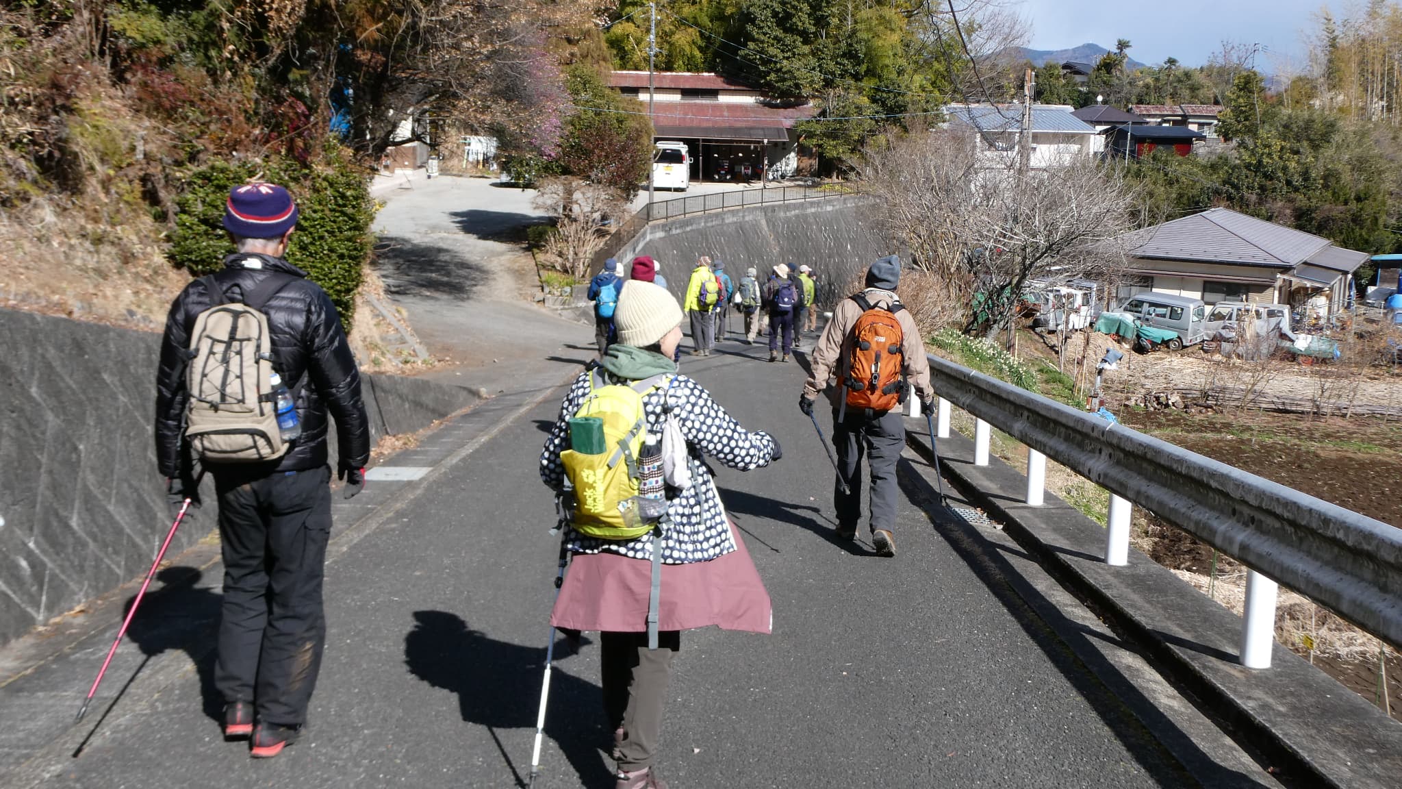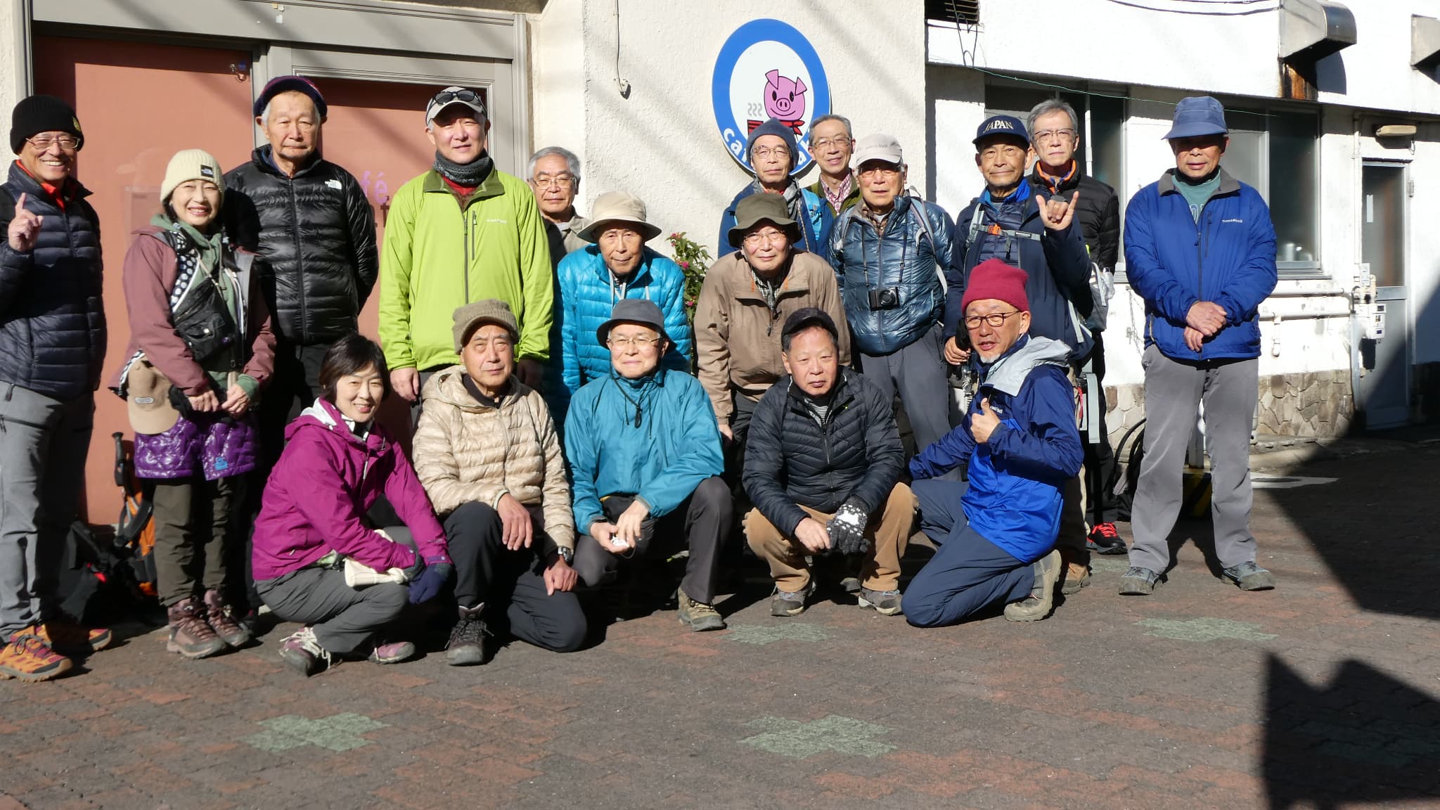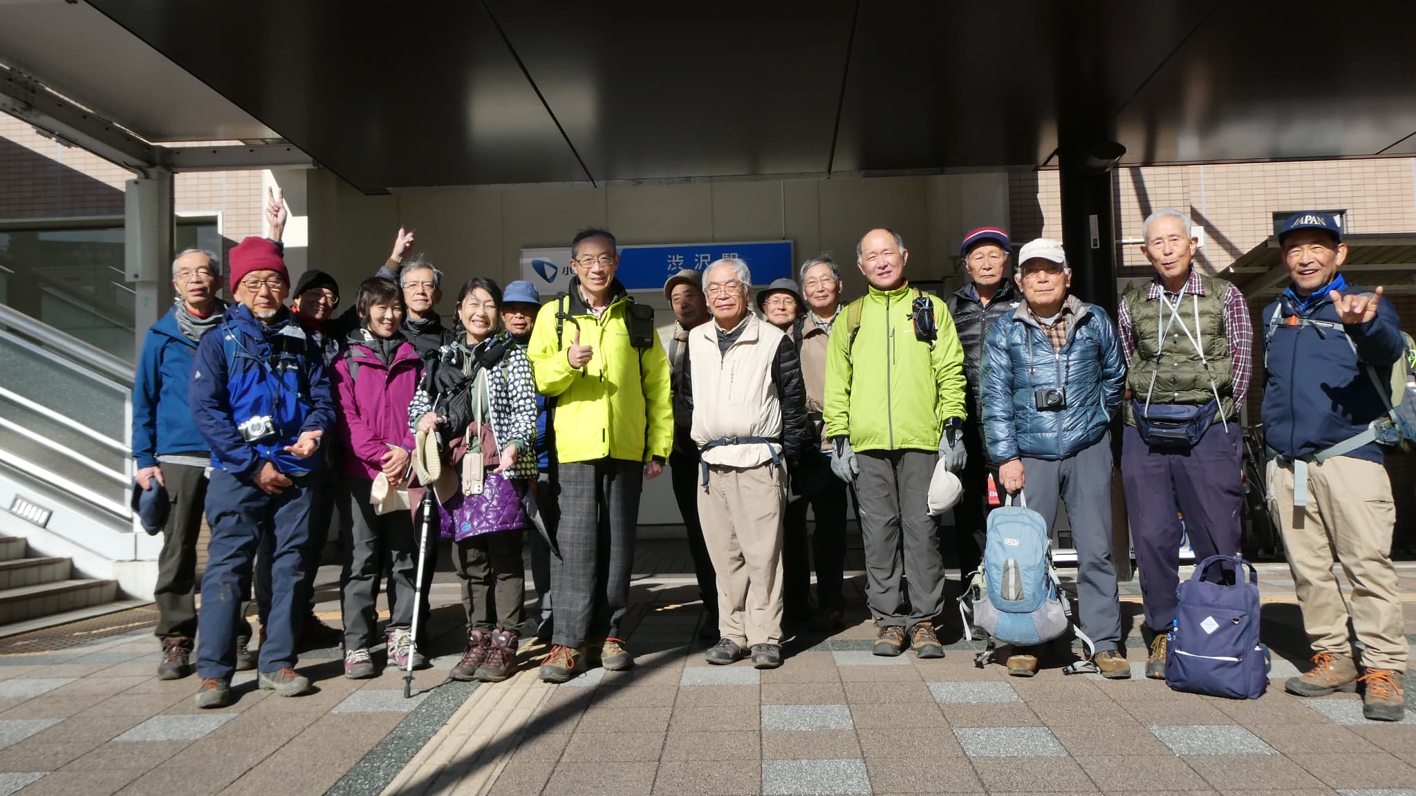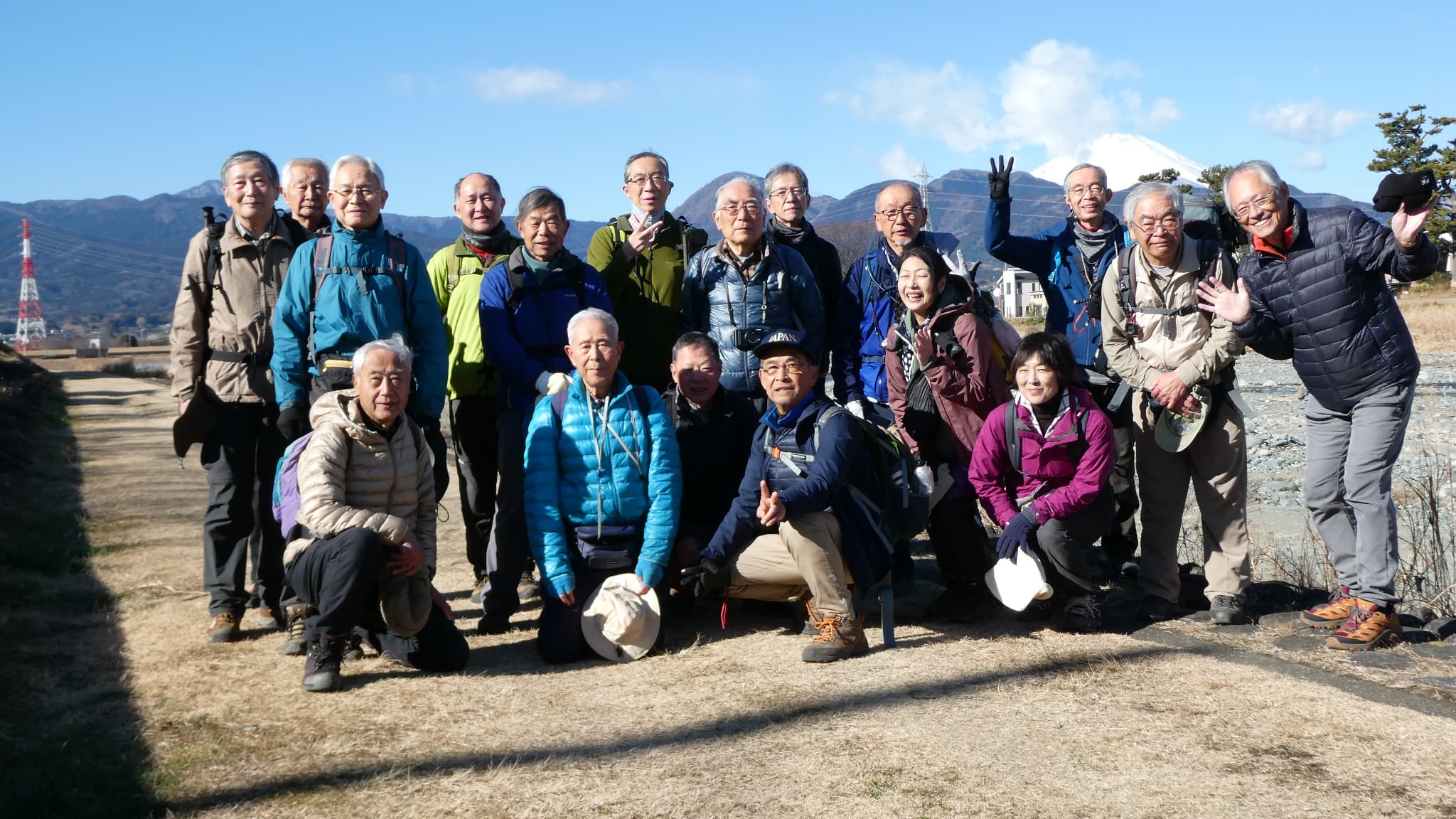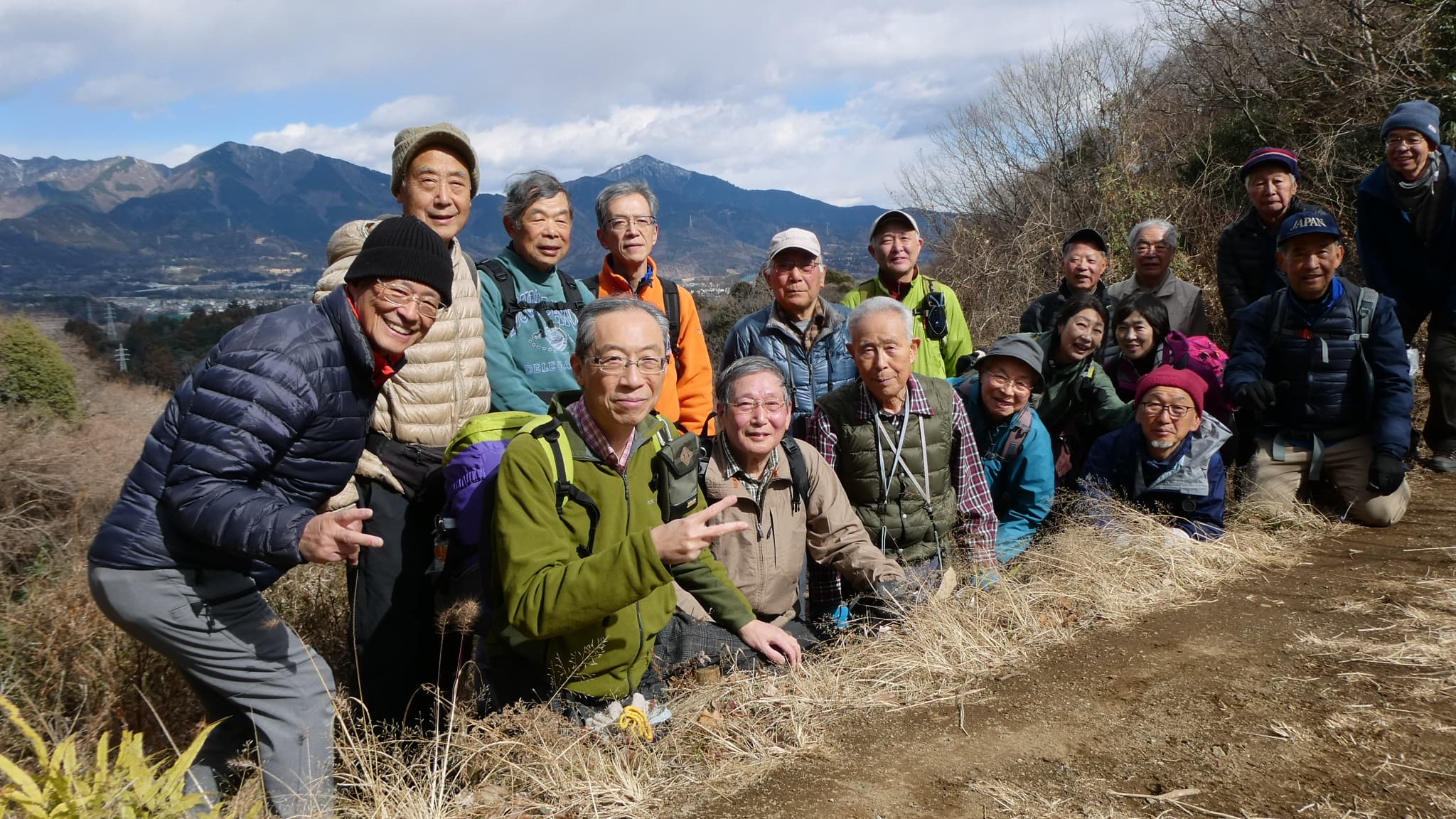 2025年2月山行は「大井・渋沢丘陵」で参加者は今年度最大の18名。小田急新松田駅に9:15に集合し、駅前広場で初参加者紹介・準備体操・行程説明・記念撮影後9:24に出発しました。この冬一番の寒波襲来と言われましたが、気温3度で風もあまりなく快晴の空のもと賑やかにスタートです。