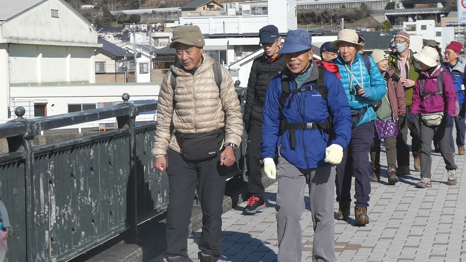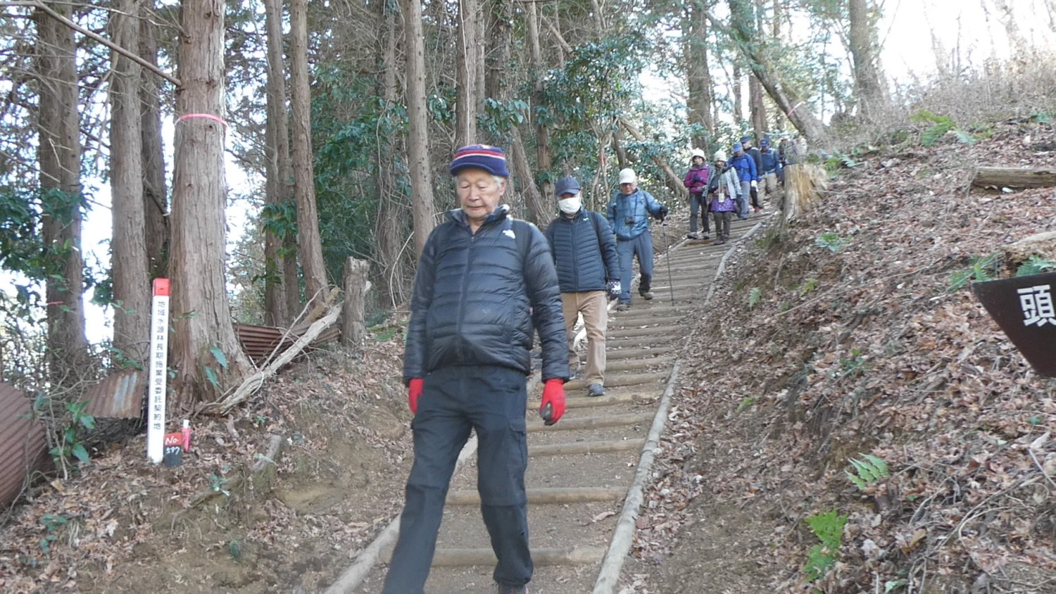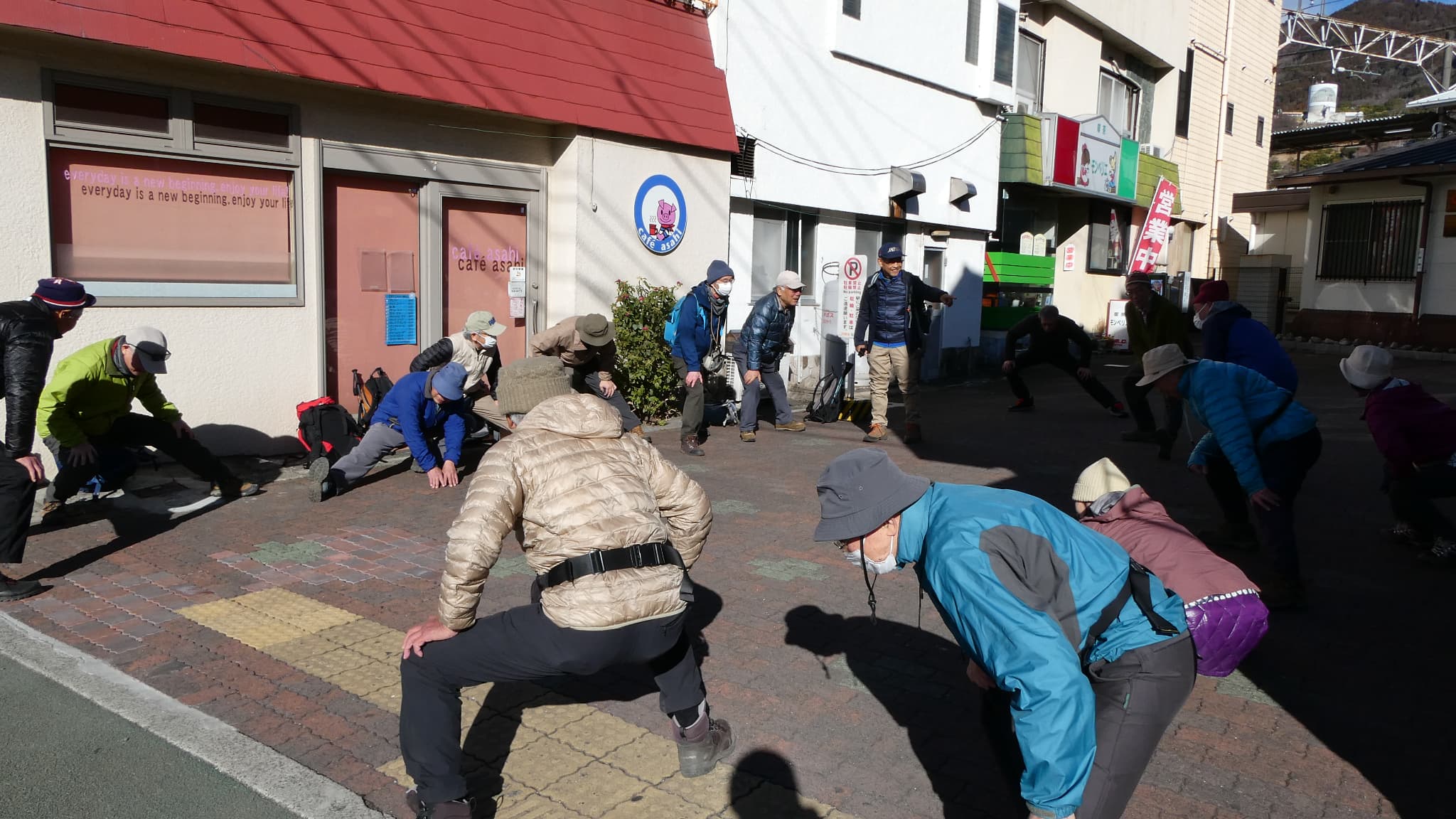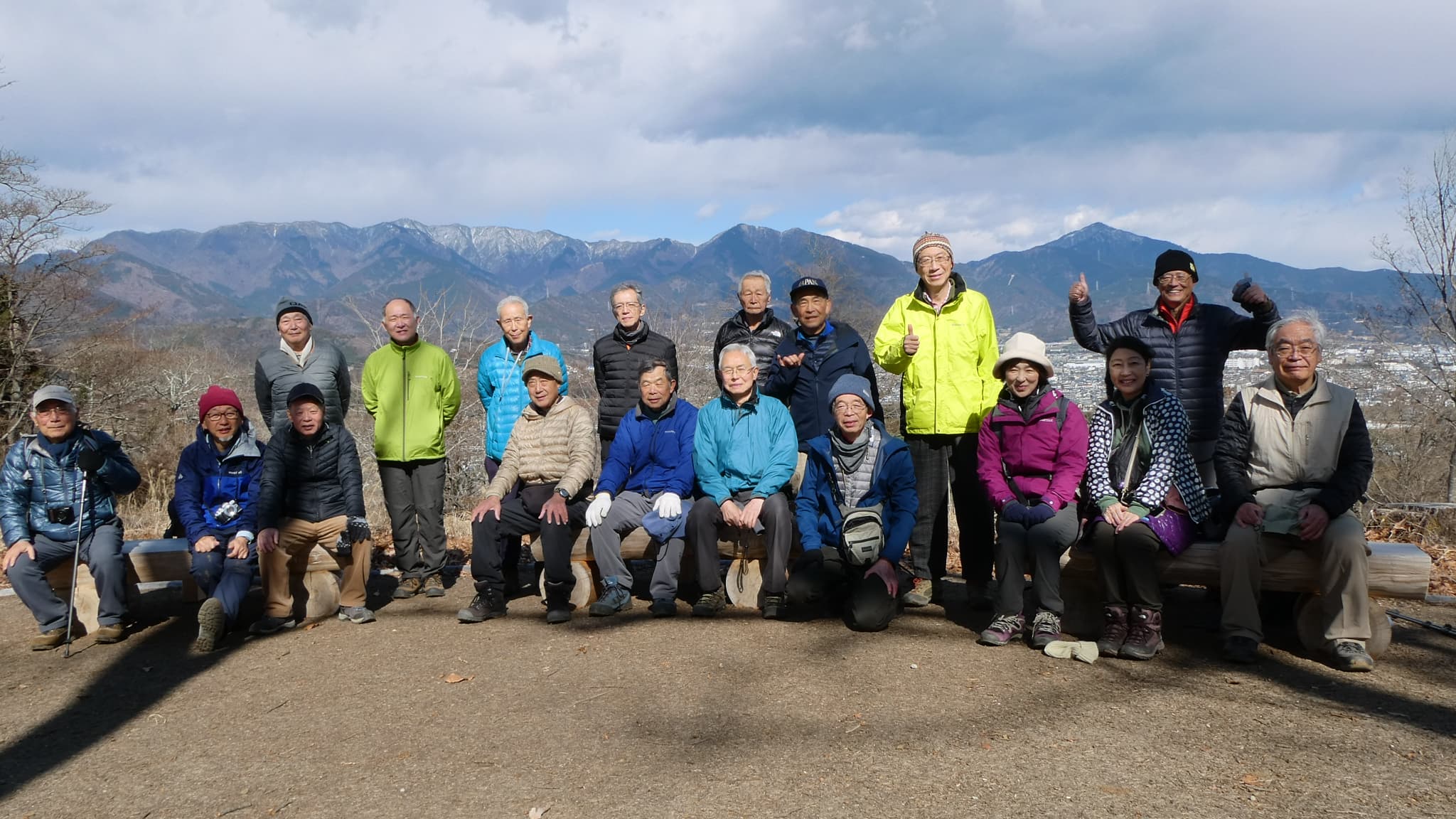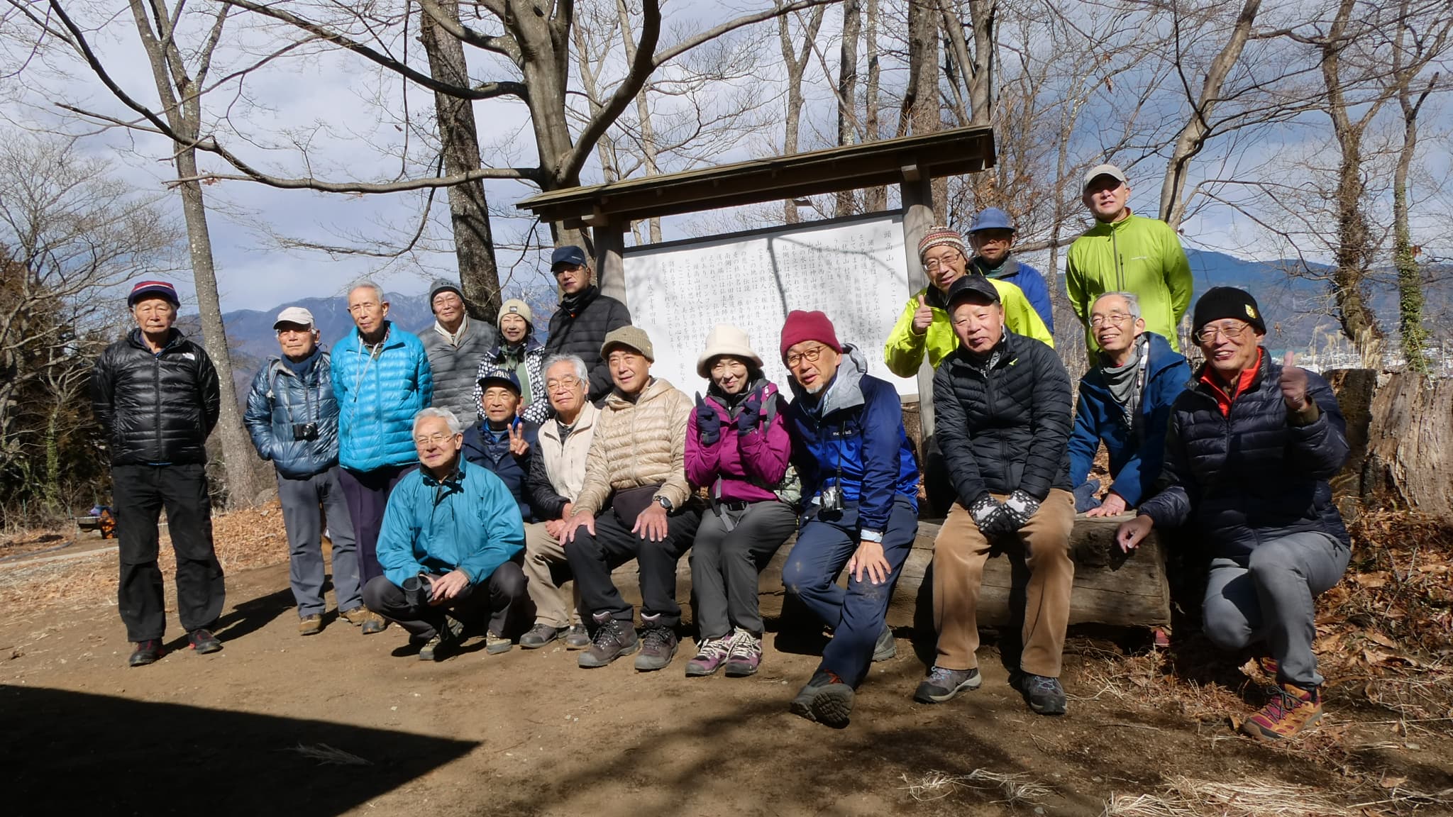 2025年2月山行は「大井・渋沢丘陵」で参加者は今年度最大の18名。小田急新松田駅に9:15に集合し、駅前広場で初参加者紹介・準備体操・行程説明・記念撮影後9:24に出発しました。この冬一番の寒波襲来と言われましたが、気温3度で風もあまりなく快晴の空のもと賑やかにスタートです。