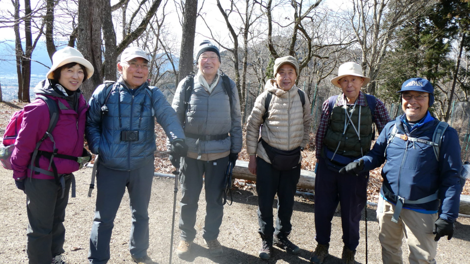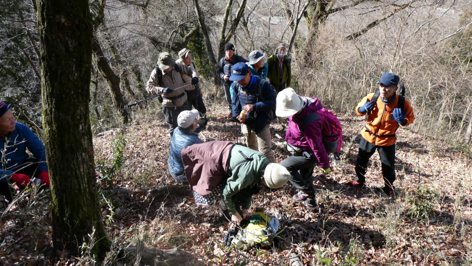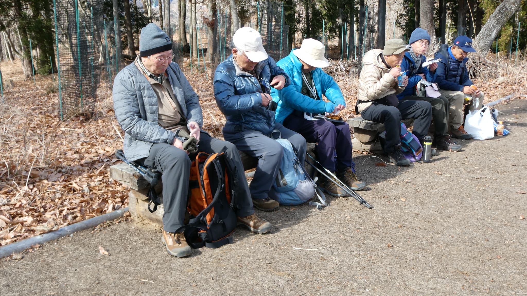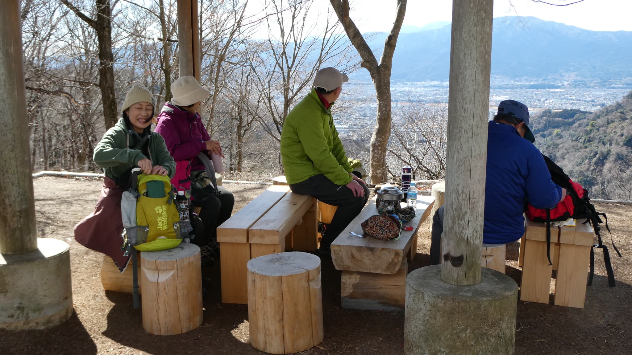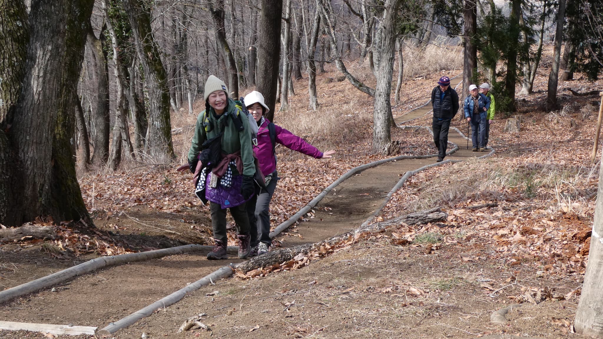 富士山がくっきりと見えていたので、登山口までの経路を変更し川音川の土手を歩き姿を楽しみました。登山口の入口付近が荒れていたことも有り神山滝経由で登山道へ入ったので、いきなり急登となりました。その後も松田からの経路は使う人が少ないのか、倒木が残されたままだったり、案内も少なく、GPSマップを注意深く見な進みます。頭高山休憩所へ出ると一気に景色が開け、丹沢表尾根の山々が目の前に広がります。休憩所近辺には、水仙や椿・蝋梅などの花が咲いており、4月には八重桜も楽しめる様です。更に15分ほど登った頭高山頂上は広場になっており、丹沢表尾根方面だけでなく松田・箱根方面の見晴らしも良く、椅子等も整備されており昼食休憩には最適でした。