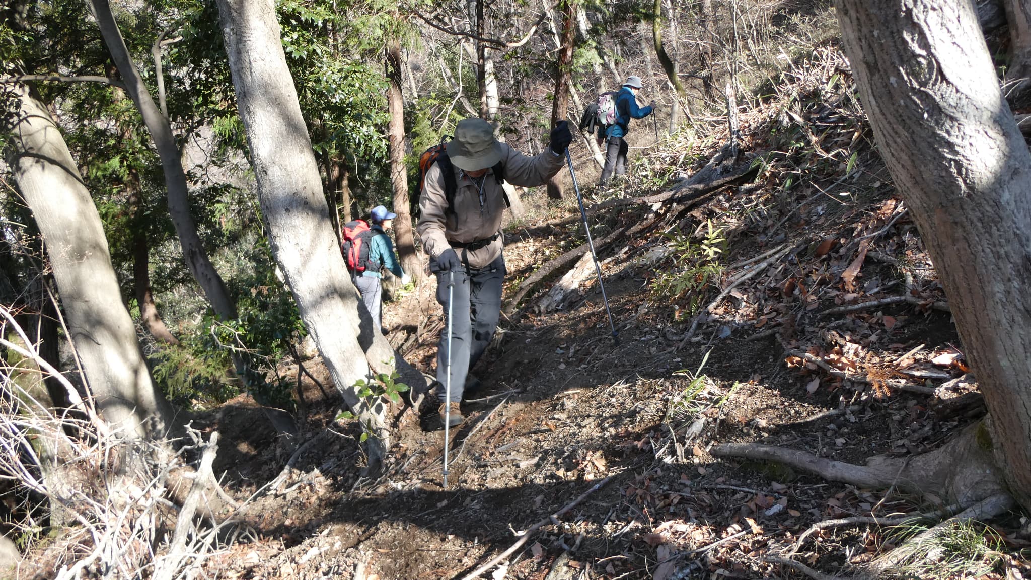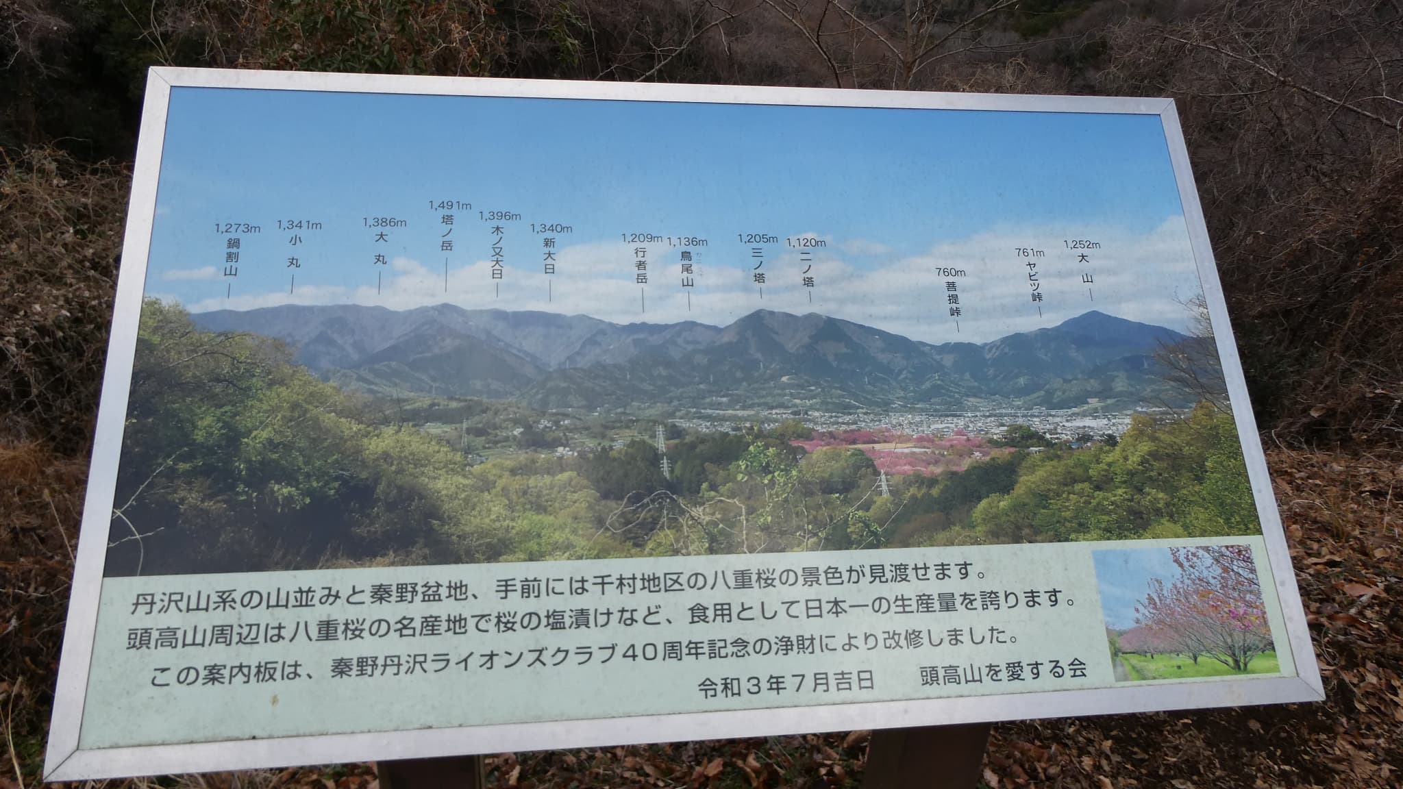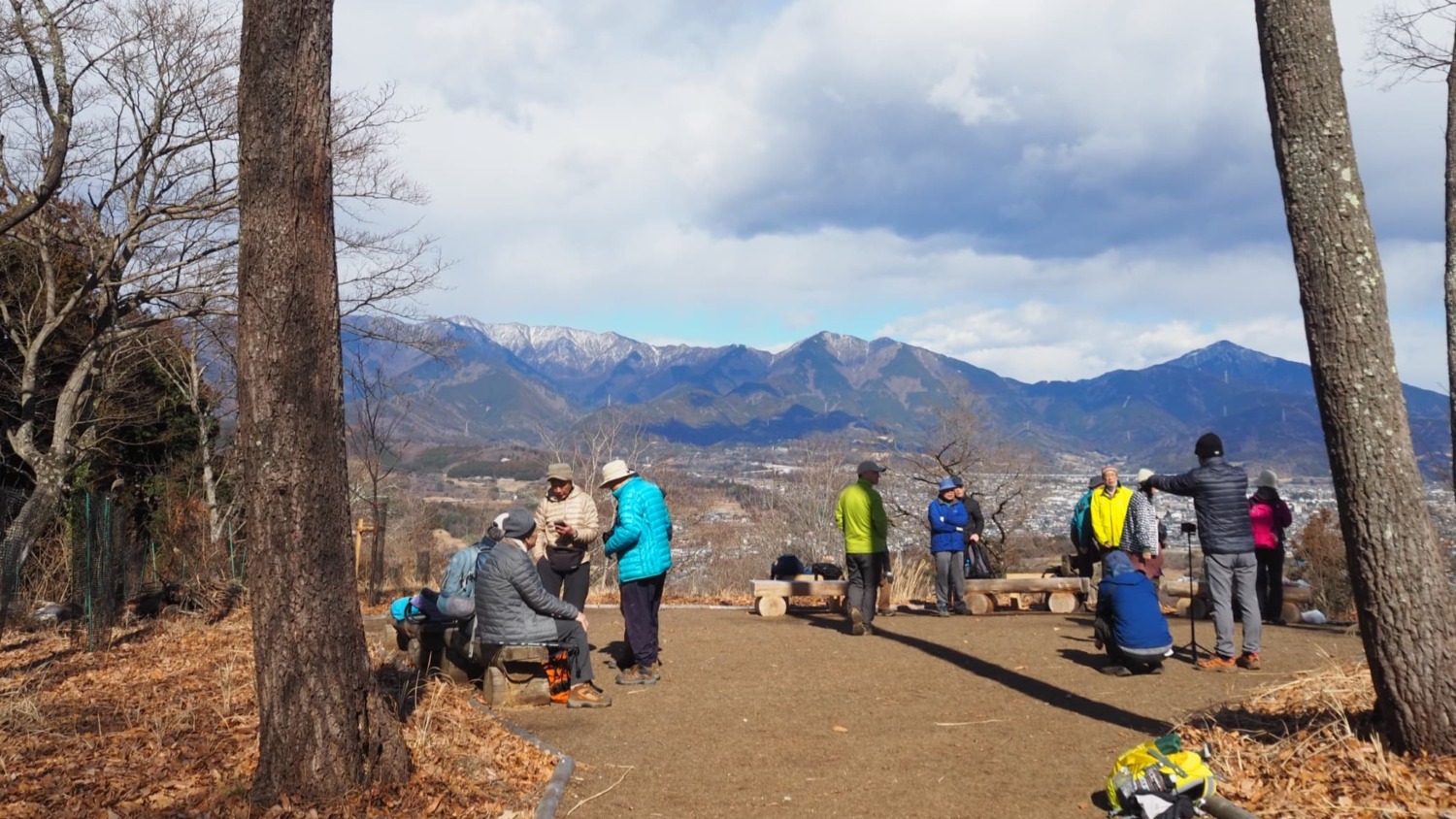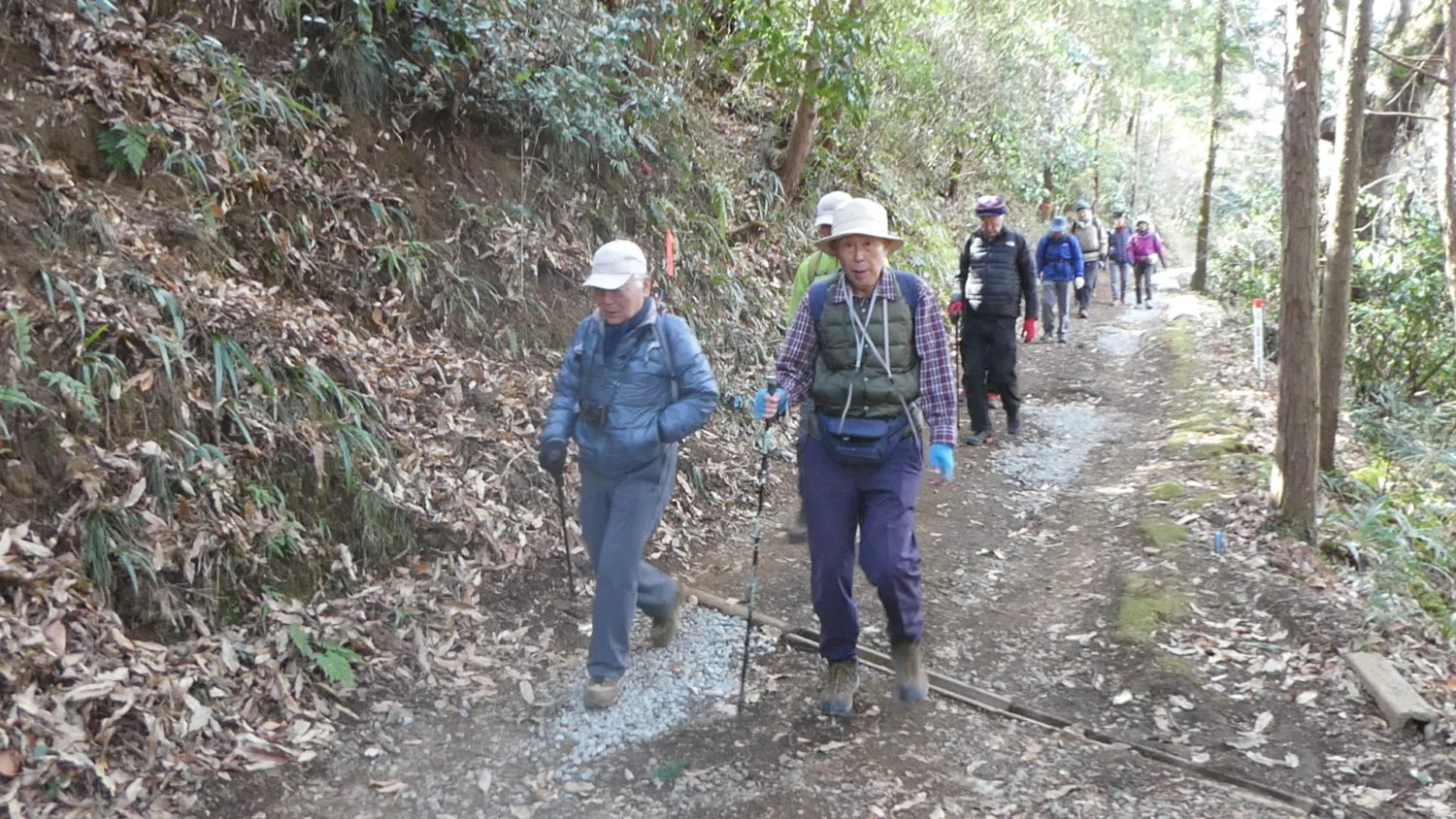 富士山がくっきりと見えていたので、登山口までの経路を変更し川音川の土手を歩き姿を楽しみました。登山口の入口付近が荒れていたことも有り神山滝経由で登山道へ入ったので、いきなり急登となりました。その後も松田からの経路は使う人が少ないのか、倒木が残されたままだったり、案内も少なく、GPSマップを注意深く見な進みます。頭高山休憩所へ出ると一気に景色が開け、丹沢表尾根の山々が目の前に広がります。休憩所近辺には、水仙や椿・蝋梅などの花が咲いており、4月には八重桜も楽しめる様です。更に15分ほど登った頭高山頂上は広場になっており、丹沢表尾根方面だけでなく松田・箱根方面の見晴らしも良く、椅子等も整備されており昼食休憩には最適でした。