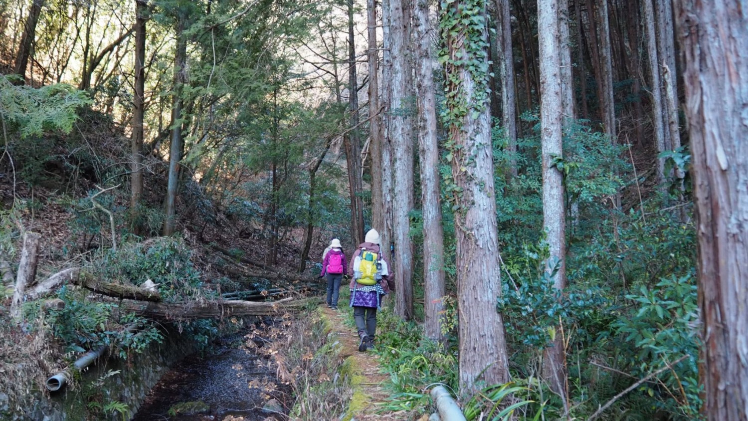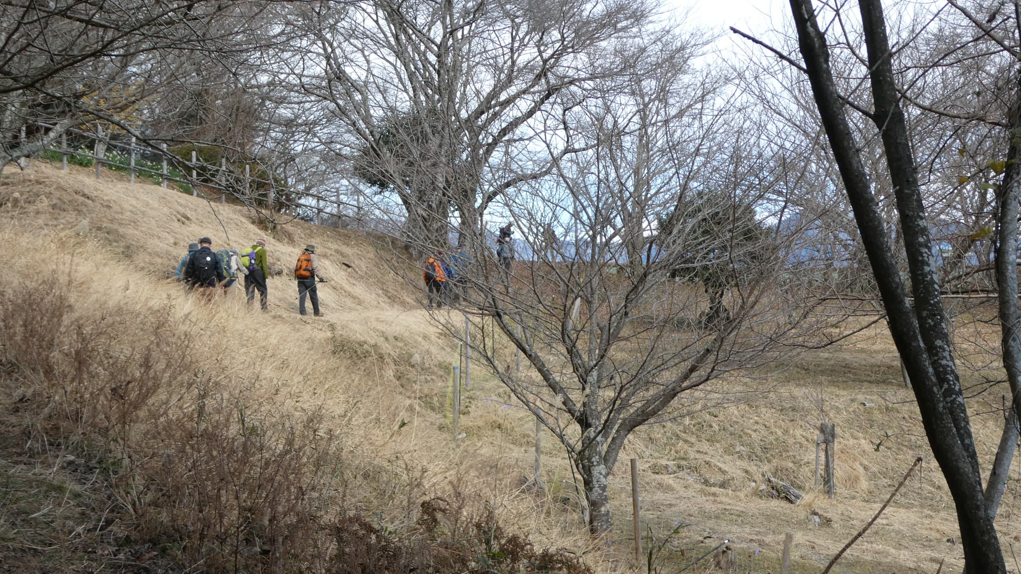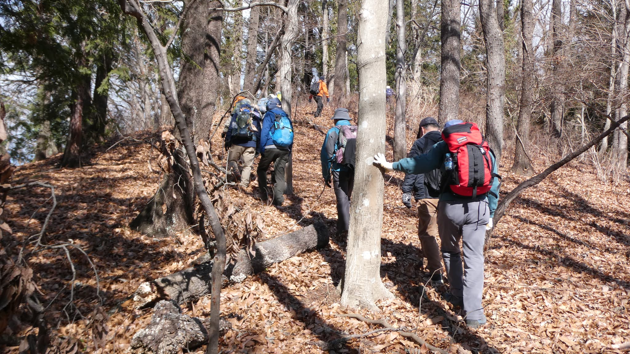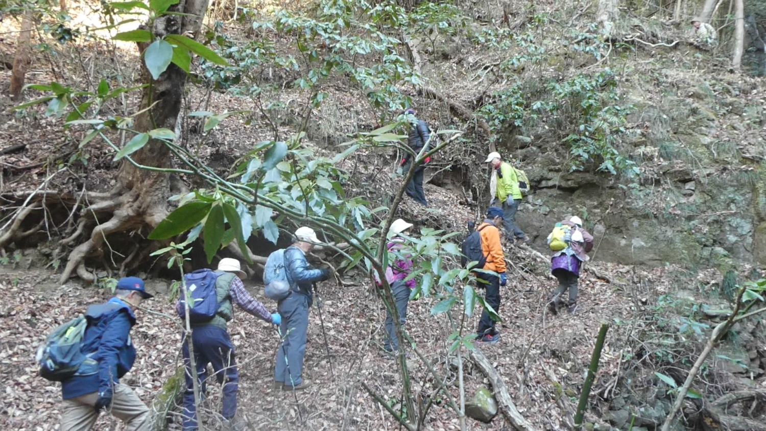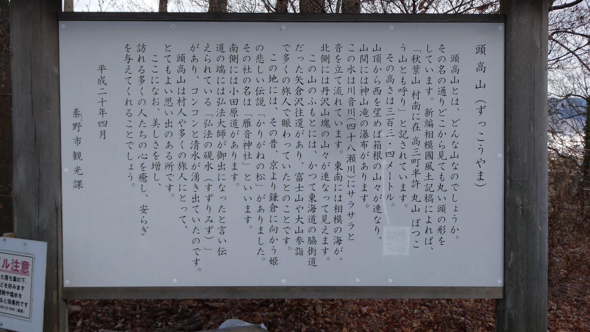富士山がくっきりと見えていたので、登山口までの経路を変更し川音川の土手を歩き姿を楽しみました。登山口の入口付近が荒れていたことも有り神山滝経由で登山道へ入ったので、いきなり急登となりました。その後も松田からの経路は使う人が少ないのか、倒木が残されたままだったり、案内も少なく、GPSマップを注意深く見な進みます。頭高山休憩所へ出ると一気に景色が開け、丹沢表尾根の山々が目の前に広がります。休憩所近辺には、水仙や椿・蝋梅などの花が咲いており、4月には八重桜も楽しめる様です。更に15分ほど登った頭高山頂上は広場になっており、丹沢表尾根方面だけでなく松田・箱根方面の見晴らしも良く、椅子等も整備されており昼食休憩には最適でした。
