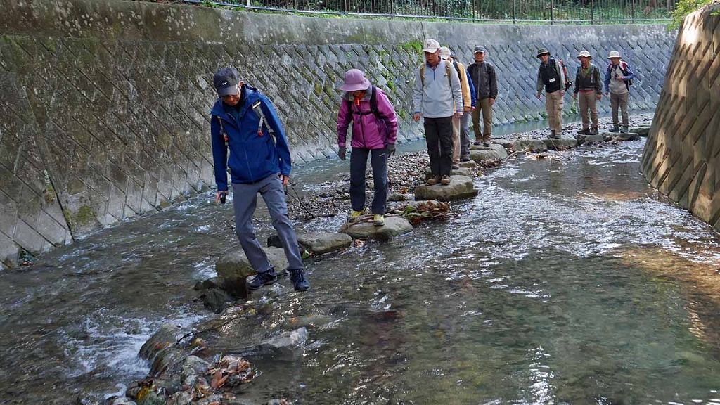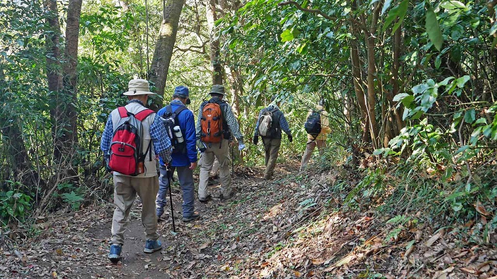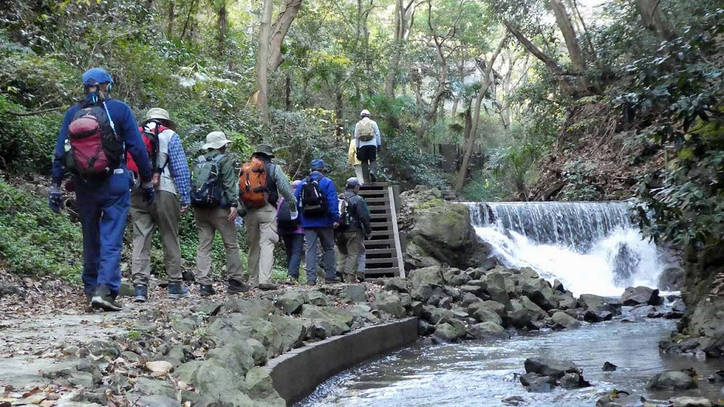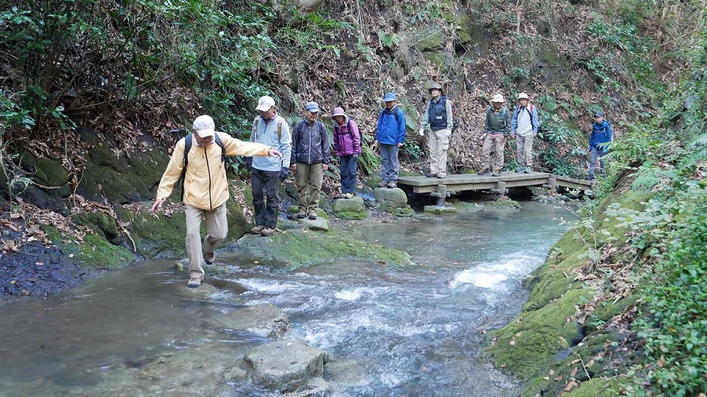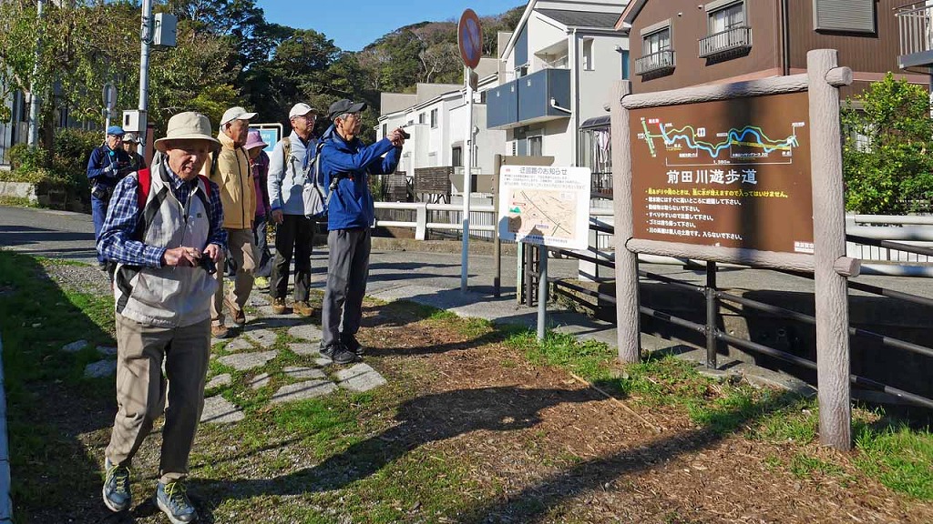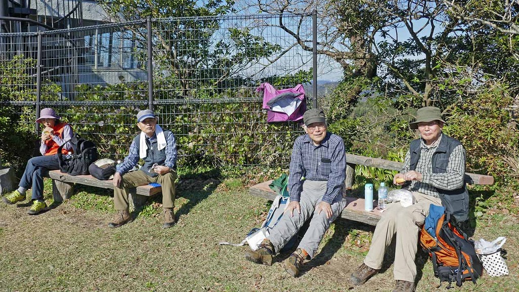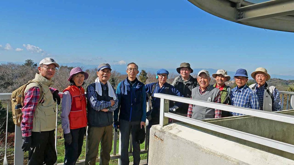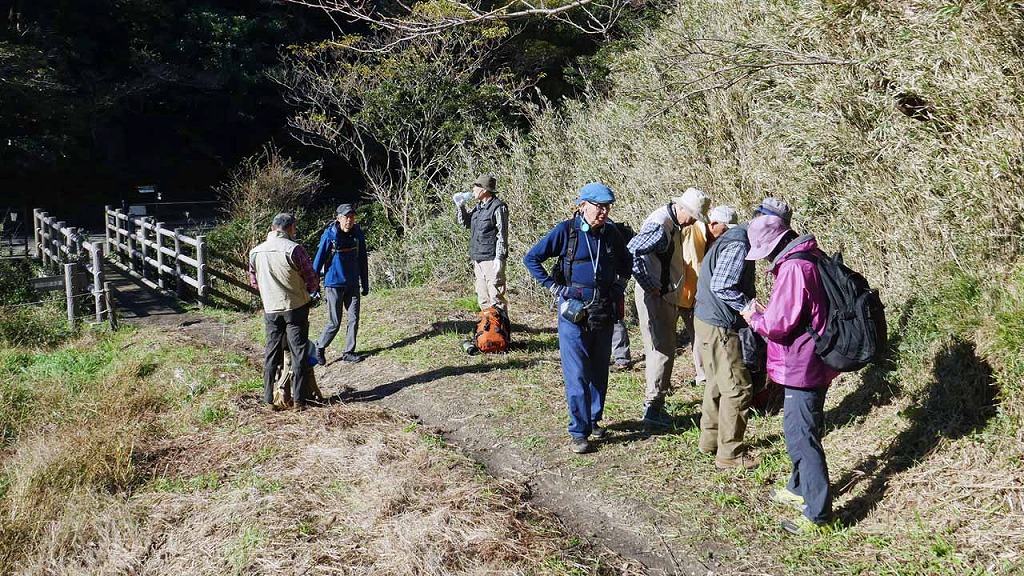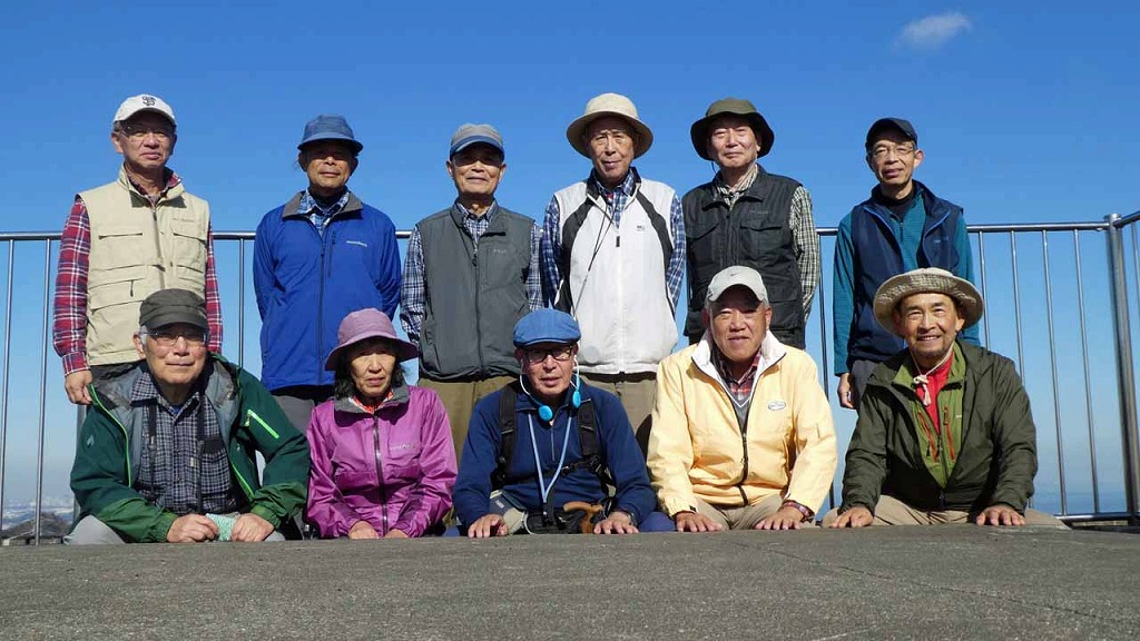 12月4日(水)JR横須賀線・逗子駅に集合(参加人数11名)、路線バスに乗り「前田橋」バス停まで移動し山行を開始しました。前田川の渓谷に沿って設けられた「前田川遊歩道」を進んで大楠山ハイキングコース入口に向かい、入口からは大楠山への登山道を登り山頂をめざしました。途中、<大楠山レーダ雨量観測所>の展望台に上って大展望を楽しんだ後、大楠山山頂に到着しました。