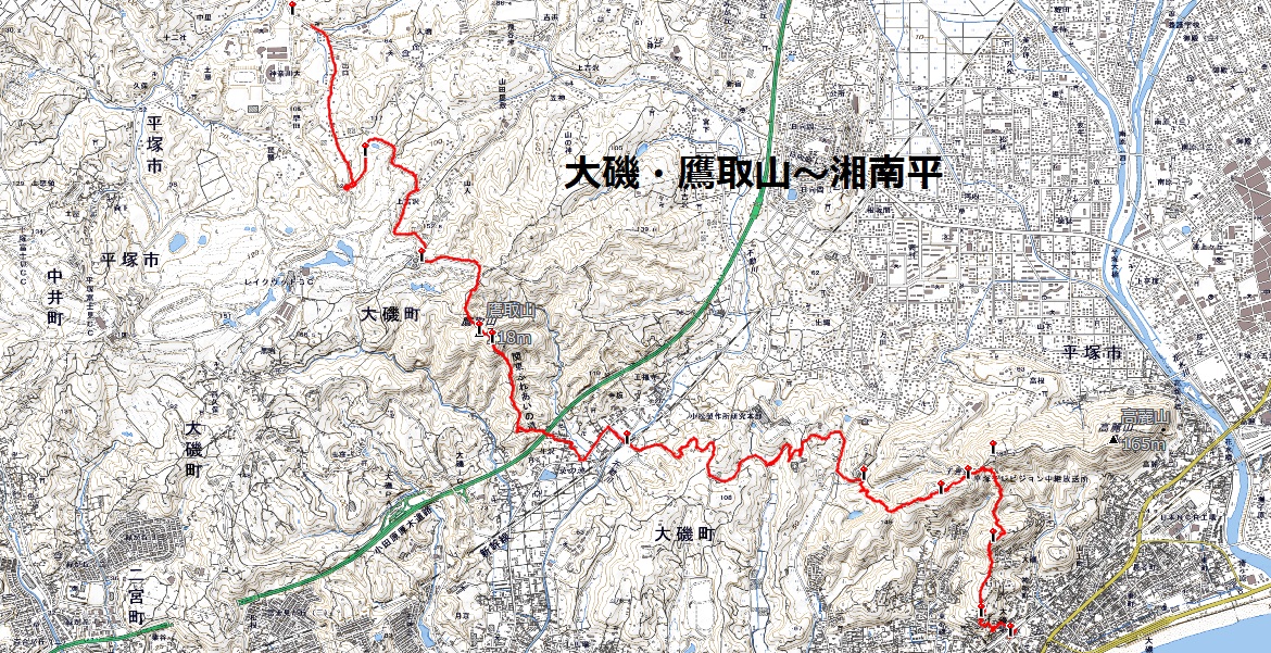秦野駅(8:50)<バス>神奈川大学BS(9:14)<山行開始>→鷹取神社(10:40)→大磯運動公園分岐(11:50)→湘南平登山口(12:20)→湘南平(12:40ー13:40 昼食)→大磯駅(14:20 解散) ★予定コースタイム:5時間(高低差:約180m)