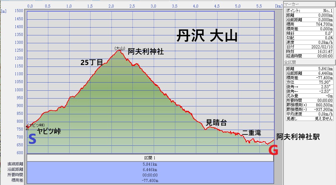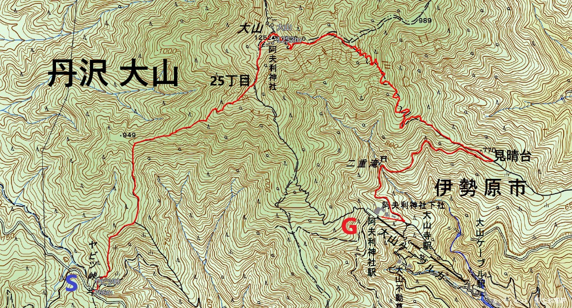 秦野駅BS(8:25)<バス>ヤビツ峠(9:13)→25丁目(10:45) →阿夫利神社(11:30ー12:00 昼食)→みはらし台(13:00ー13:15)→阿夫利神社下社★(14:00)<徒歩下山>→大山ケーブルBS(15:00)解散 ★予定コースタイム:5時間(高低差:約600m)