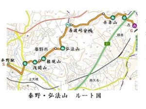 秦野駅(10:30)→弘法山公園入口(10:50)→浅間山(11:20)→権現山(11:40)→弘法山(12:10~12:40(昼食))→善並峠(13:00)→吾妻山(13:40)→弘法の里湯(14:00)