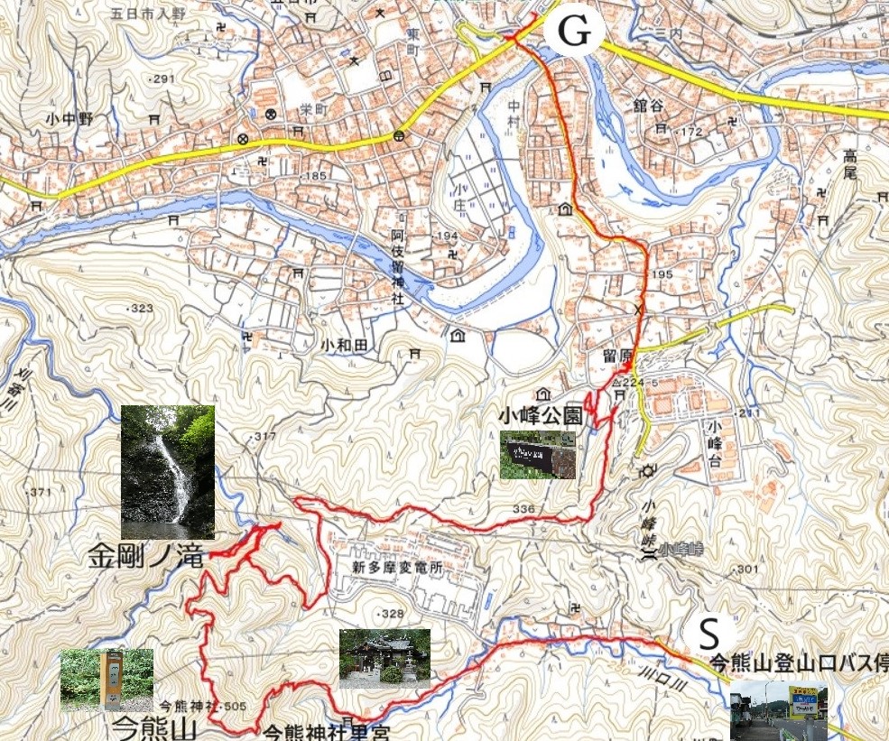 八王子北口BS (9:50) → 今熊山登山口BS(10:30)→今熊神社里見 (11:00)→今熊山(11:50~12:20(昼食))→ 金剛ノ滝(13:10)→小峰公園(14:00~14:20)→ 武蔵五日市駅(14:50) 解散