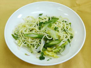 - 新キャベツ、新玉葱、アスパラガスのスパゲッティ