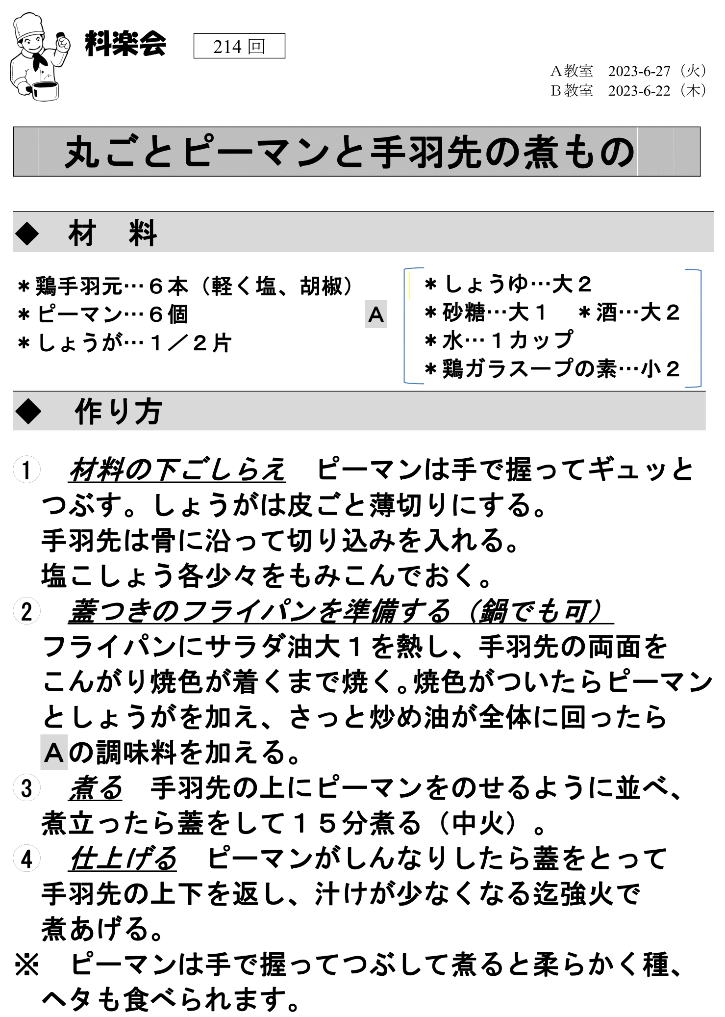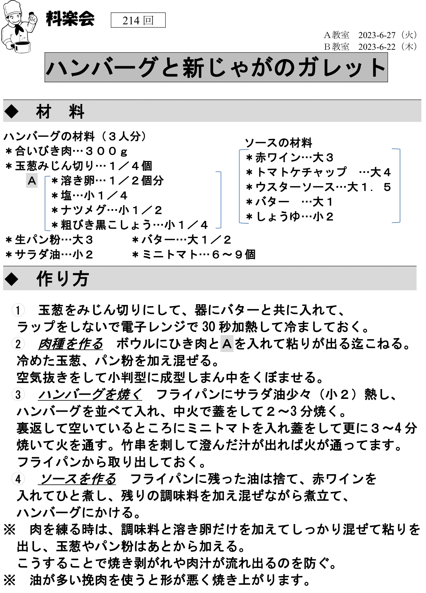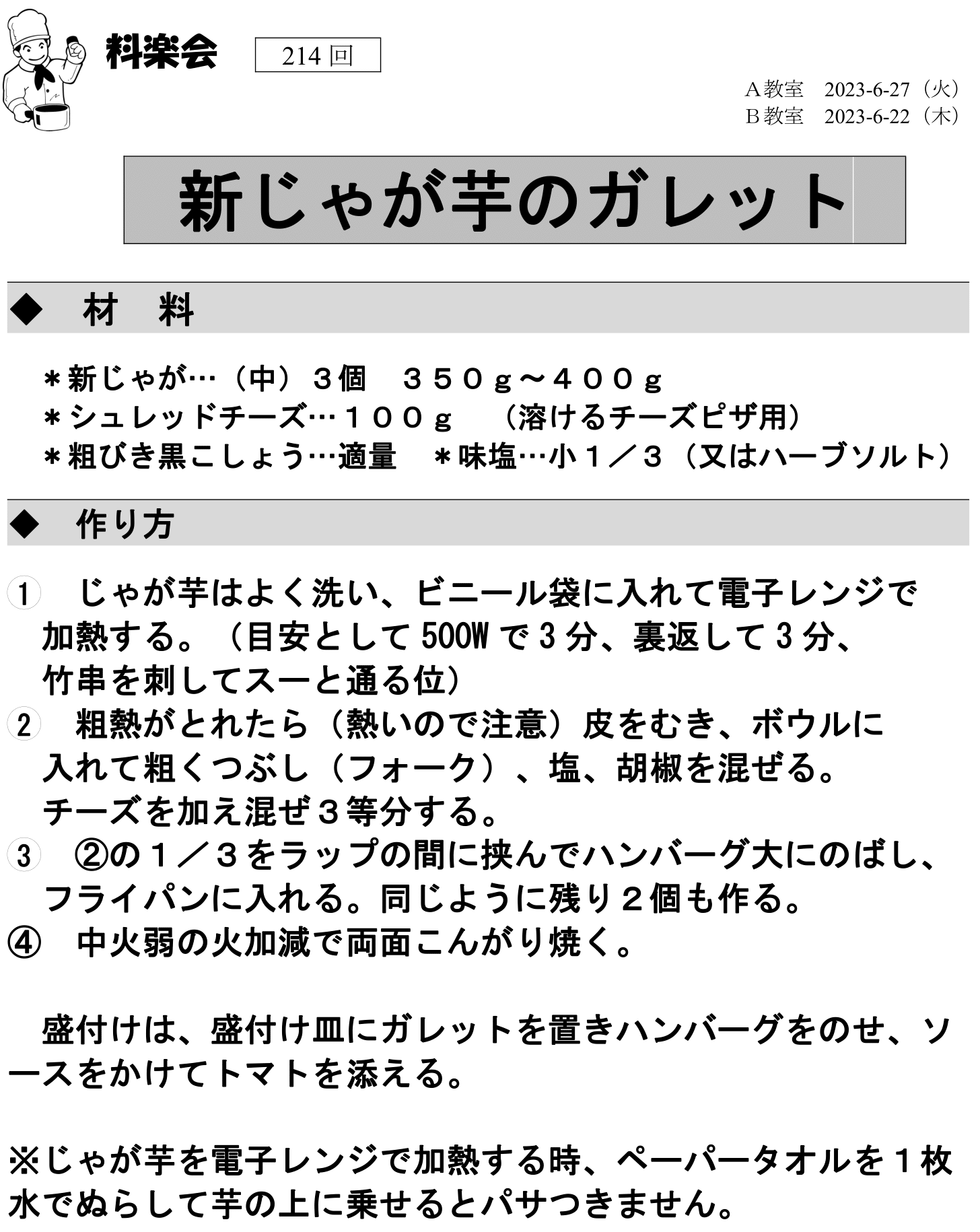 次回の料理教室(8月度)はA教室 8/22(火)、B教室 8/24(木)です