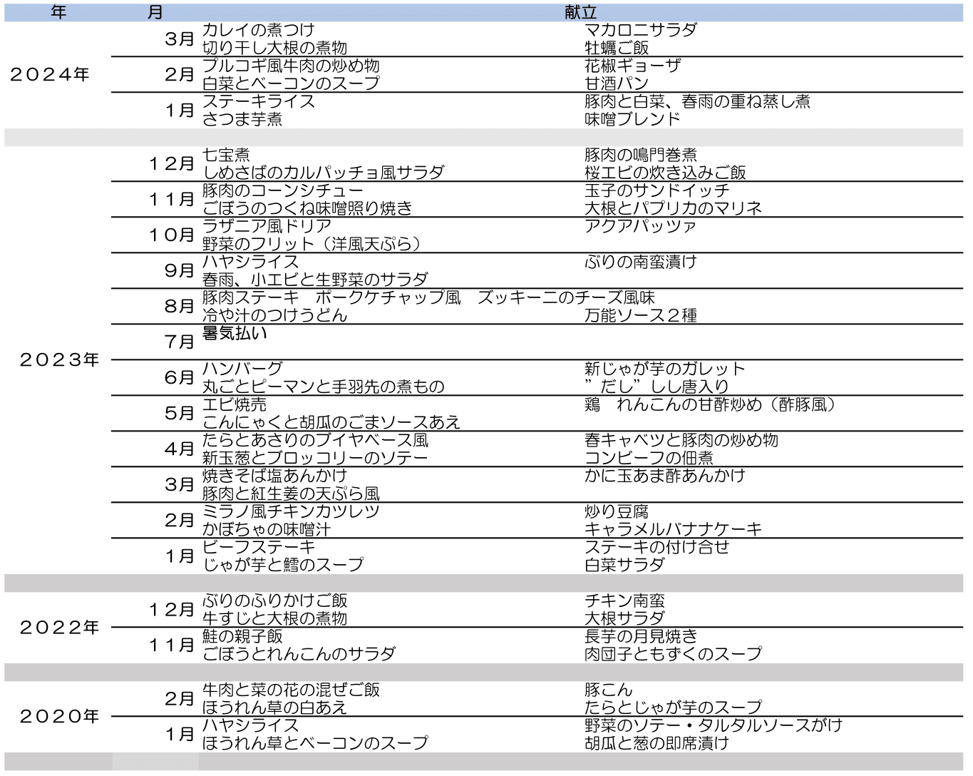 毎回、簡単な家庭料理(和、洋、中華、アラカルト)を3~4品程度作ります。
