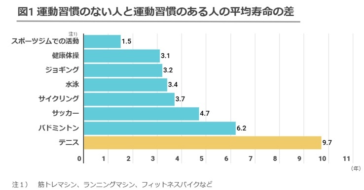 コペンハーゲン調査の結果、寿命を延ばすスポーツの1位はテニス(9.7年)、バドミントン(6.2年)、サッカー(4.7年)、サイクリング(3.7年)、水泳(3.4年)、ジョギング(3.2年)、健康体操(3.1年)、スポーツジム(1.5年)であった。