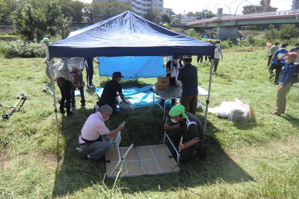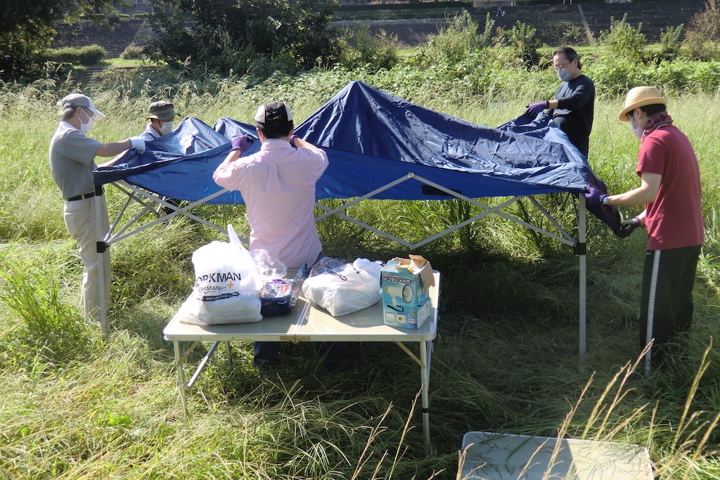 8時半、佐江戸の倉庫に保管中のテントやテーブルなどを軽トラで河川敷に運び込み、さあ、準備スタート。