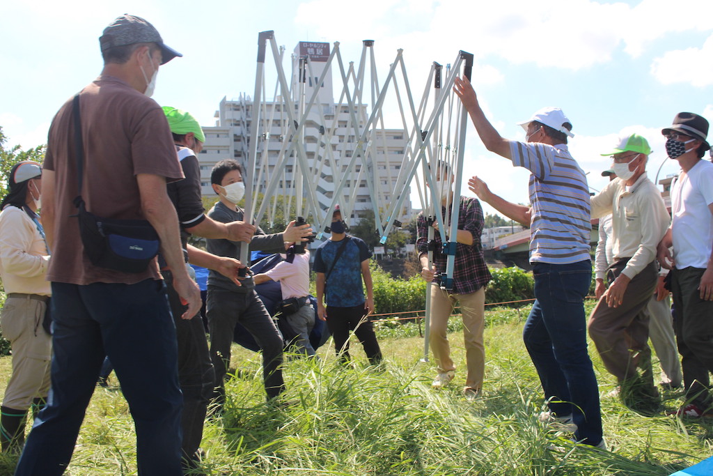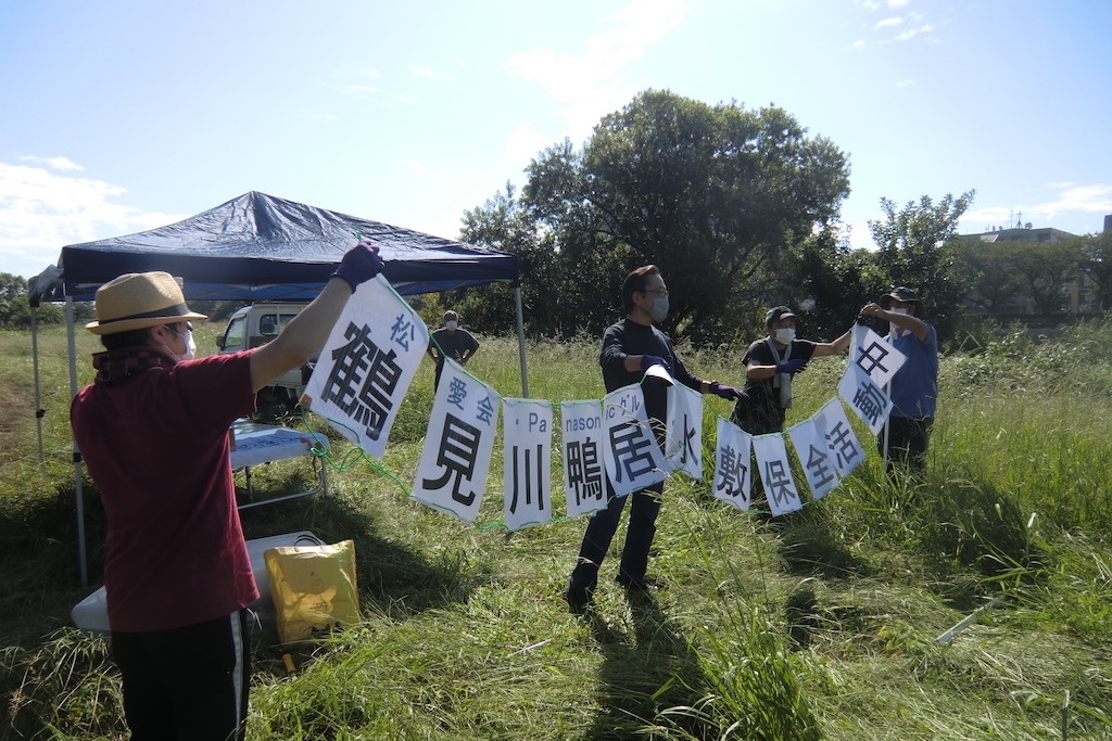 これぞ秋晴れ。天まで届きそうな透き通った青空の鶴見川岸に、春に引き続いて有志のみなさんで集うことができました。コロナ禍収束までもう一息の初秋、今回も十分な感染防止対策を施した上で、4ヶ月ぶりの開催となりました。